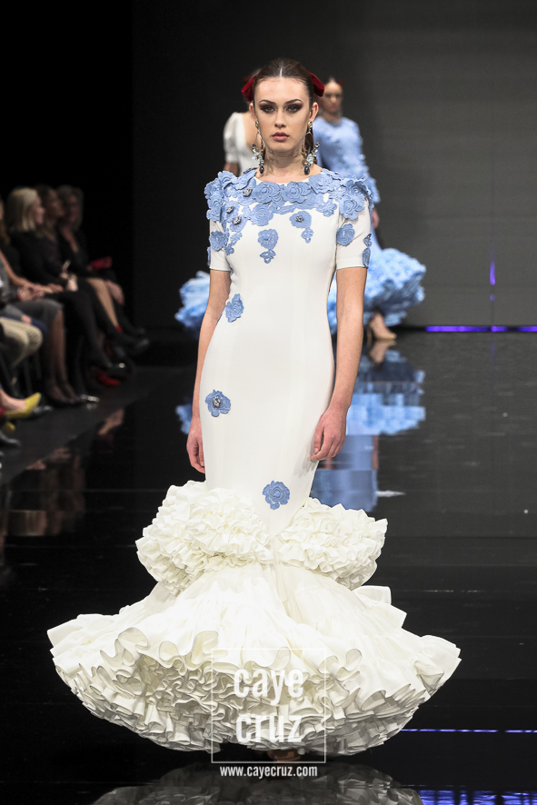 Ernesto Sillero ha hecho en este 2018 una conjugación entre su color fetiche y el que, al mismo tiempo, lleva generaciones acompañando a su hermandad. El blanco es el protagonista absoluto de la colección en la que el diseñador lebrijano ha ido salpicando a sus flamencas con detalles propios de la Hermandad. Y se los enumero: las flores y la tonalidad de rojo son exactamente las mismas que adornan el monte y la canastilla del paso de Cristo. El celeste remite al día en contraposición a la noche (la Hermandad hace gala de su horario diurno) así como al color de capas y antifaces. El dorado sobre blanco es lo que siempre ha caracterizado a la Virgen de Consolación (ahora más desde que luce el manto bordado) y los bordados, aplicaciones o pequeños detalles que salpican los trajes remiten a esos momentos de la mañana del viernes que son especiales en Lebrija, a ese mediodía que contrasta en un pueblo que es centro y es barrio o a unos vecinos que se visten de gala para llenar la calle Tetuán.