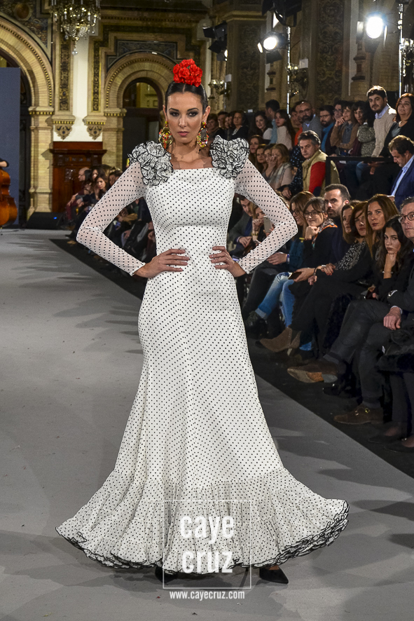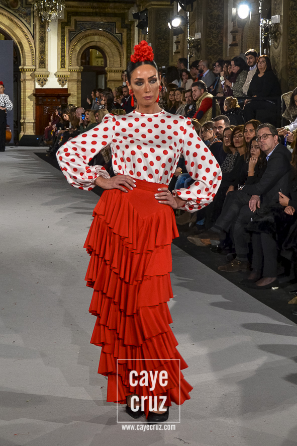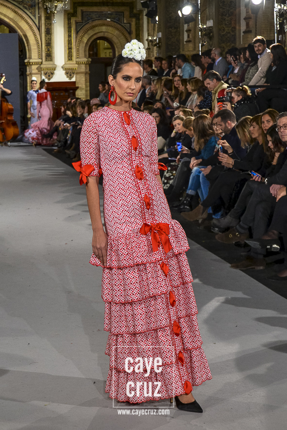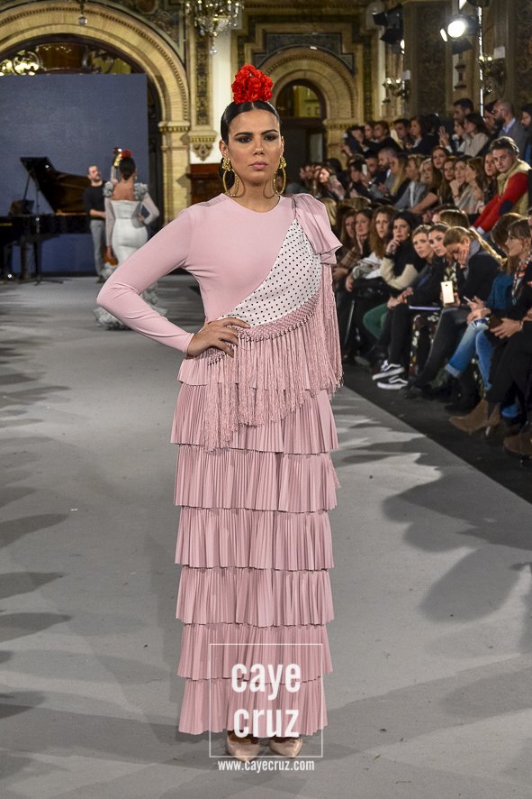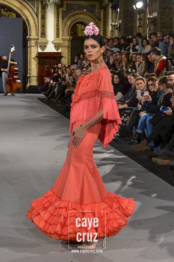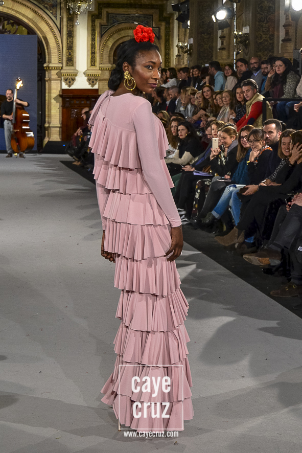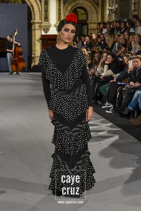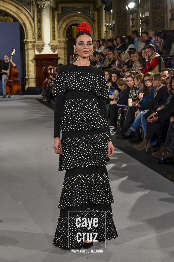 La que elija ser flamenca de José Hidalgo debe de tenerlo claro: su entorno natural es la Feria de Abril de Sevilla. Su lugar, por derecho, es estar en esa caseta de un módulo, de perímetro estrecho pero alargado, de luces cálidas, decoración profusa, mesas y sillas pintadas o una etiqueta estética cuidadosamente llevada.
