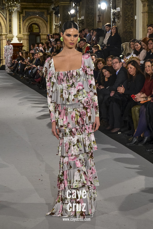 Es la mirada coherente que se atisba desde los primeros acordes de ‘Sevillanas‘, una colección donde se desarrollan a partes iguales un comienzo en clara referencia a los noventa (si, los perforados y las cintas pueden darnos grandes momentos), una segunda parte donde el diseñador consolida el estilo delicado y chic que le caracteriza o un final donde se fusiona precisamente la personalidad de Hidalgo con la flamencura clásica. Tres actos donde la cohesión de la propuesta va llevándonos por una suerte de Feria de Abril en el que la elegancia de una flamenca no tan flamenca pero muy flamenca (sic) describe una estampa nueva y costumbrista, adaptada al gusto de una sevillana (la mujer, ojo) que pisa el Real de una manera diferente: entre volantes, entre lunares, entre flores y entre colores que ponen en su sitio a esa corriente que quiere ser ferianta y flamenca escapando de los cánones clásicos pero respetándolos.
