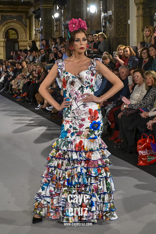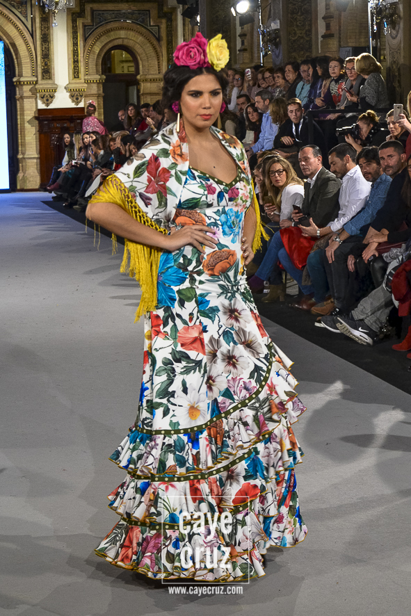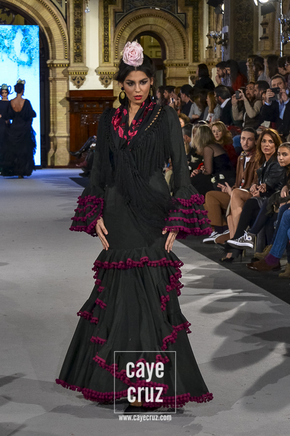 Para 2018 Pepa Garrido nos ofrece las diferentes versiones de su propio universo muy matizadas y, sobre todo, con una paleta de colores muy bien elegida. No abandona el hippyechic que casi siempre envuelve a su flamenca y lo adorna con una mezcla de tonalidades algo circular, pues partiendo del negro se pasa a diferentes combinaciones que desembocan, de nuevo, en el negro y blanco que tan bien funciona en flamenca. Lo hace sin apenas volúmenes pero con un arsenal de volantes bastante generosos, con talles más altos, tejidos con mucha caída y unos colores donde Carmen, directora creativa de la firma, es fiel a su gusto por mezclar tonos fríos de azules o rojos con gamas tostadas de mostaza o verde. Un compendio bien resuelto donde la comodidad de una flamenca que, por momentos busca lo diferente, parece ser la nota dominante.