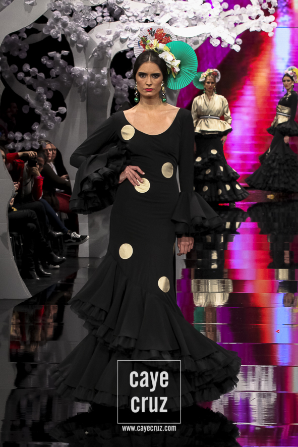 Patricia ha acertado en varios factores. El primero la paleta de colores: si esta es su mejor colección es, entre otros factores, porque ha unido los tonos que mejor le han funcionado en pasarela (pasteles, cálidos o aguamarinas) con aquellos en los que parece sentirse más cómoda (negro, blanco y tonos metalizados). El segundo está en un patronaje de líneas que no se salen del traje de flamenca, de ideas que siguen la tendencia actual, de lunares que salpican los volantes, de flores que recorren los trajes con mucha exquisitez, de gamas cromáticas que saben combinarse y de detalles que introducen de manera leve el vestir japonés. El tercero en recordar que Japón es el ejemplo perfecto de país que sabe unir su pasado con el futuro (hay más de modernidad que de costumbrismo en los trajes). Y, por último, lo más destacado es que la inspiración o leitmotiv de la colección se integra en los diseños como una pieza más, como una prenda que acompaña, pero no condiciona, a unos trajes de flamenca donde quizá la búsqueda de un estilismo elegante haya estado por encima de la fusión cultural.