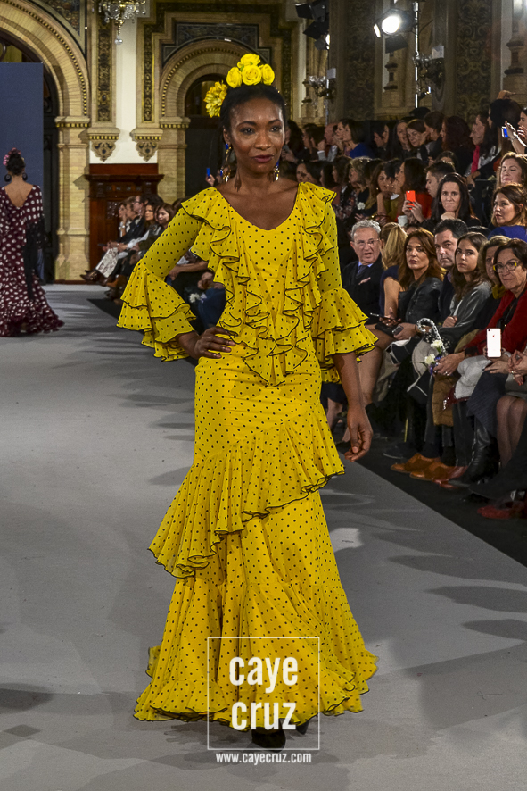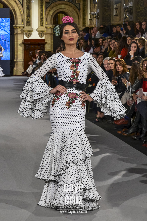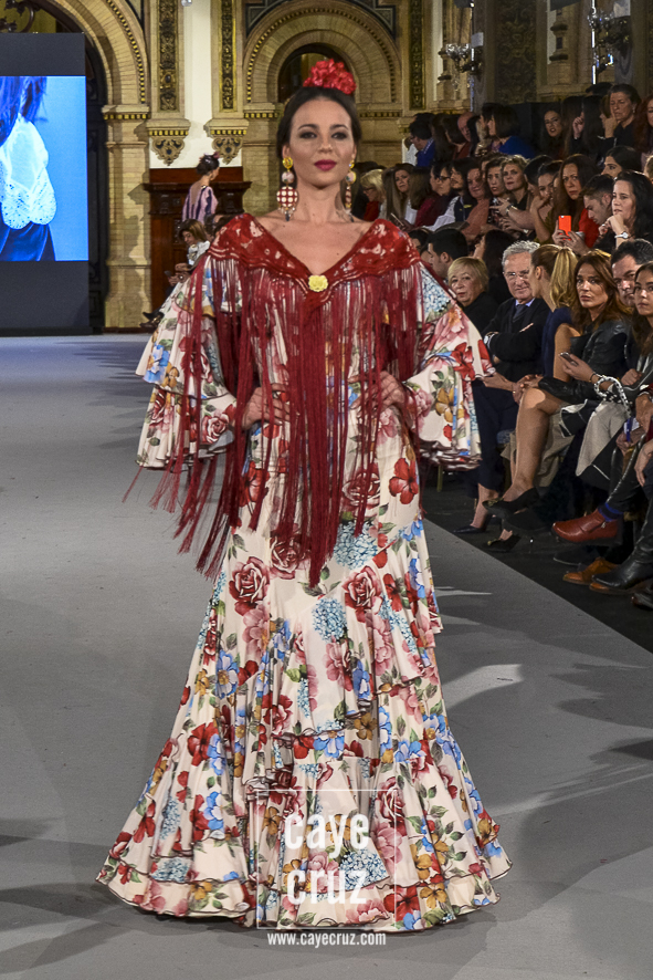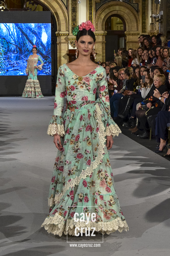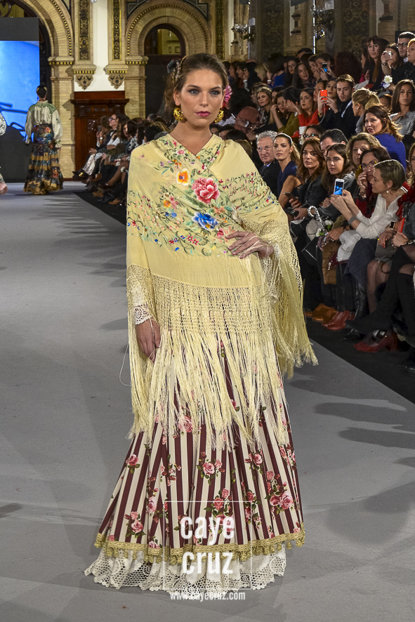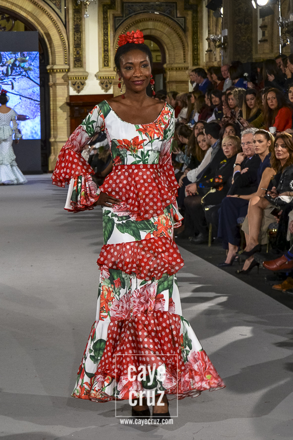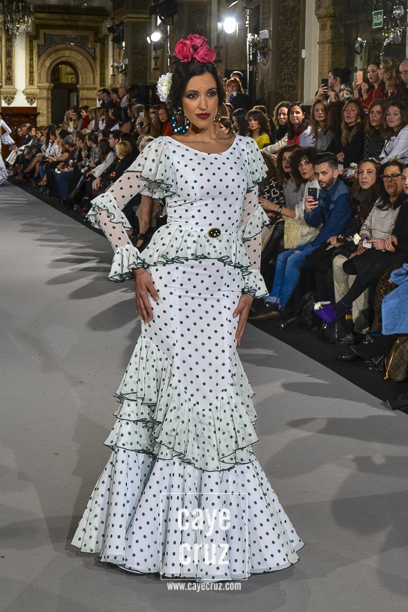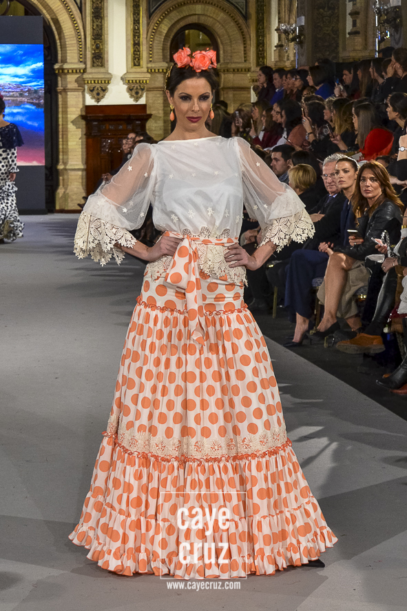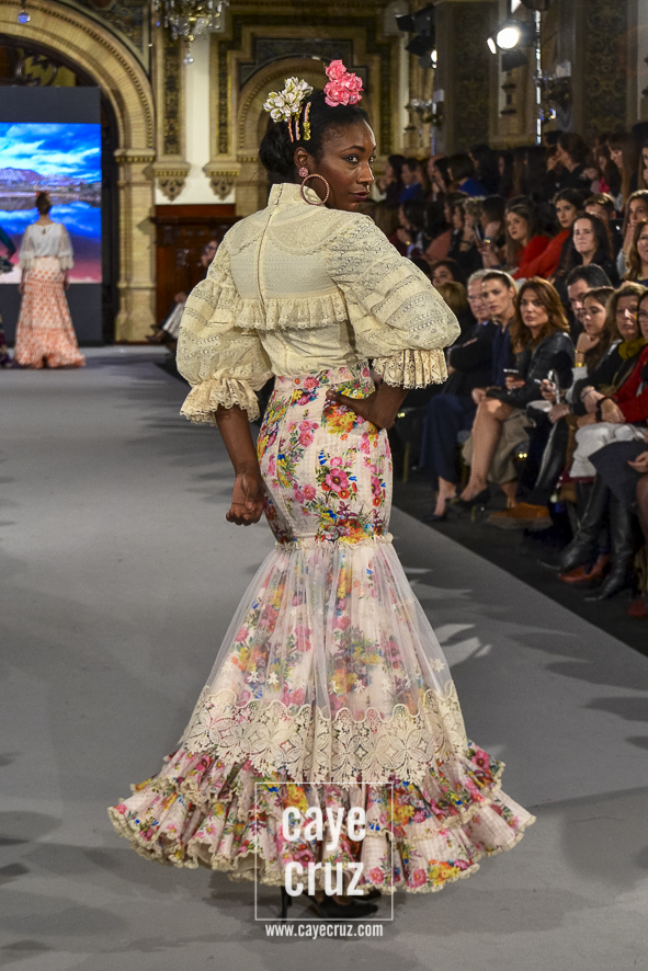 Ahí están las ‘Raices‘ que la casa de Pepe Jiménez ha llevado a pasarela con maestría, dibujando una flamenca que representa su tierra, que se pierde con el eco de un fandango de Alosno por paisajes naturales y los recorre con el sentir propio de quien se sabe en su hogar. Colores tierra, gama apastelada o estampado floral junto a la pureza de blancos o tonos primarios se incorporan a faldas y cuerpos que, en su mayoría, remiten al carácter rural, a la vestimenta de campo y a estampas antiguas previas a la explosión de volantes (las faldas, al menos en apariencia, parecen hecha a la antigua y sin rellenos propios de flamenca). Es así como desde El Ajolí se abrazan las diferentes formas que visten el folclore onubense (con especial querencia a la zona del Andévalo), creando una colección hecha con sensibilidad y respeto a quienes viven y celebran la riqueza de una cultura que, por cierto, merecía este reconocimiento y este homenaje por parte de una de las firmas maestras de la flamenca.