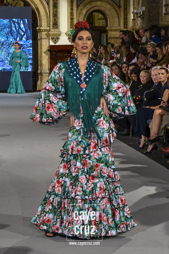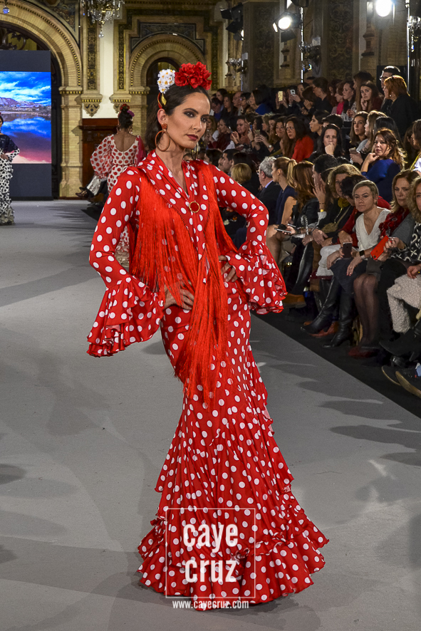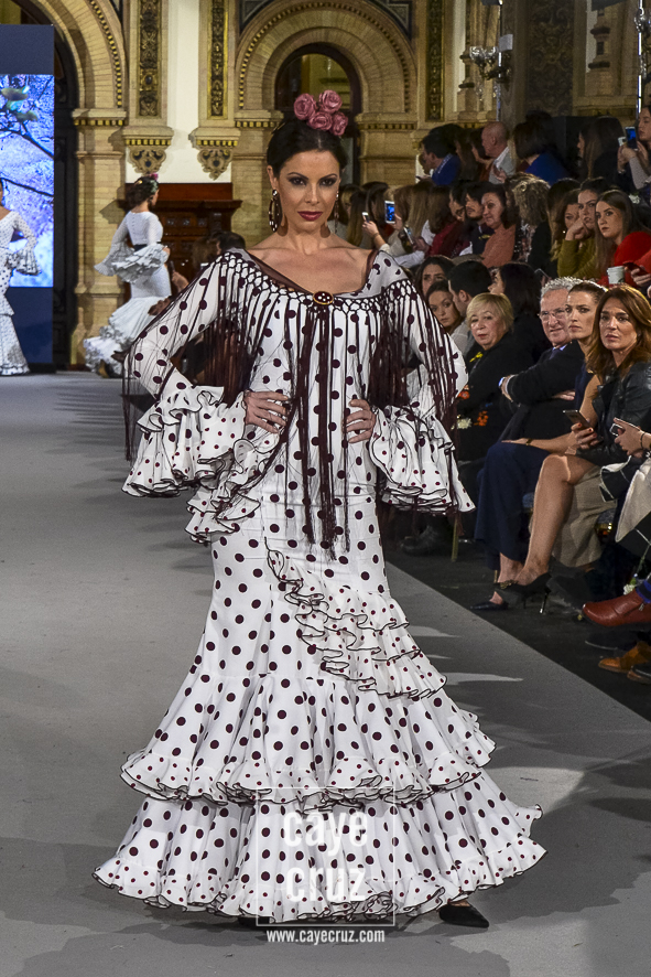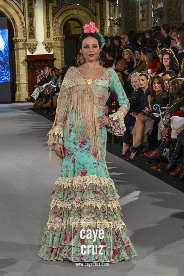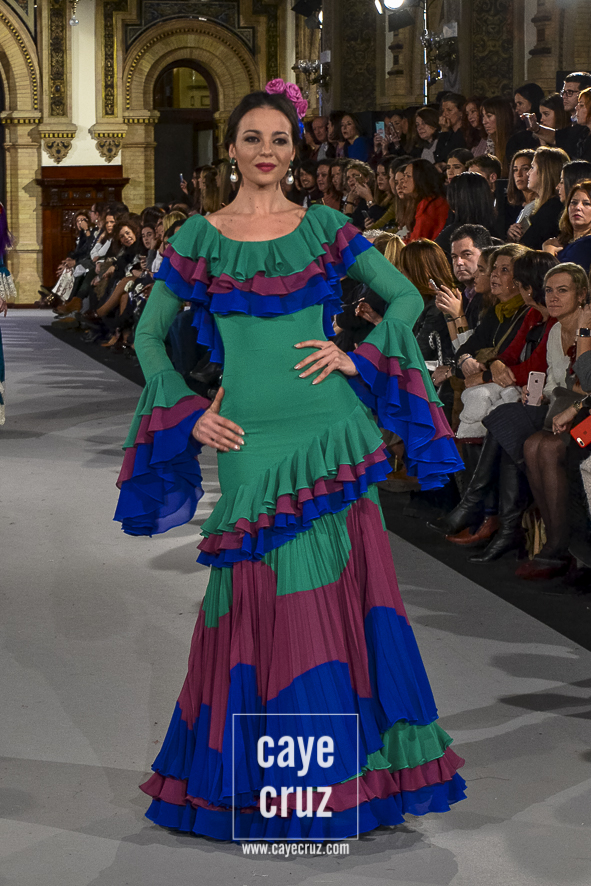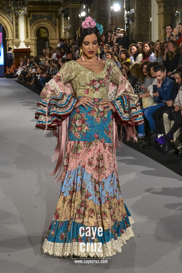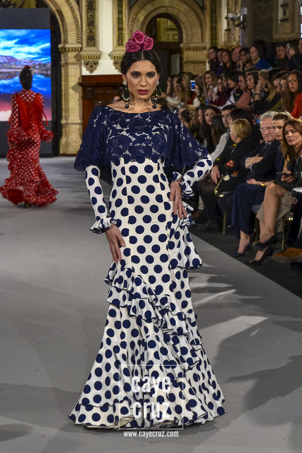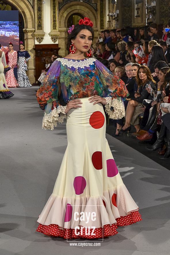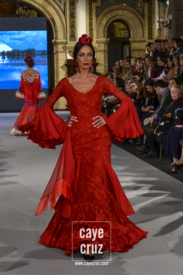 Ahí están las ‘Raices‘ que la casa de Pepe Jiménez ha llevado a pasarela con maestría, dibujando una flamenca que representa su tierra, que se pierde con el eco de un fandango de Alosno por paisajes naturales y los recorre con el sentir propio de quien se sabe en su hogar. Colores tierra, gama apastelada o estampado floral junto a la pureza de blancos o tonos primarios se incorporan a faldas y cuerpos que, en su mayoría, remiten al carácter rural, a la vestimenta de campo y a estampas antiguas previas a la explosión de volantes (las faldas, al menos en apariencia, parecen hecha a la antigua y sin rellenos propios de flamenca). Es así como desde El Ajolí se abrazan las diferentes formas que visten el folclore onubense (con especial querencia a la zona del Andévalo), creando una colección hecha con sensibilidad y respeto a quienes viven y celebran la riqueza de una cultura que, por cierto, merecía este reconocimiento y este homenaje por parte de una de las firmas maestras de la flamenca.