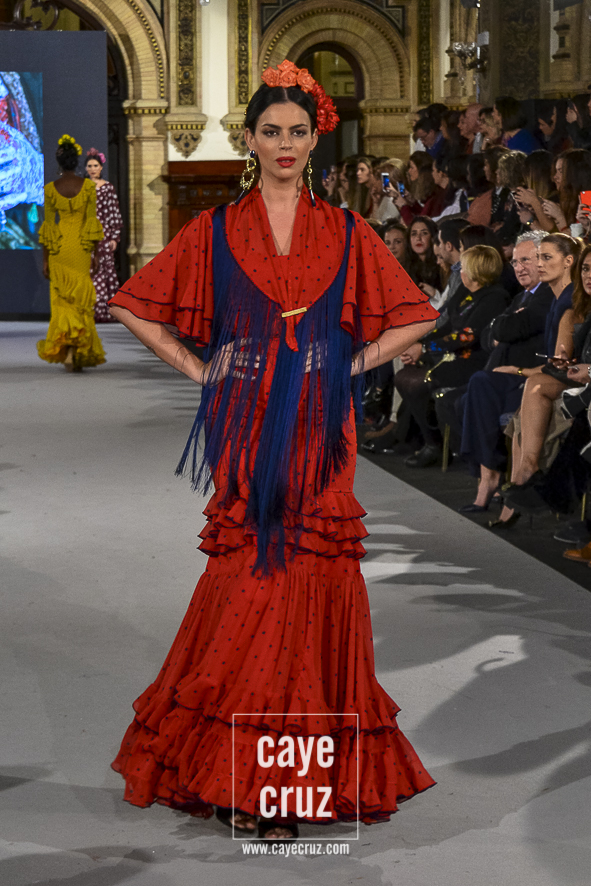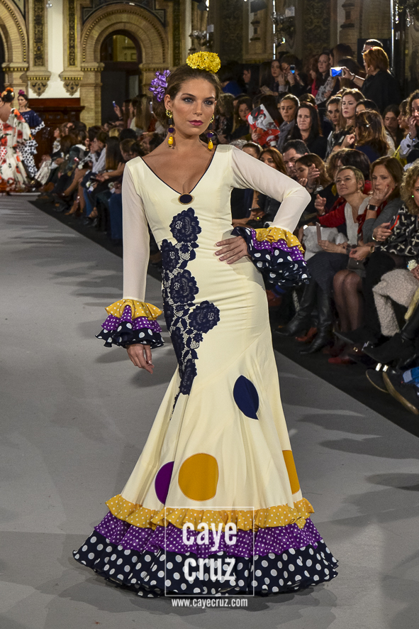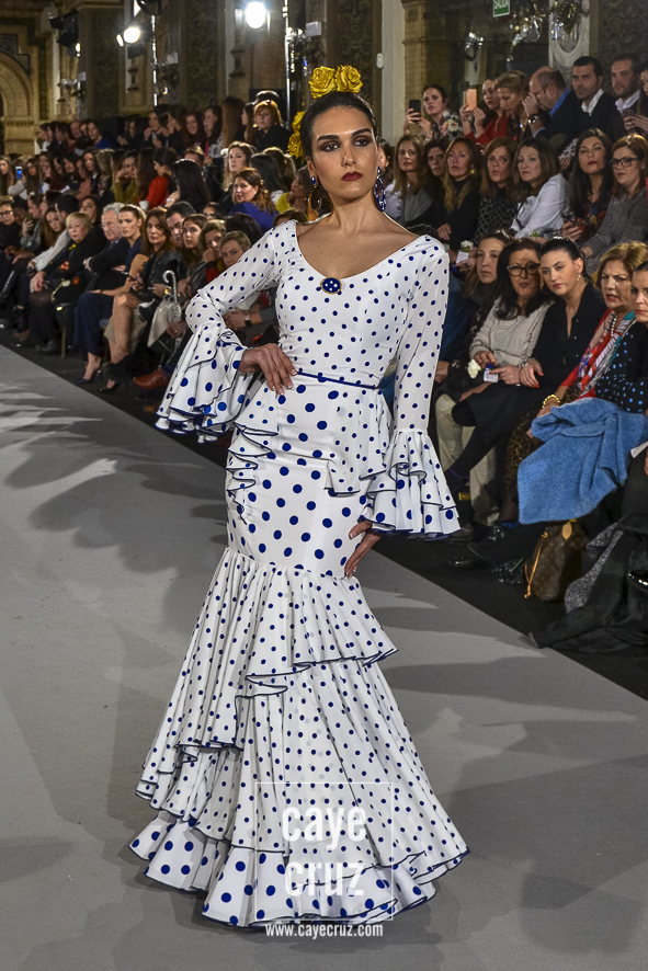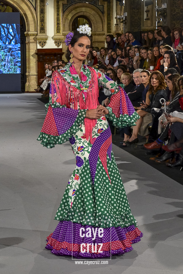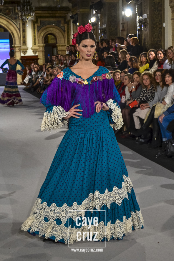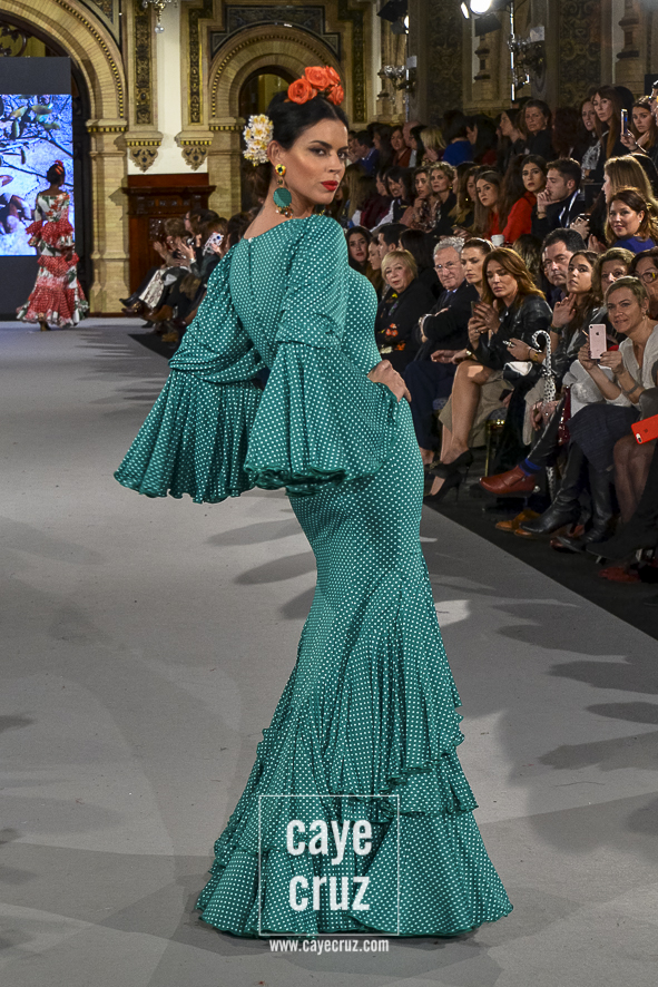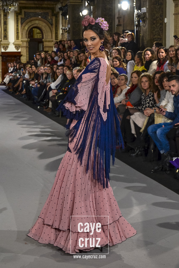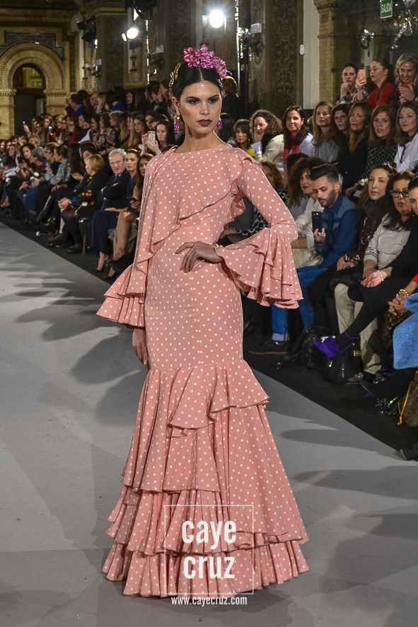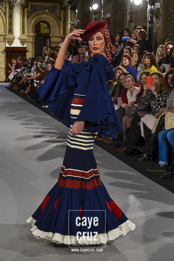 Ahí están las ‘Raices‘ que la casa de Pepe Jiménez ha llevado a pasarela con maestría, dibujando una flamenca que representa su tierra, que se pierde con el eco de un fandango de Alosno por paisajes naturales y los recorre con el sentir propio de quien se sabe en su hogar. Colores tierra, gama apastelada o estampado floral junto a la pureza de blancos o tonos primarios se incorporan a faldas y cuerpos que, en su mayoría, remiten al carácter rural, a la vestimenta de campo y a estampas antiguas previas a la explosión de volantes (las faldas, al menos en apariencia, parecen hecha a la antigua y sin rellenos propios de flamenca). Es así como desde El Ajolí se abrazan las diferentes formas que visten el folclore onubense (con especial querencia a la zona del Andévalo), creando una colección hecha con sensibilidad y respeto a quienes viven y celebran la riqueza de una cultura que, por cierto, merecía este reconocimiento y este homenaje por parte de una de las firmas maestras de la flamenca.