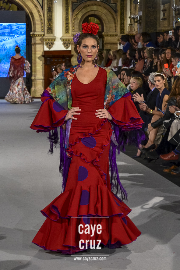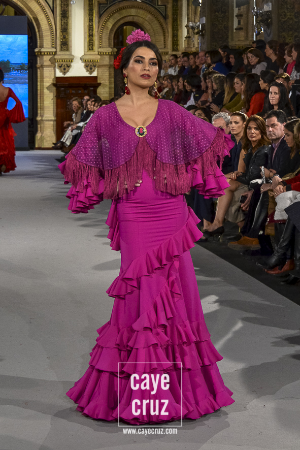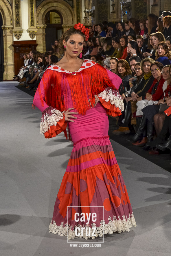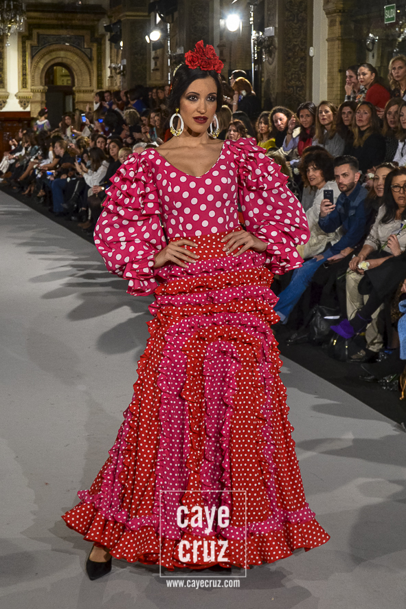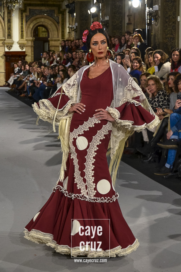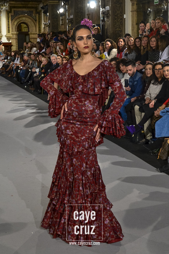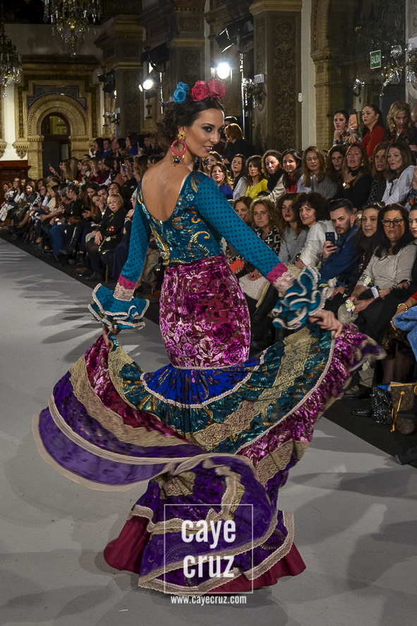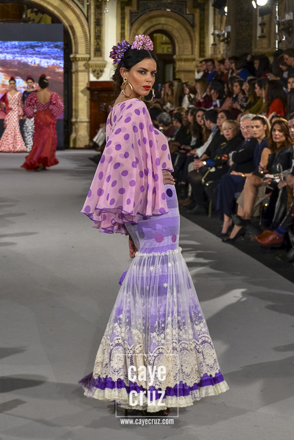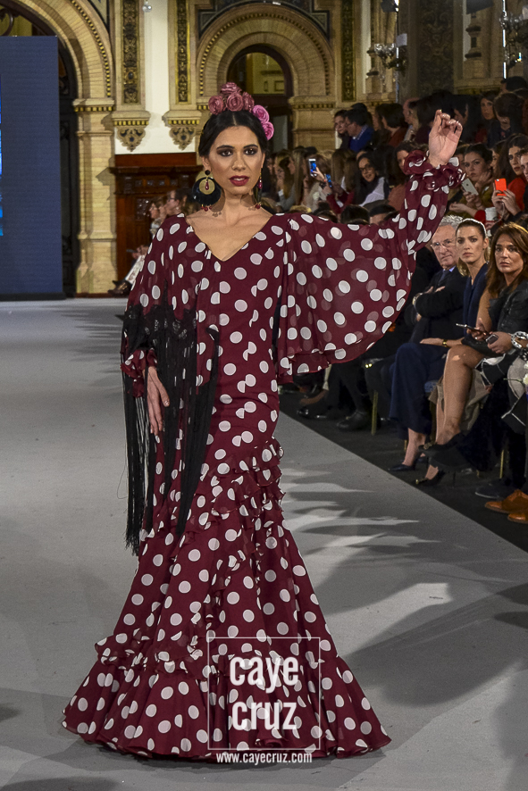 Ahí están las ‘Raices‘ que la casa de Pepe Jiménez ha llevado a pasarela con maestría, dibujando una flamenca que representa su tierra, que se pierde con el eco de un fandango de Alosno por paisajes naturales y los recorre con el sentir propio de quien se sabe en su hogar. Colores tierra, gama apastelada o estampado floral junto a la pureza de blancos o tonos primarios se incorporan a faldas y cuerpos que, en su mayoría, remiten al carácter rural, a la vestimenta de campo y a estampas antiguas previas a la explosión de volantes (las faldas, al menos en apariencia, parecen hecha a la antigua y sin rellenos propios de flamenca). Es así como desde El Ajolí se abrazan las diferentes formas que visten el folclore onubense (con especial querencia a la zona del Andévalo), creando una colección hecha con sensibilidad y respeto a quienes viven y celebran la riqueza de una cultura que, por cierto, merecía este reconocimiento y este homenaje por parte de una de las firmas maestras de la flamenca.