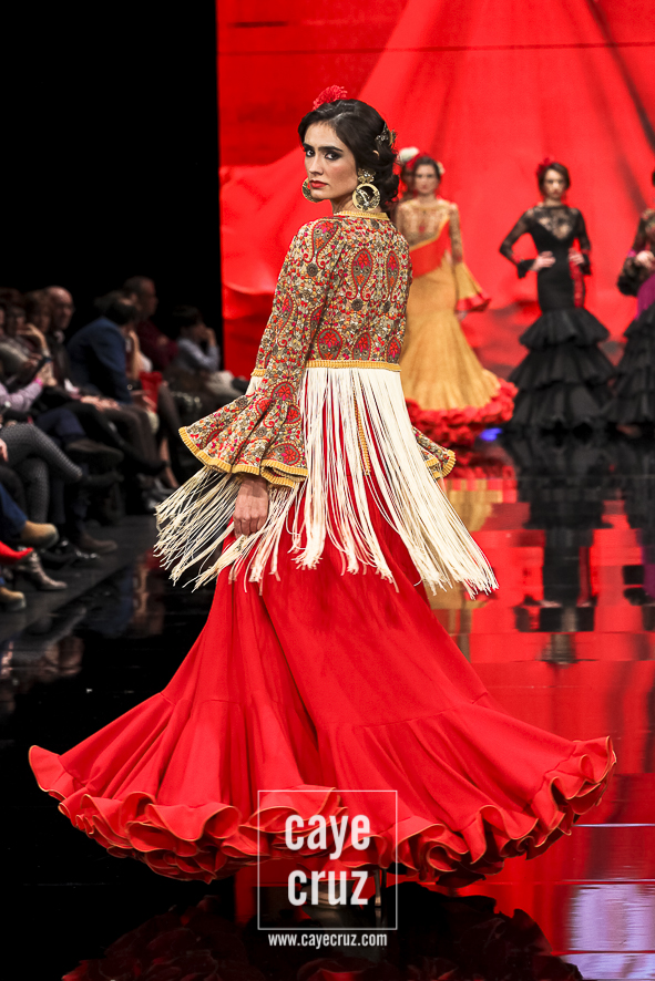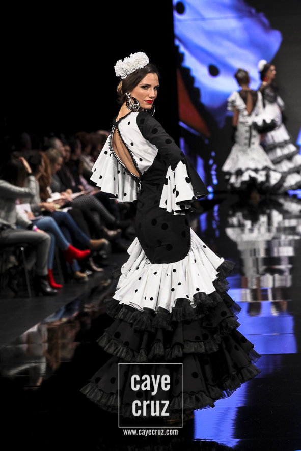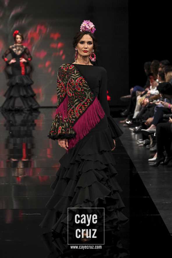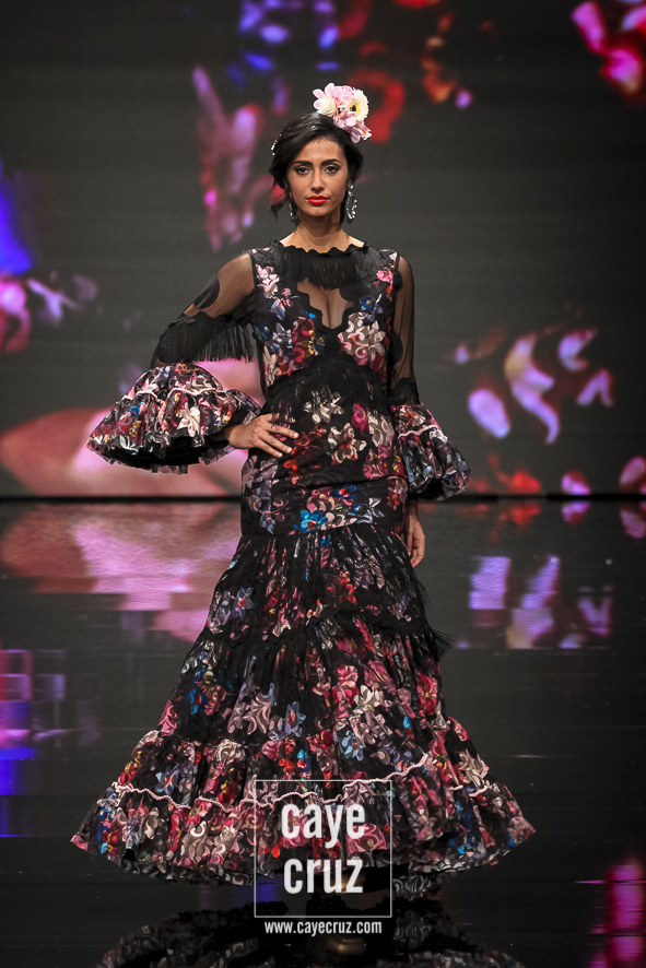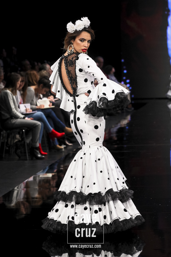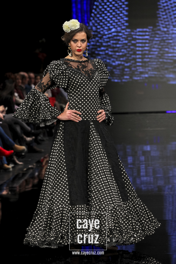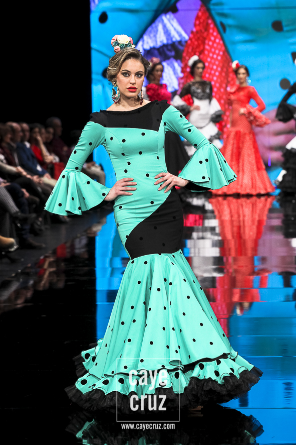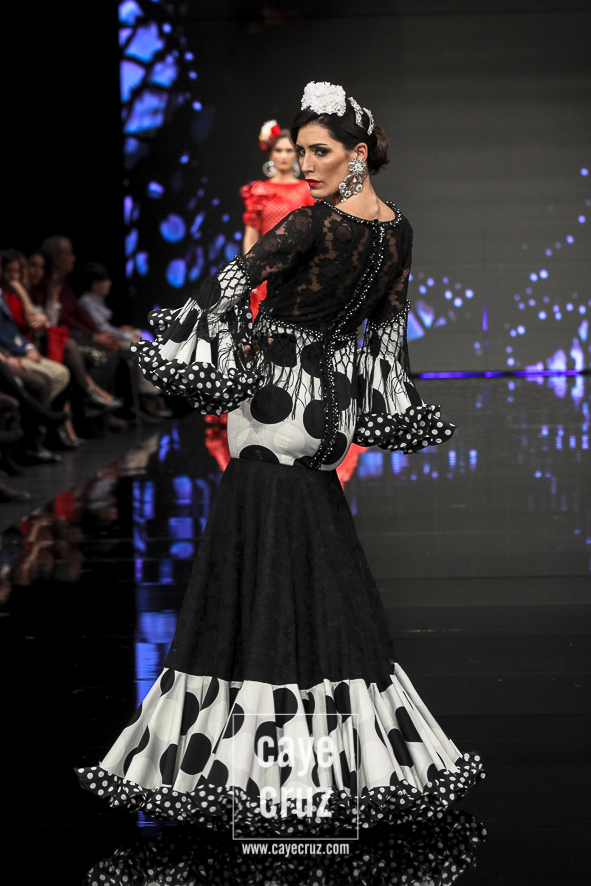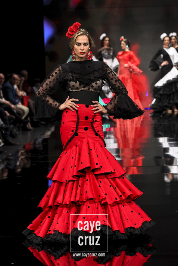 En la parte de flamenco no había lugar a dudas: la sonoridad y la fuerza de la canción del fuego fatuo abría un desfile con lunares negros, colores saturados, volantes asimétricos y un elaborado trabajo de patronaje en el que la flamenca propia de Loli Vera parece aproximarse a ese gusto actual por los cortes y las combinaciones de tejidos en cuerpos. Vemos, incluso, cierto guiño en las mangas a los años 90 en un comienzo donde el negro demuestra que es el gran color base de la flamenca.