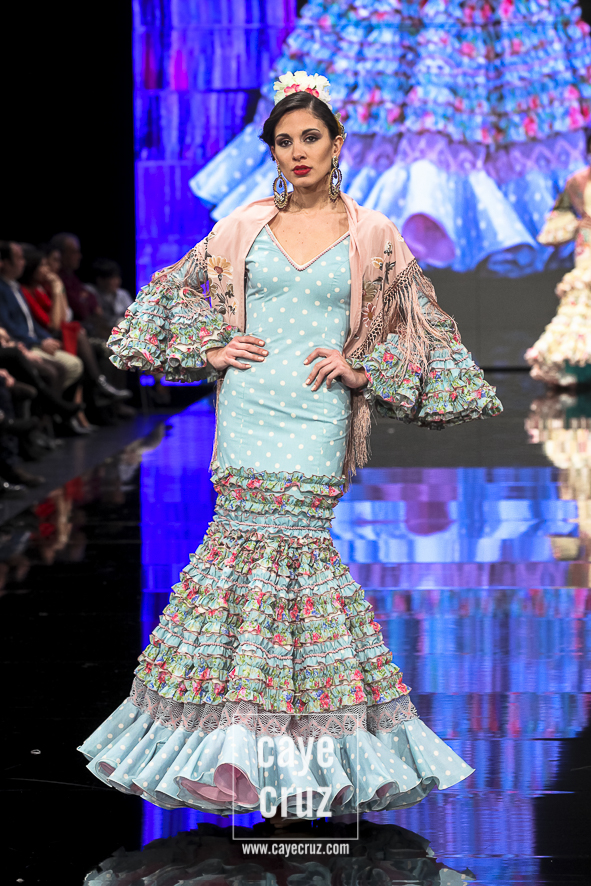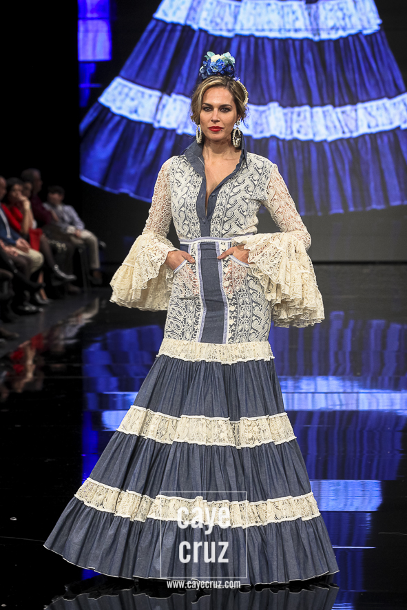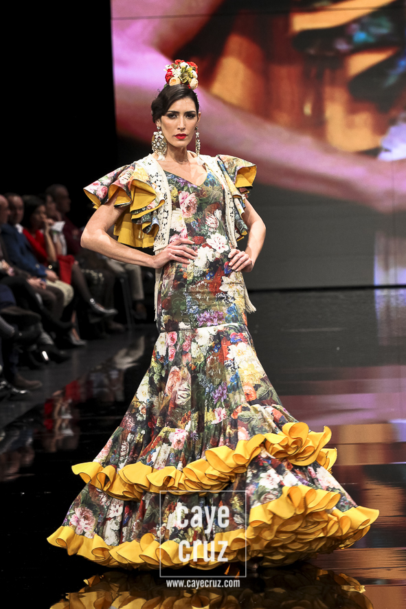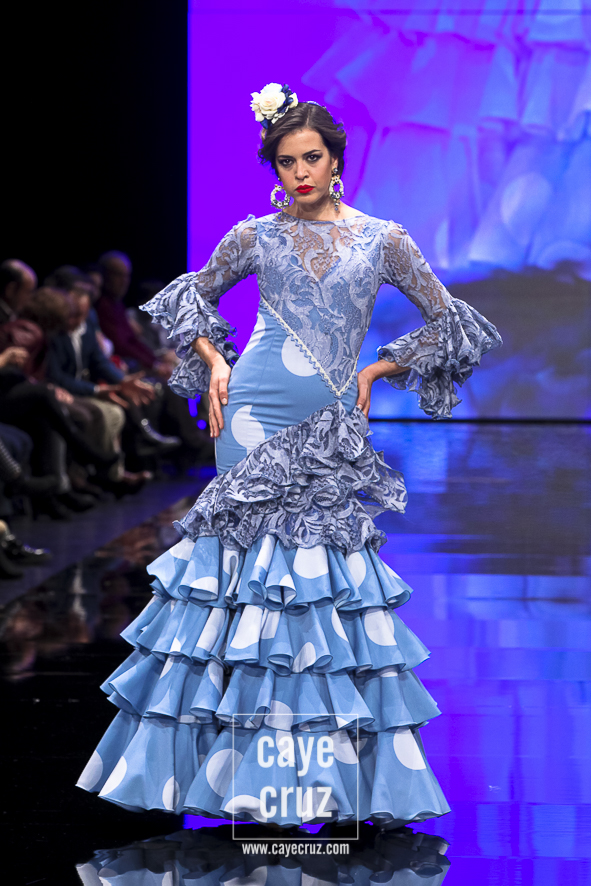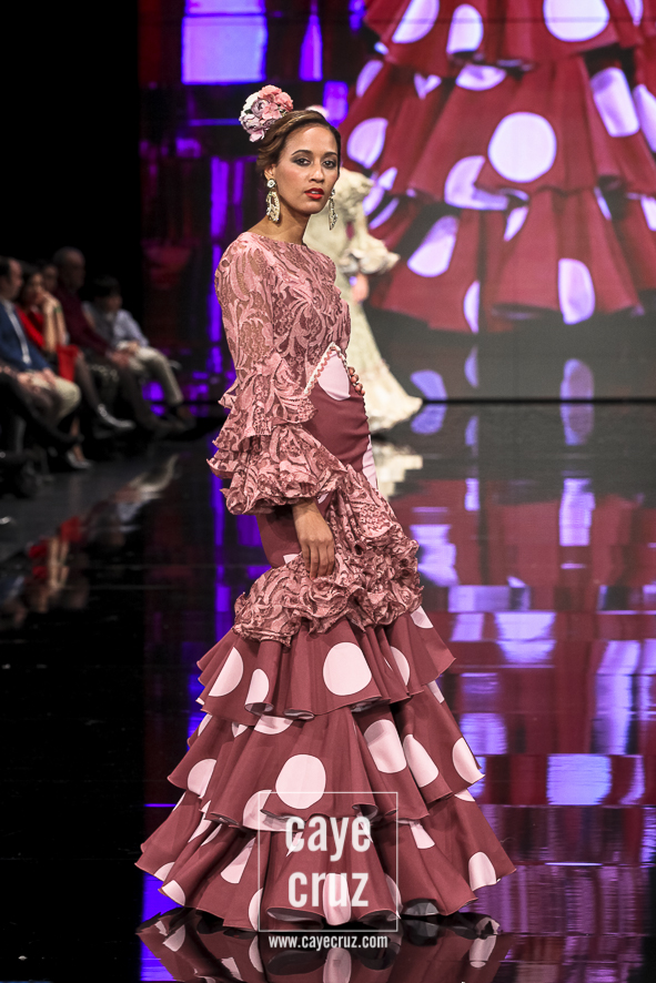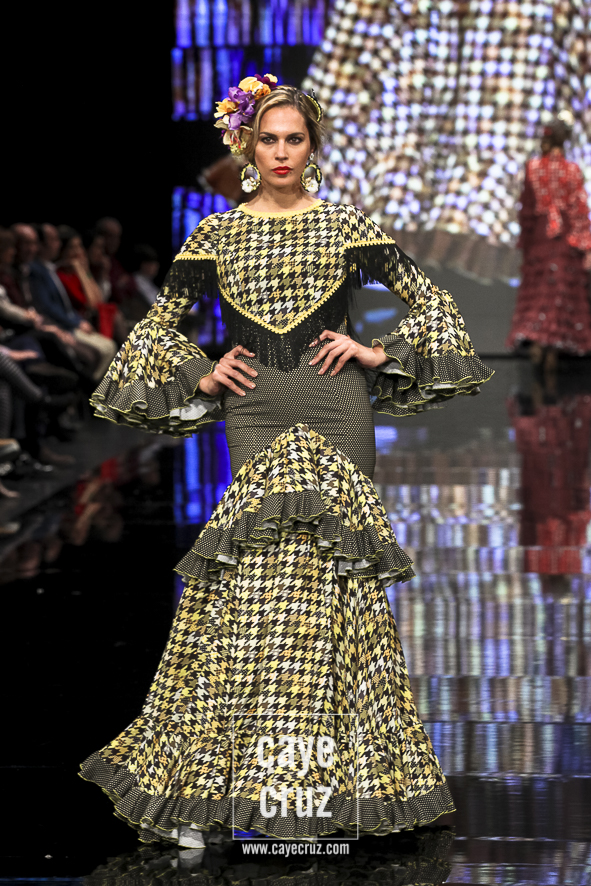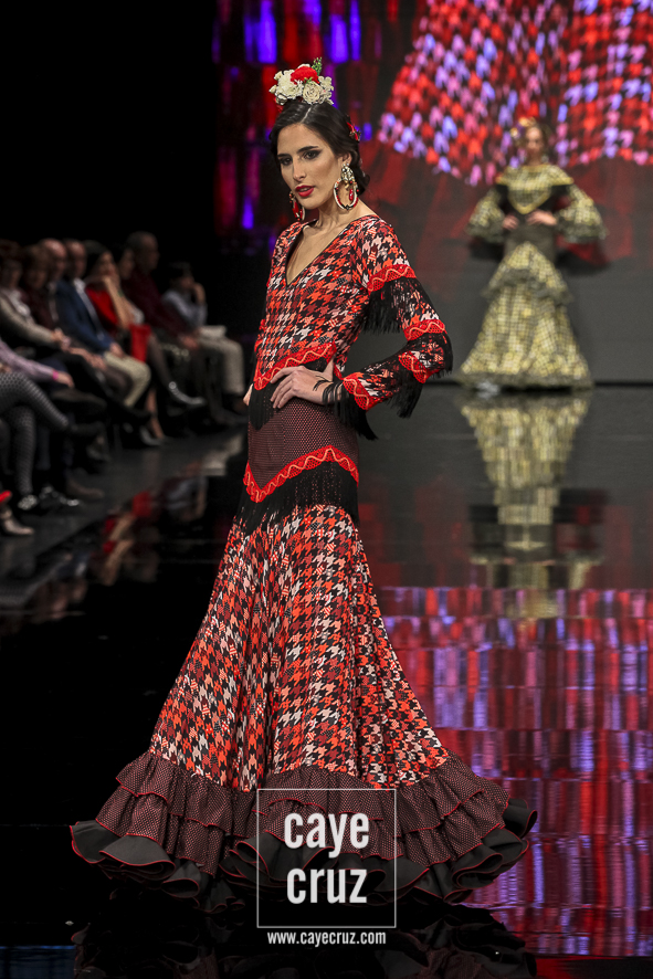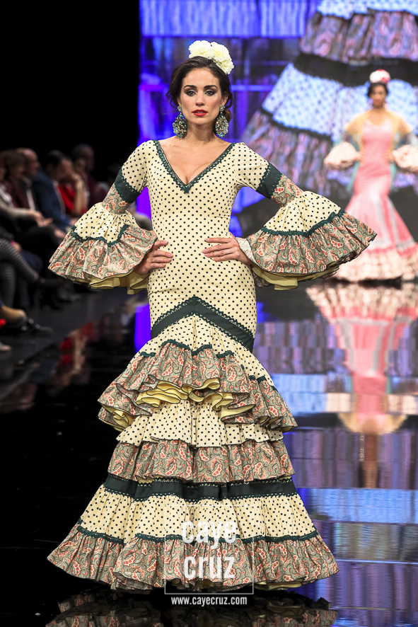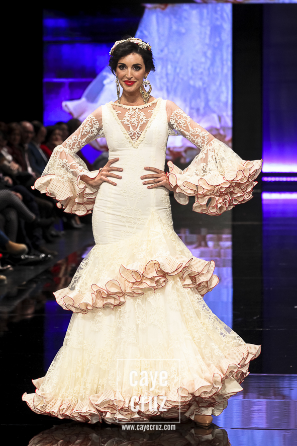 En la parte de flamenco no había lugar a dudas: la sonoridad y la fuerza de la canción del fuego fatuo abría un desfile con lunares negros, colores saturados, volantes asimétricos y un elaborado trabajo de patronaje en el que la flamenca propia de Loli Vera parece aproximarse a ese gusto actual por los cortes y las combinaciones de tejidos en cuerpos. Vemos, incluso, cierto guiño en las mangas a los años 90 en un comienzo donde el negro demuestra que es el gran color base de la flamenca.