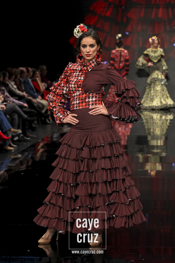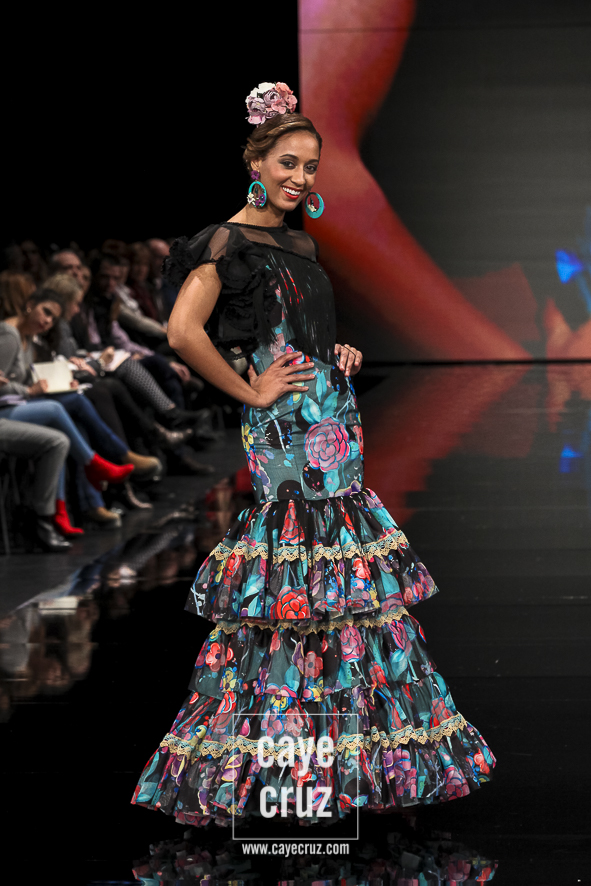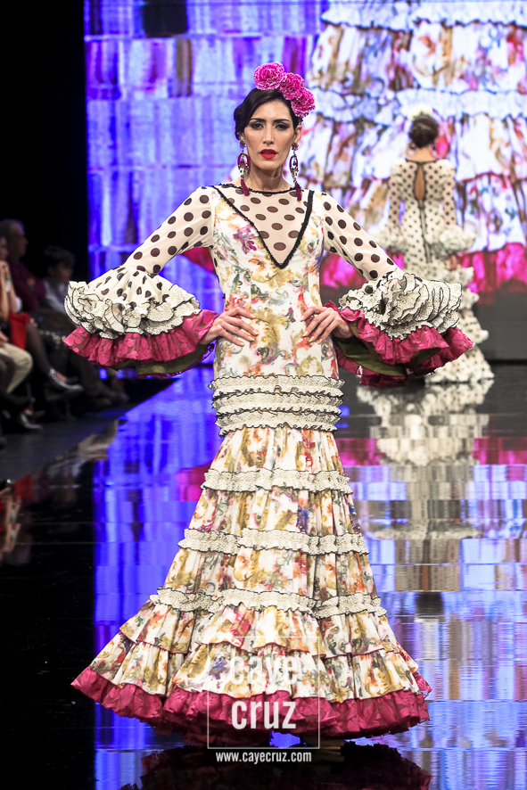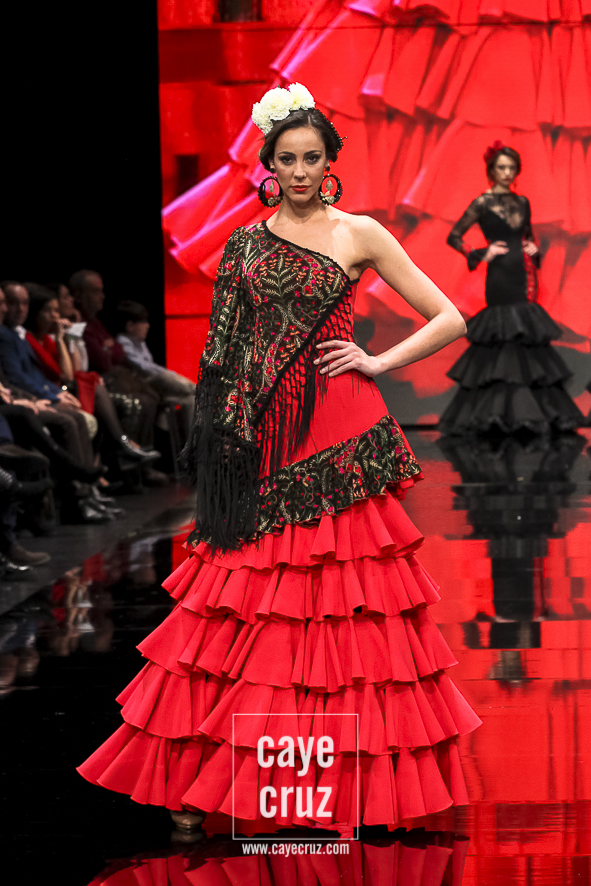 Tras la jondura y la fuerza se pasa a una parte más relajada, más sosegada, de estampados florales, de experimentación, de escotes muy abiertos, espaldas marcadas, asimetrías que juegan con estampados, mezclas de colores con las que hay que atreverse e incluso transparencias. Los bailes latinos, representados en la bachata, guían a esta flamenca de volantes clásicos (y de mucho rojo pasional) pero en los que se ha tratado de buscar la innovación a partir de componer diseños donde la mitad superior marcan la diferencia.
