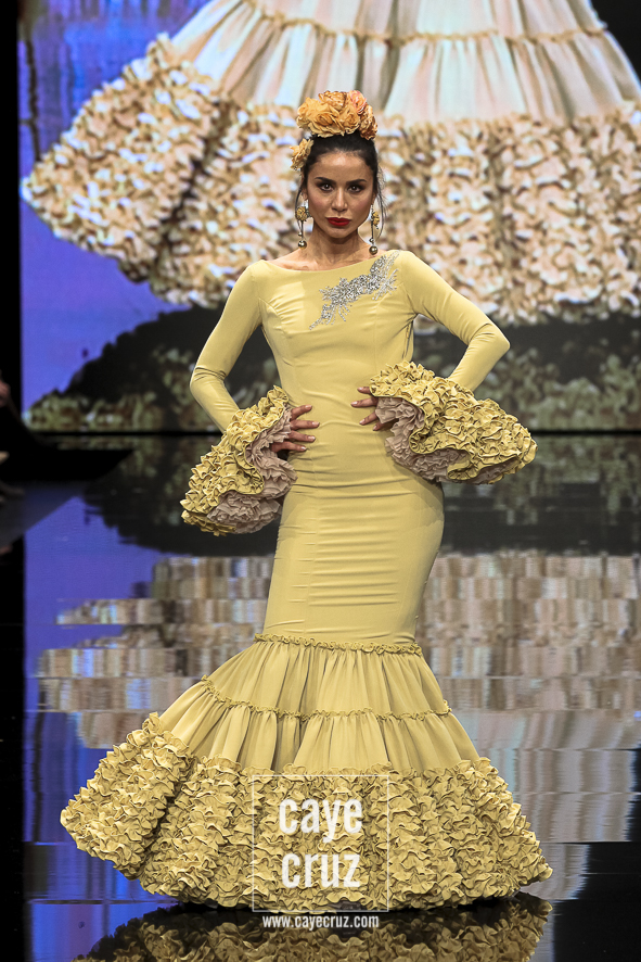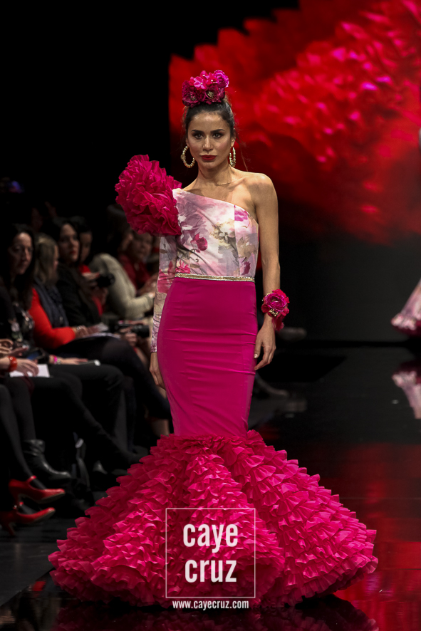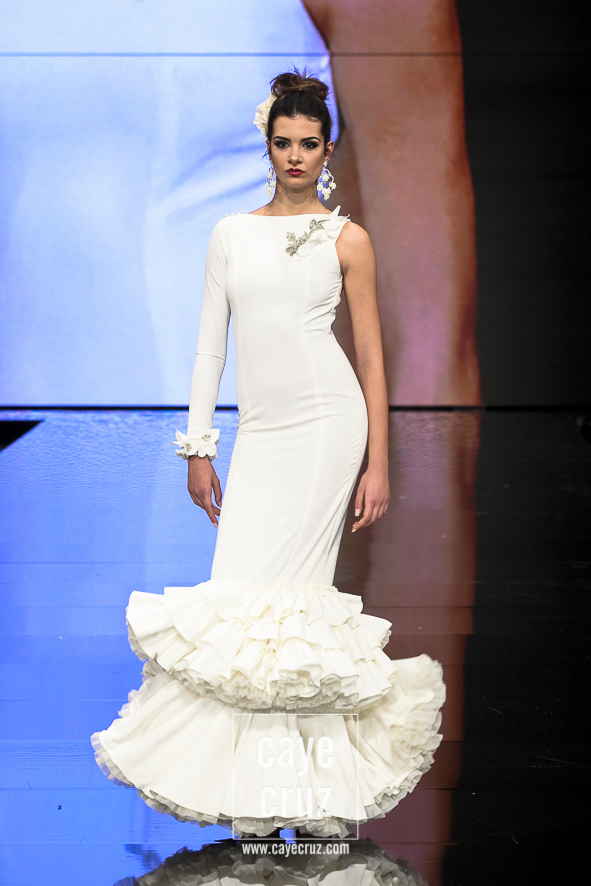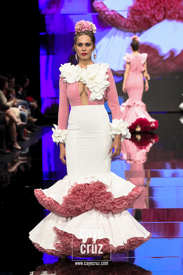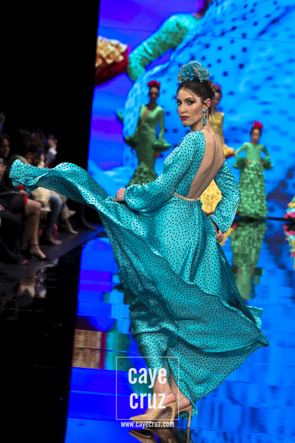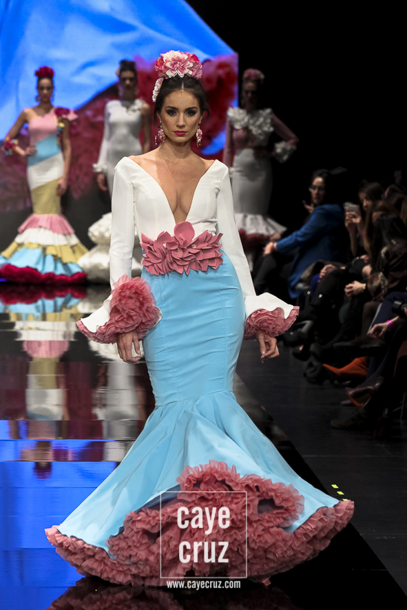 Inspirada por los colores y las postales idílicas de la isla griega de Santorini, la flamenca de Carmen Raimundo volvió a SIMOF nueve años después para vestirse de sensualidad, de aires estivales y del colorido que bañan las islas griegas, desde el celeste de cielo y mar hasta el blanco de las paredes pasando por el albero de la tierra o las buganvillas que llenan no pocas fachadas de la isla. Es así como una pequeña gama cromática se sucede en cortes elaborados, escotes marcados, asimetrías, faldas generosas en volúmenes, aplicaciones de pedrerías o pequeños detalles que buscan que esta flamenca resulte a la vista tan atrayente como lo son las imágenes de la isla. No hay referencias culturales como tal ni tampoco se busca, pues la guía de la colección ha sido únicamente la paleta de colores que, combinadas entre sí, muestran esa evolución o esas inquietudes que, como apuntábamos al principio, Carmen Raimundo va recuperando en su trabajo.