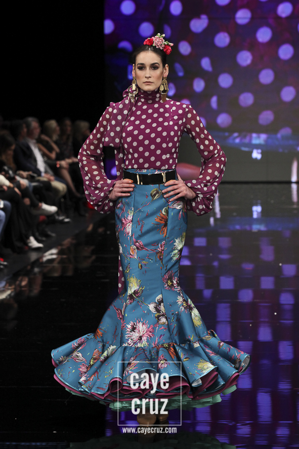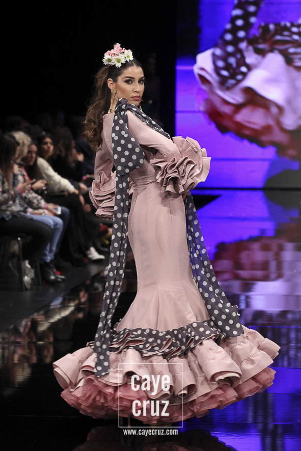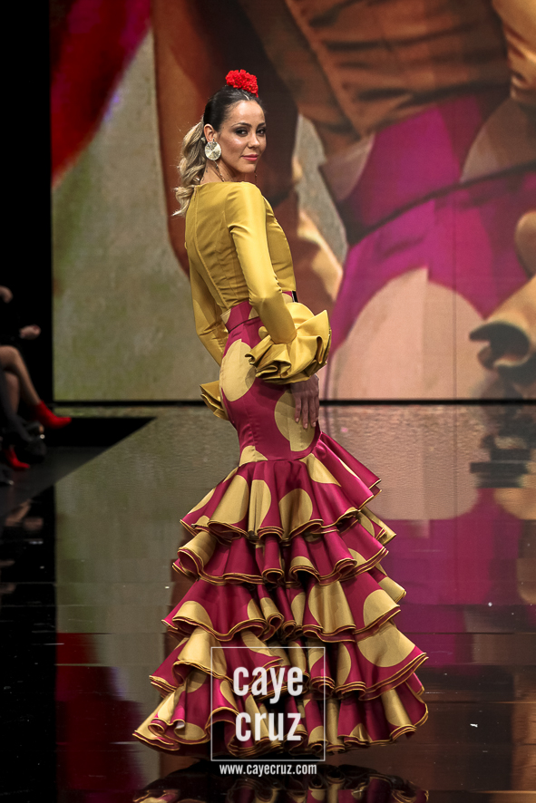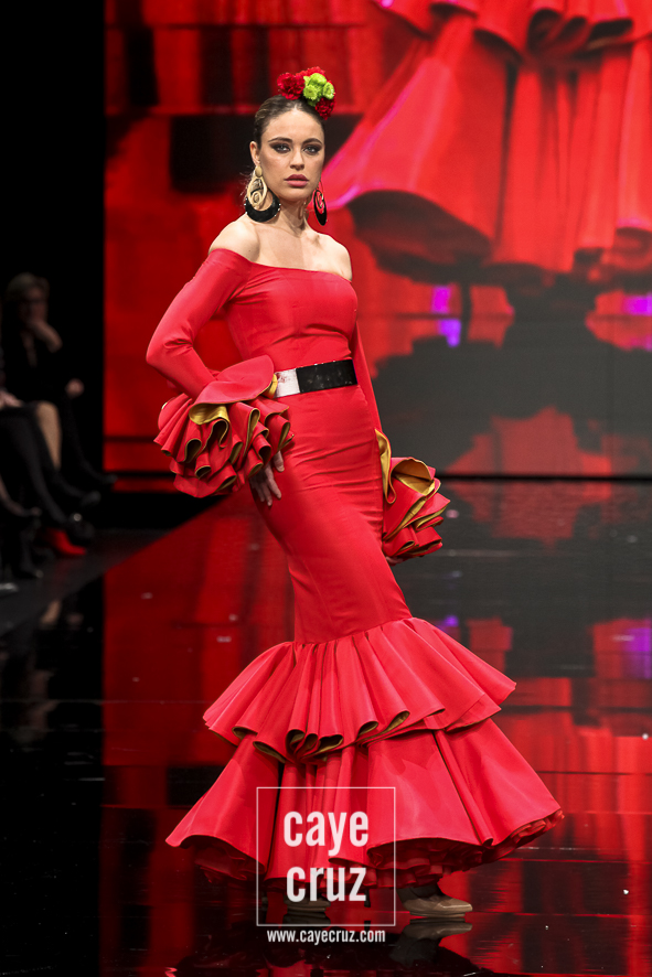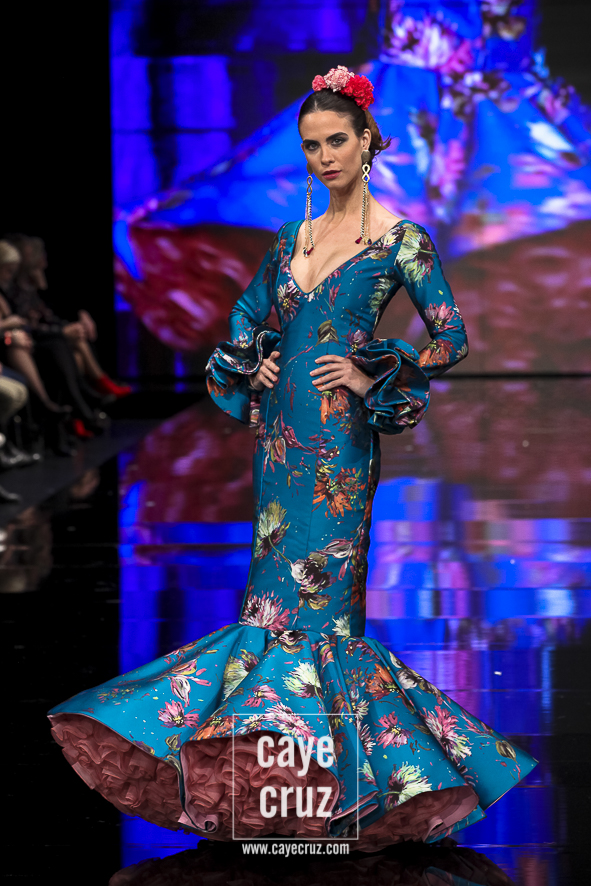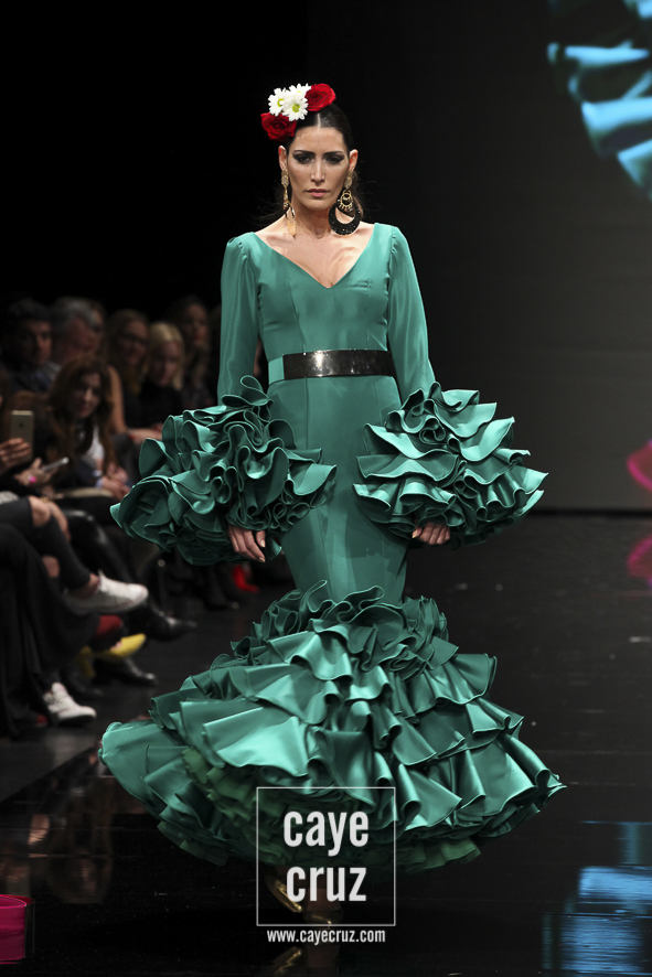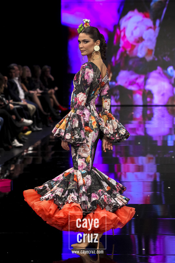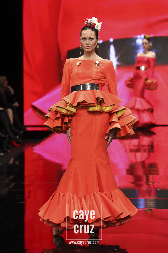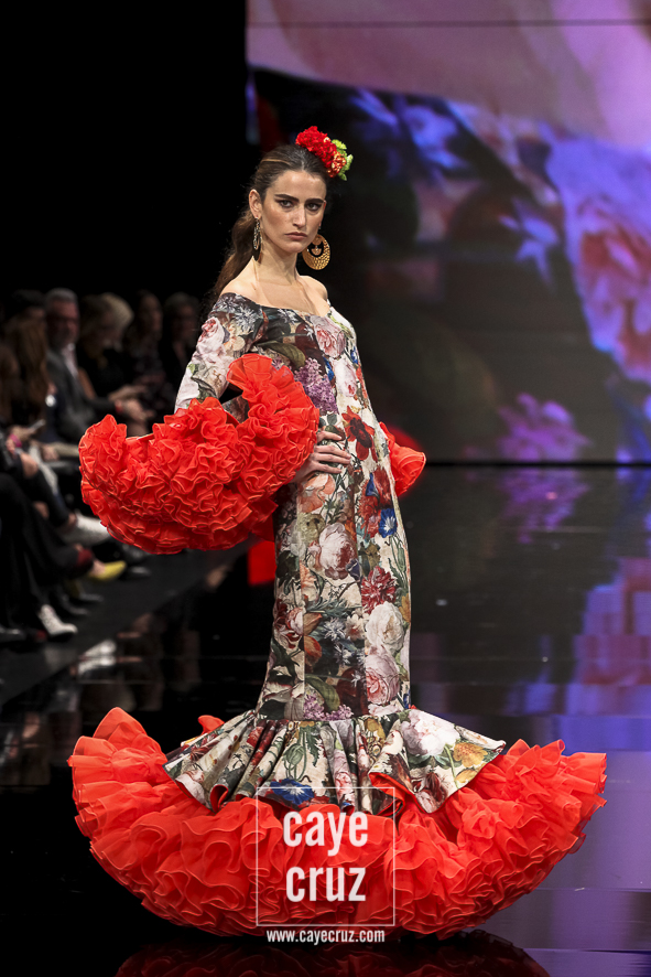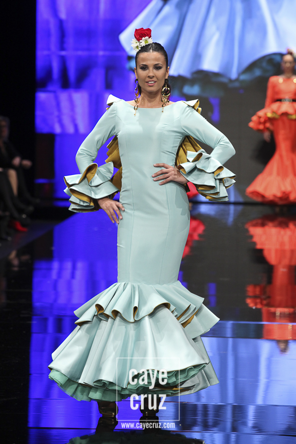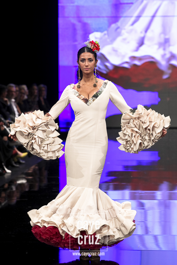 Uno de los mejores ejemplos lo encontramos en Miriam Galvín: la diseñadora sevillana aterrizó en SIMOF hace dos años con una colección que tenía algo en su haber que mostraba algo diferente, sin salirse mucho del tiesto, pero con la suficiente entidad como para esperar a ver por donde iba. En ‘Flores’ ya estaban los trajes tobilleros de grandes volantes, las enaguas infintas, los estampados florales de combinaciones contrastadas de color o los escotes de todo tipo pero muy marcados. ‘Levante‘ es tal vez la maduración o la puesta de largo del estilo de la diseñadora, con una flamenca que presenta sus ideas bien organizadas y matizadas.