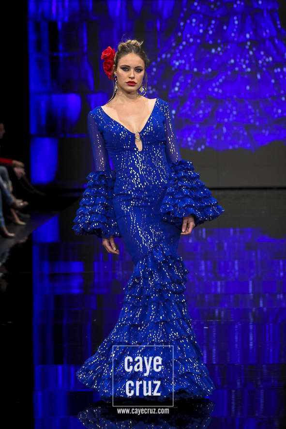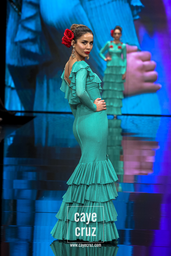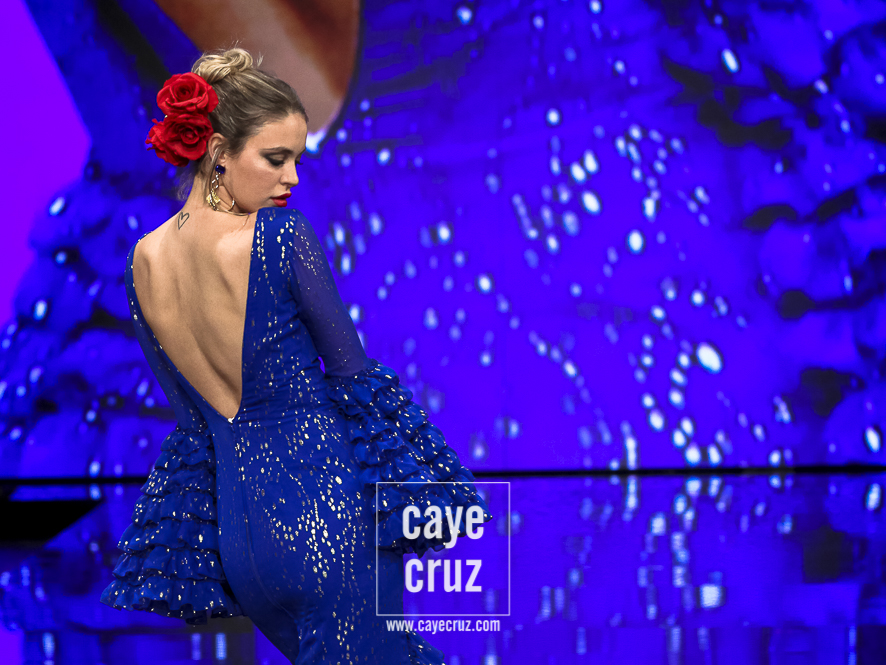 Consolación Ayala lleva varios años dando muestras de ello, de que sabe tratar qué se lleva, qué quiere el público y qué se puede hacer con un traje para que, partiendo de una hechura clásica, se le añadan al producto final esas cositas que lo ponen como óptimo en la temporada en que estamos. Lo hemos visto en sus anteriores colecciones y ‘Aura’ no se queda atrás: todo en esta colección está conjugado de manera correcta. El verde se presenta sin volúmenes, con muchos volantes y ese eco a la invitada perfecta que pisa la Feria. El trío blanco/negro/rojo se queda la parte más diferente y creada para desmarcarse. El azul juega con el dorado del nombre de colección para mostrar sensualidad mientras que los lunares dorados sobre fondo negro nos llevan hacia el final. Todo ello, como vemos, son ideas que se presentan suavizadas y matizadas, o hechas especificamente para hacer ver que esa manga, ese volante o ese tejido se pueden hacer ponibles en flamenca. Lo suficiente como para que una persona clásica las digiera y las vea sobre el albero.