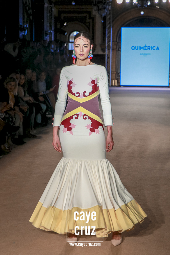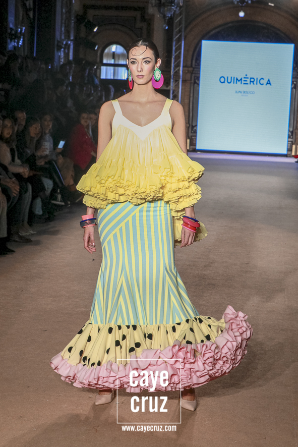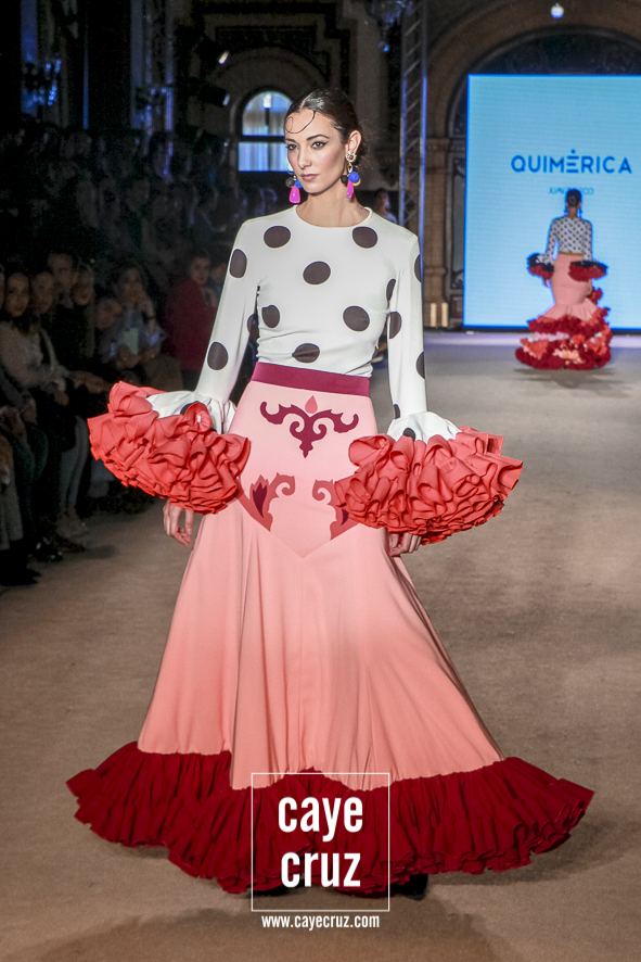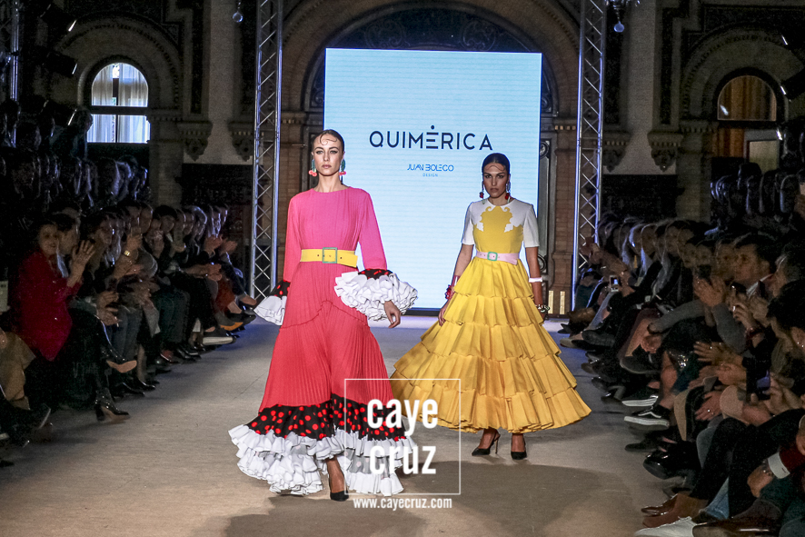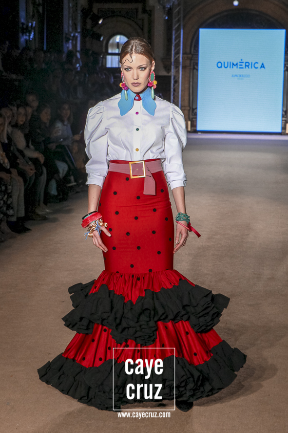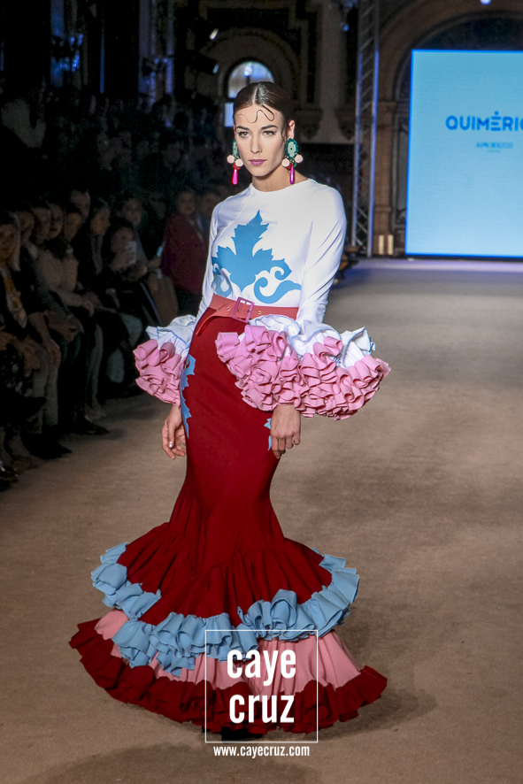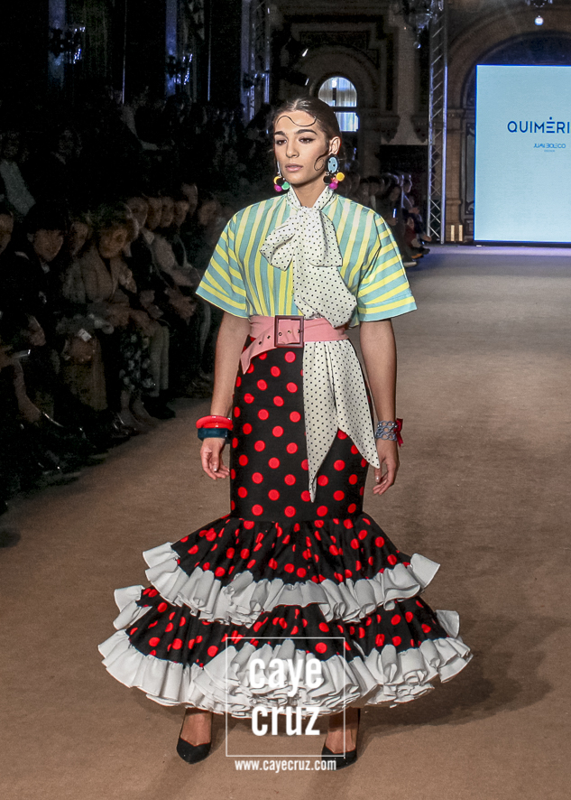Cuando en varias ocasiones he podido entrevistar a diseñadores que han obtenido un premio que, de manera no oficial, los acredita como profesionales, muchos de ellos dicen que a lo mejor no es el momento de colocarse la etiqueta, que para eso hace falta tiempo y bagaje. No es su caso: Juan Boleco ya es todo un profesional en la moda en general y la flamenca en particular, pero ha tenido que ser su particular ‘Quimérica‘ la que nos acerque a su momento de madurez como creativo, a ese momento en que sus bases están asentadas, su universo construido y su imaginación ya puede permitirse el lujo de crear sobre sí misma. ¿Cómo se vislumbra esa madurez? Veamos las claves de la colección: