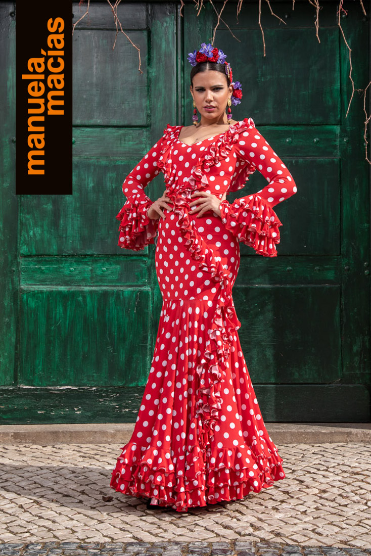 Combinaciones y geometrías. Si bien los volantes o escotes siguen una línea clásica, los cuerpos se valen especialmente del uso de colores en telas idénticas para un patronaje más elaborado y para pequeñas ideas que personalicen la flamenca y se añadan al repertorio de la firma. A destacar, también, los lunares blancos con colores como el amarillo, rosa o azul que la firma incluye casi siempre en sus propuestas.
