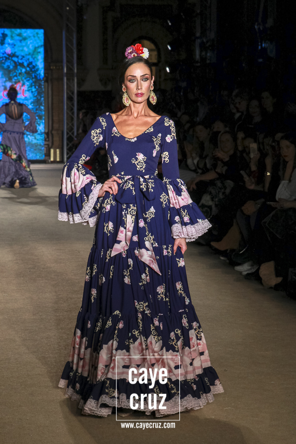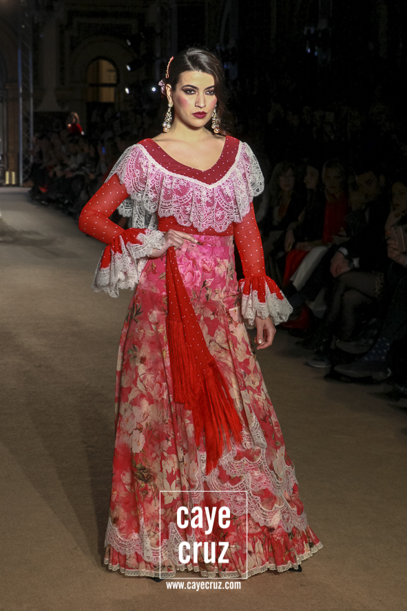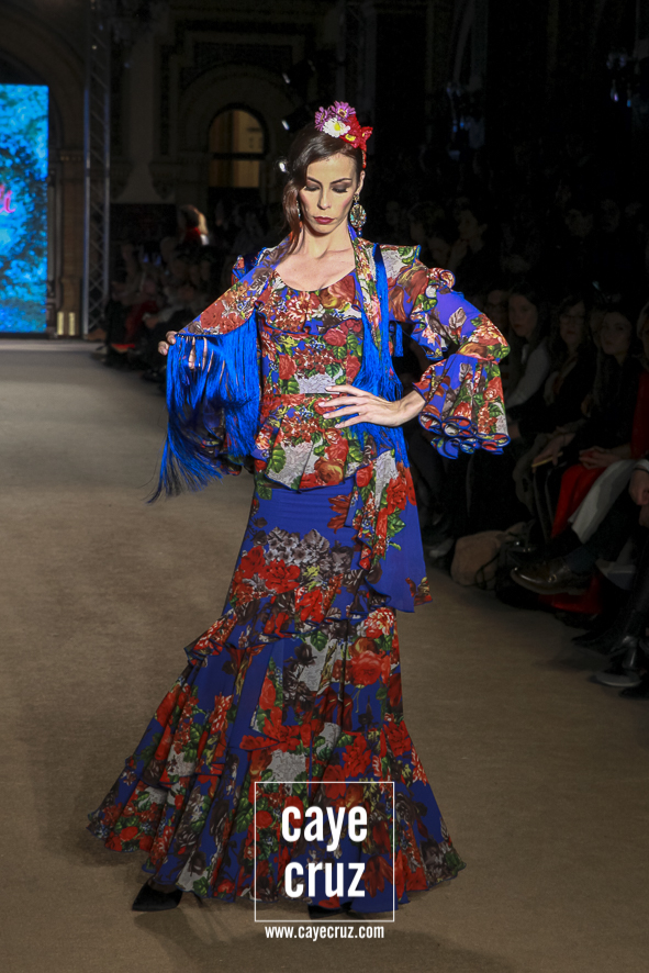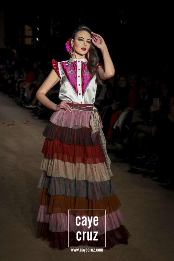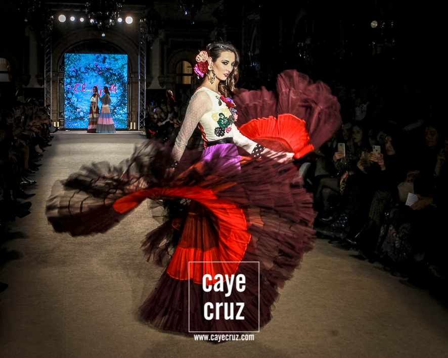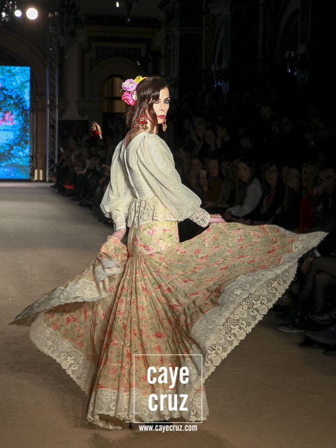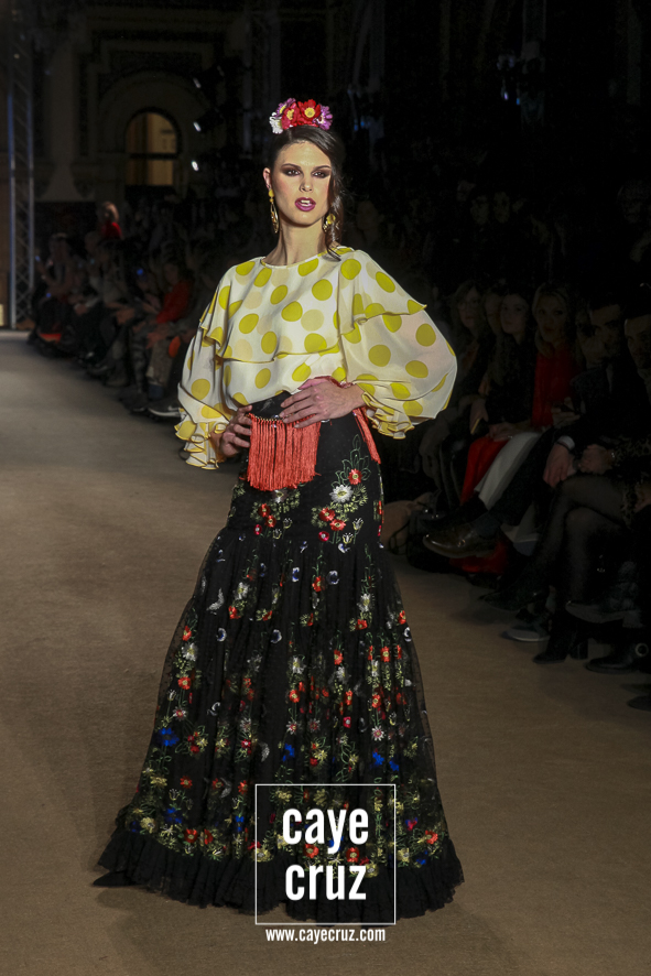 El romanticismo floral… sin caer en lo cursi. Desde el nombre de la colección hasta el final del desfile, la colección va insertando poco a poco esos cortes a la cintura, ese estampado e incluso bordados florales o esos volantes rematados con encajes de bolillos u otras terminaciones que remiten directamente a esa flamenca clásica que a la vez es delicada y romántica pero que en el caso de El Ajolí no se ve como algo ñoño o kistch, sino que consiguen darle la vuelta y hacer que adquiera una fuerza especial. Además, la tendencia de los cortes a la cintura con vuelo beneficia y potencia el estilo que han intentado impregnar a la colección.