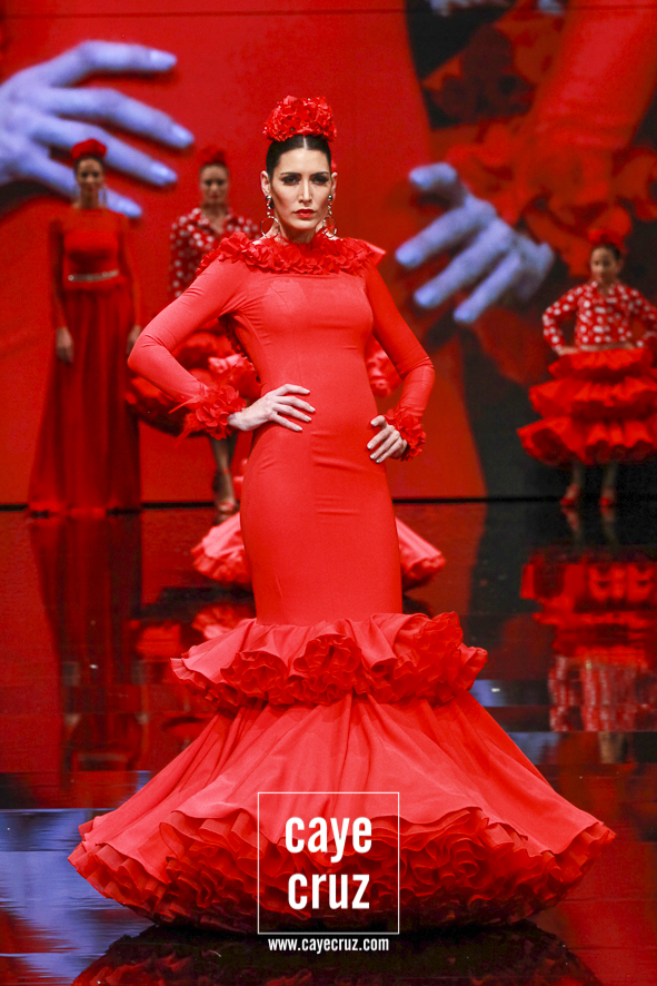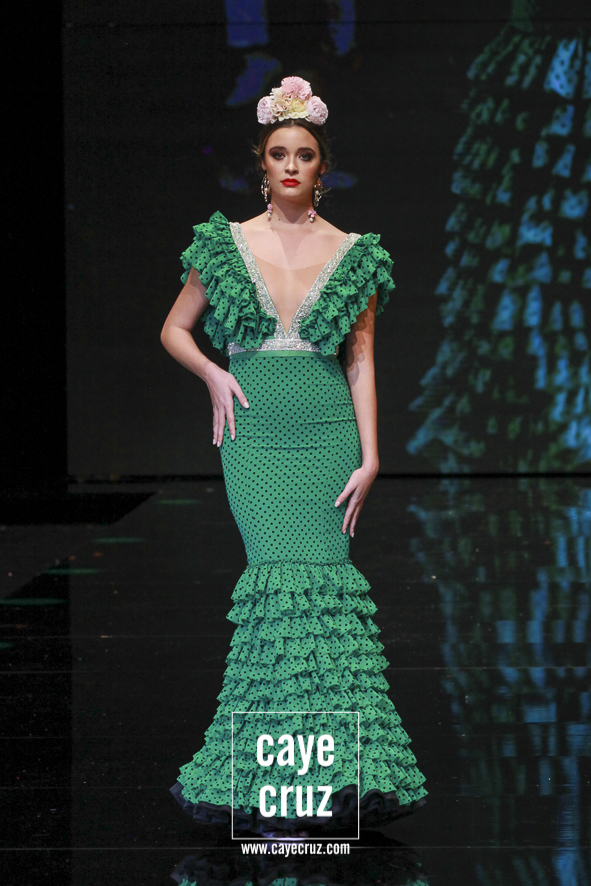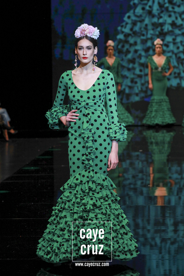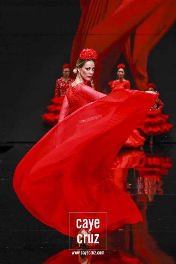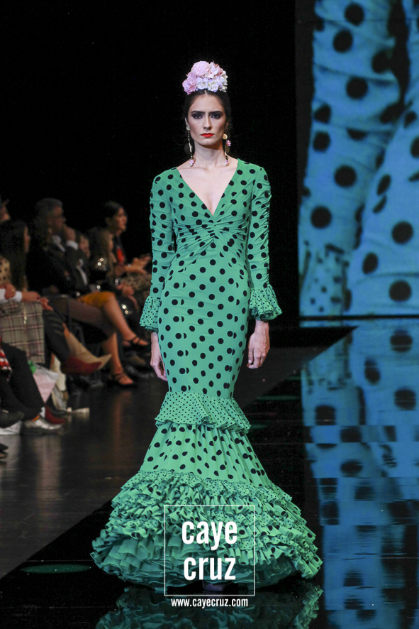 Mairena ante todo. Las cuatro partes en que se divide la colección también parece remitir a diferentes motivos propios de la tierra de la diseñadora. La Feria, el flamenco, la Semana Santa o la riqueza del paisaje de la campiña sevillana están detrás de ese verde sobre lunar negro, de esas flores estampadas, de esa elección de encajes o de ese rojo que se presta a diferentes estilo de flamencura.