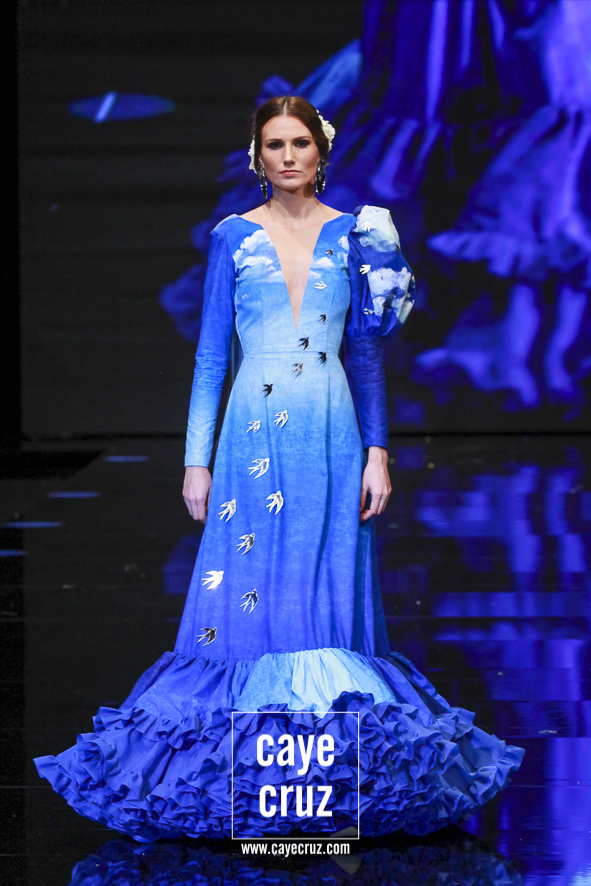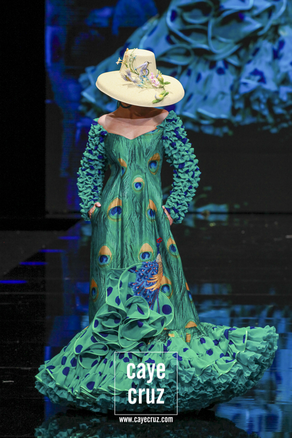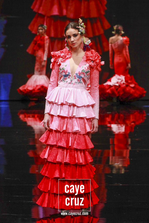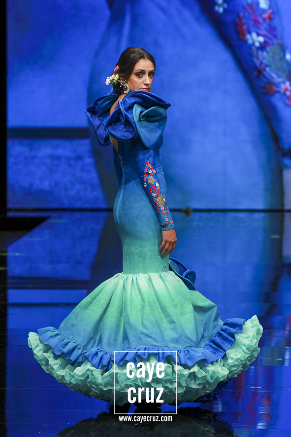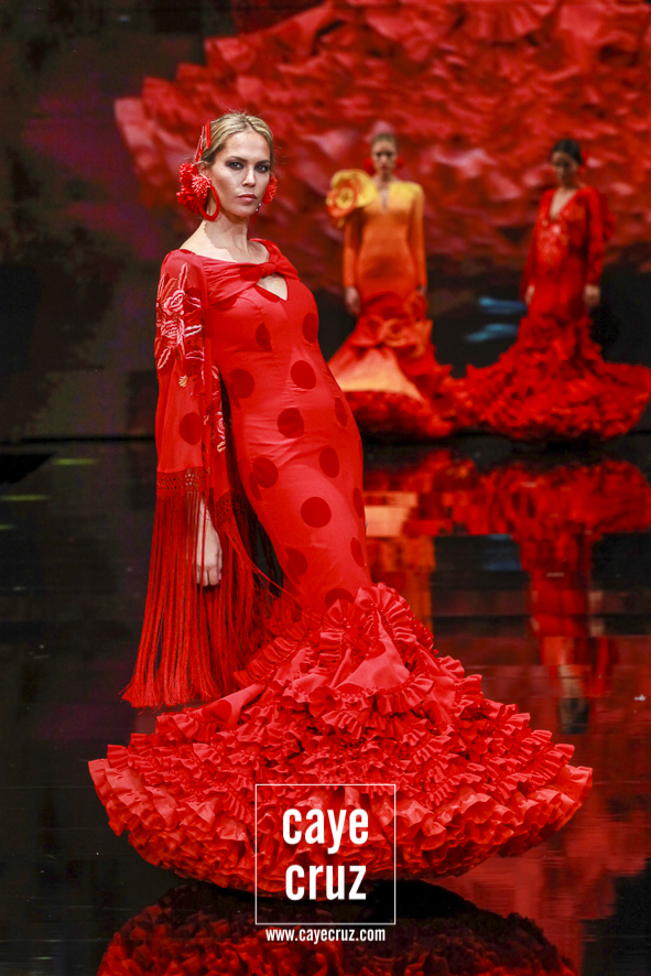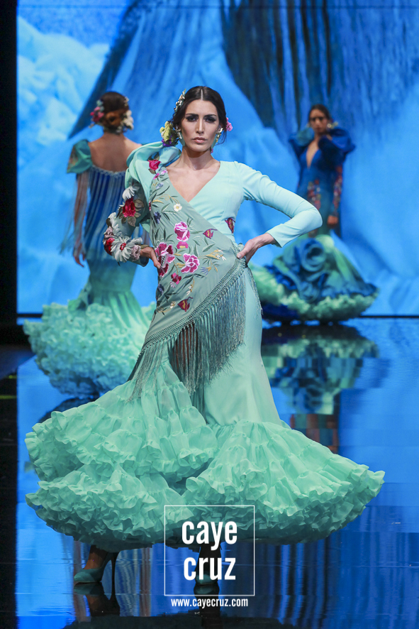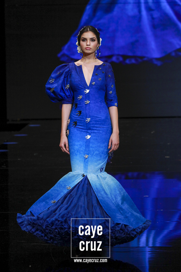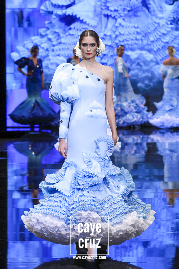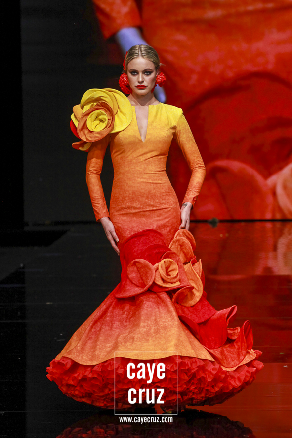 El universo Morón existe… y así se queda. La trayectoria de Ana Morón es sin duda una de las más profusas de toda la flamenca en tanto que ella misma ha curtido un estilo particular que, año a año, se ha entregado a sus bocetos, pero al mismo tiempo ha ido desarrollando un universo creativo que, con el paso del tiempo y de manera lógica, empieza a mantener ideas que se quedan: los mantones o mantoncillos patronados sobre el cuerpo, los flecos, las carruchas de grandes dimensiones o los bordados son las señas de identidad que en ‘Elements’ acompañan a degradados, pétalos y a las formas nuevas que aparecen en mangas y faldas.