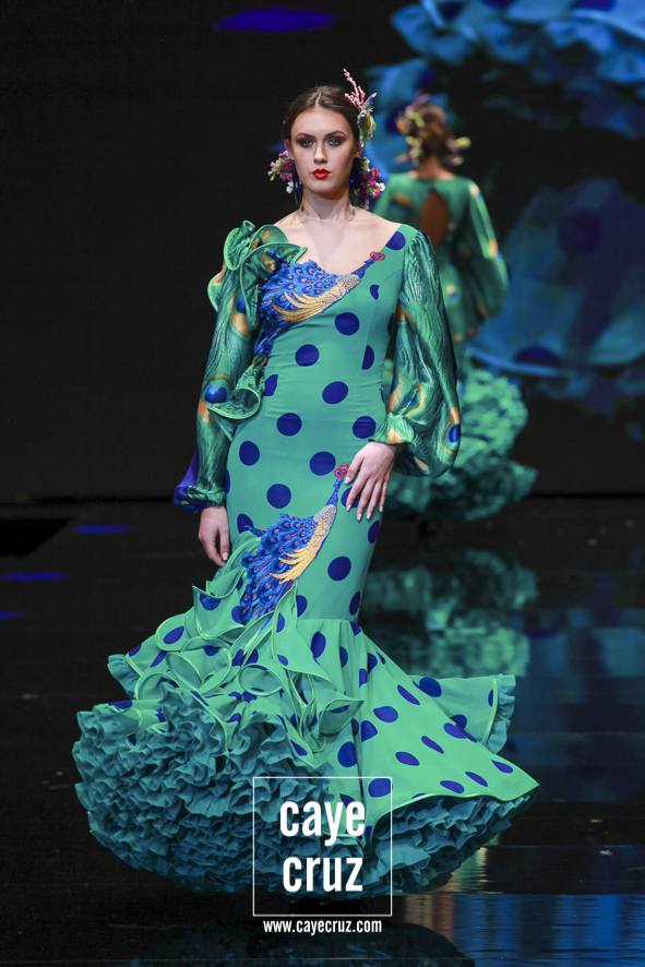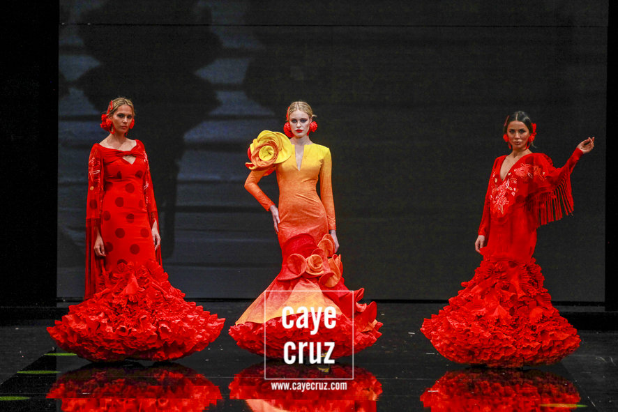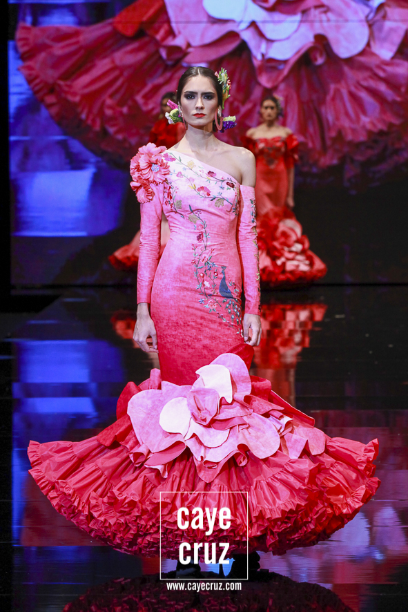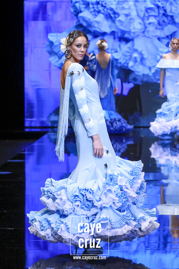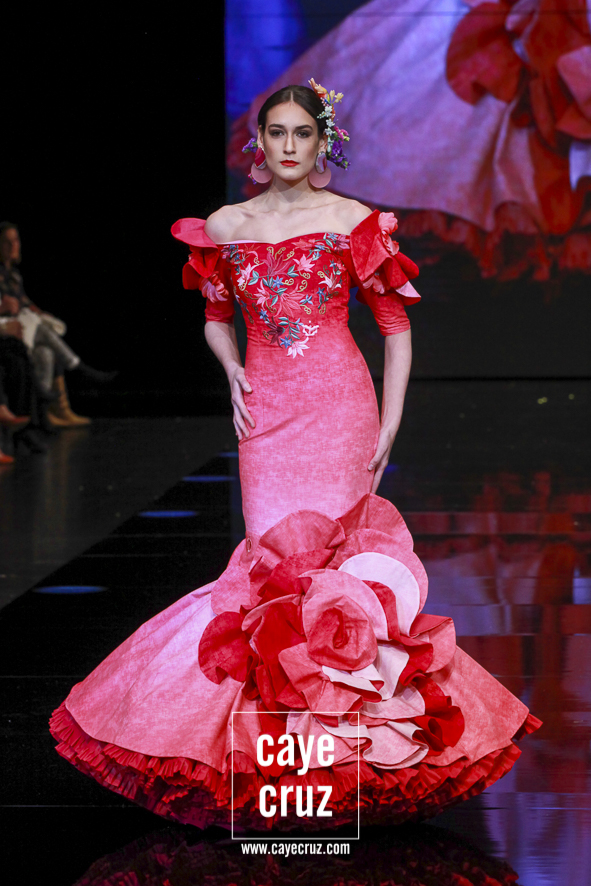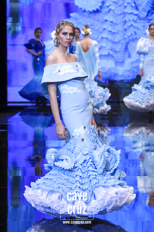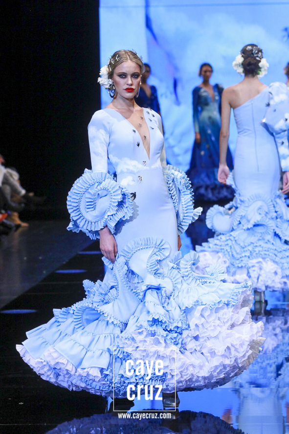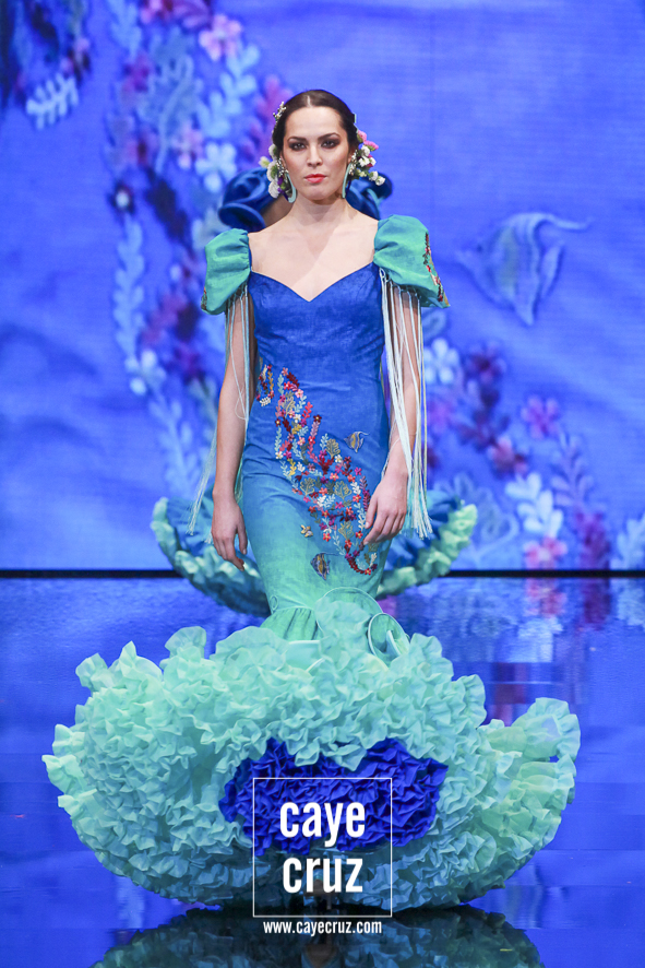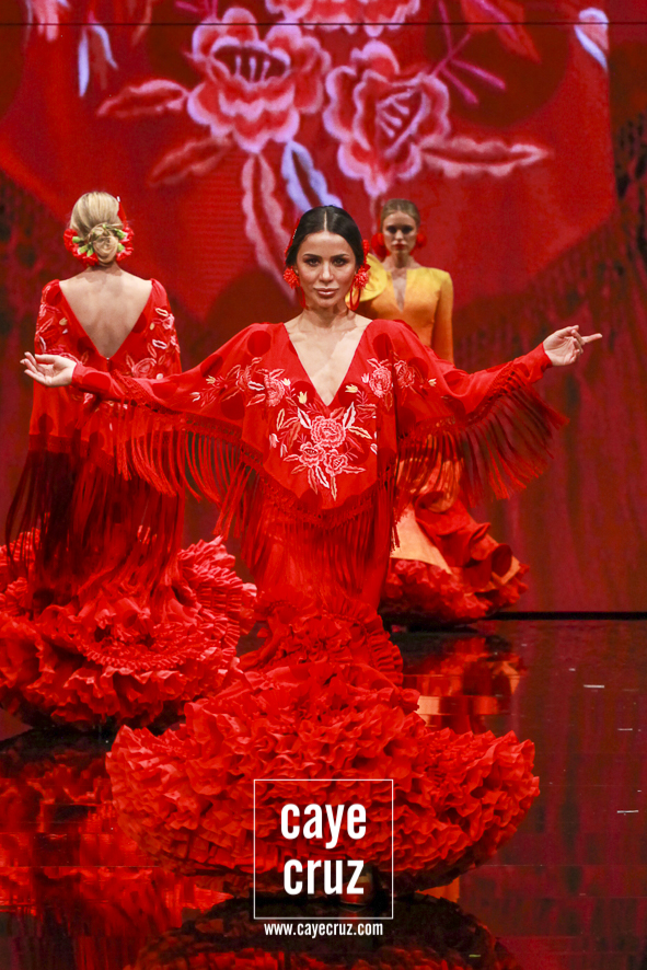 El universo Morón existe… y así se queda. La trayectoria de Ana Morón es sin duda una de las más profusas de toda la flamenca en tanto que ella misma ha curtido un estilo particular que, año a año, se ha entregado a sus bocetos, pero al mismo tiempo ha ido desarrollando un universo creativo que, con el paso del tiempo y de manera lógica, empieza a mantener ideas que se quedan: los mantones o mantoncillos patronados sobre el cuerpo, los flecos, las carruchas de grandes dimensiones o los bordados son las señas de identidad que en ‘Elements’ acompañan a degradados, pétalos y a las formas nuevas que aparecen en mangas y faldas.