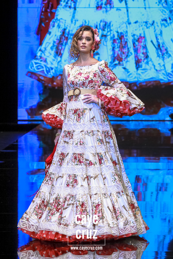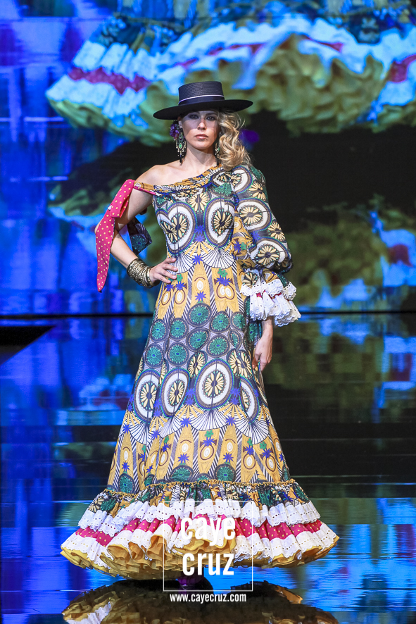 El Rocío con el que soñarás. De toda la parte de la colección es inevitable pensar en como brilla el inicio que nos invita justo a la salida, al camino o a la presentación. Una visión personal pero pura de la flamenca rociera, con los aderezos suficientes para dar espectacularidad en pasarela y trasladarlo luego a la Aldea.