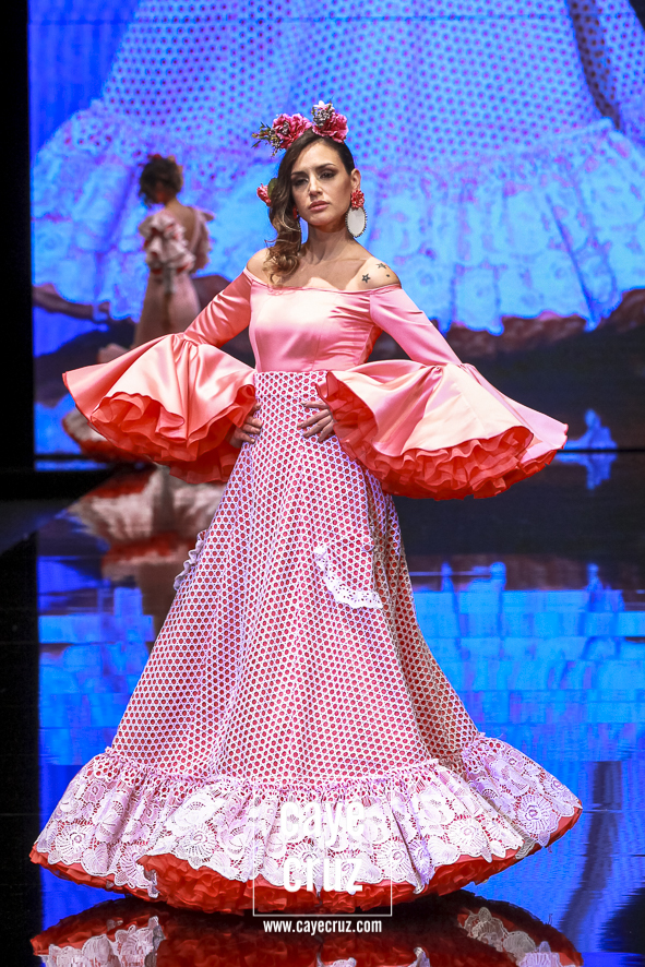 … Pero no solo del Rocío vive la costura. El cierre de la colección se reserva para una flamenca más de fiesta o más llamativa en la que estampados y lunares se cambian por aplicaciones y bordados florales junto a diseños en colores lisos que buscan llamar la atención de las flamencas de las otras fiestas grandes del Condado: las Cruces. Sean de Rociana, Bonares o La Palma, lo que Alonso encajaría con el estilo de estas flamencas que buscan un aire más festivo o opulento, dejando a un lado otra clase de tejidos o ideas. Se cierra así un desfile que es un canto a su tierra en un año muy especial y en el que se incluye, de manera consciente o no, la esencia flamenca de toda esta zona de Huelva.