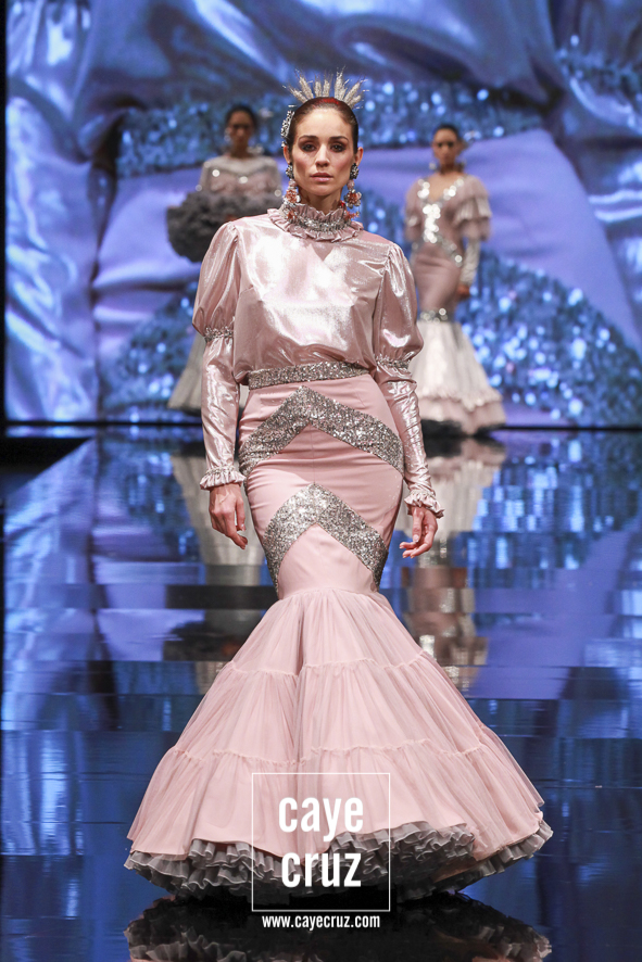 Lentejuelas, brillos y estampados recuperando espacio (y compartiéndolo). Tal como decíamos, tras tres colecciones donde los hemos visto casi de manera testimonial (cierto es que no se les echaron en falta), el minimalismo en el uso de texturas ha dado paso a una colección donde la profusión de colores, tejidos, estampados o brillos han sido la clave definitoria de ‘Bendita’. Quizá haciendo referencia a la flamenca de noche o quizá haciendo esa fusión del punto anterior. Sea como sea la flamenca de Javier García se ha vestido con unos tejidos que reclamaban la atención del diseño (y de los espectadores) como también lo ha hecho el oportunamente recargado trabajo de Lamágora en los complementos.