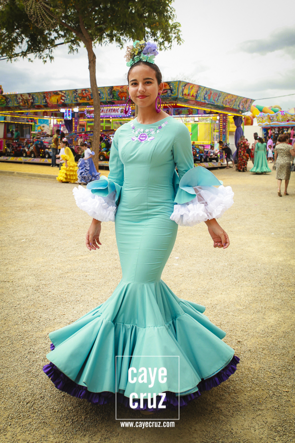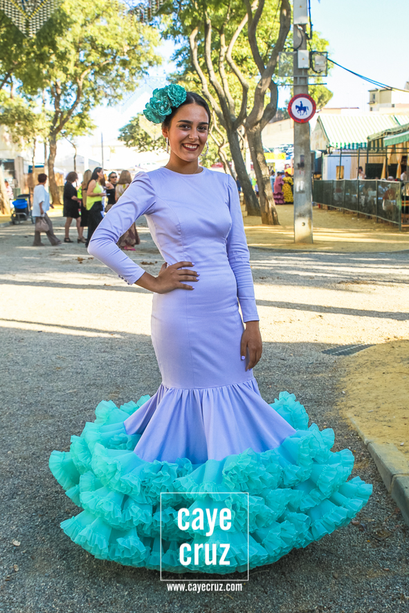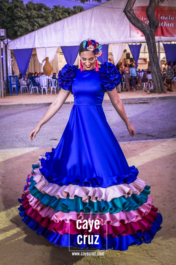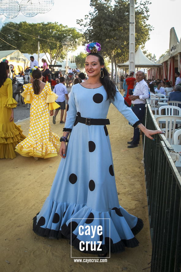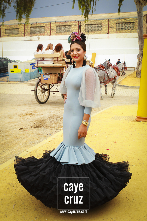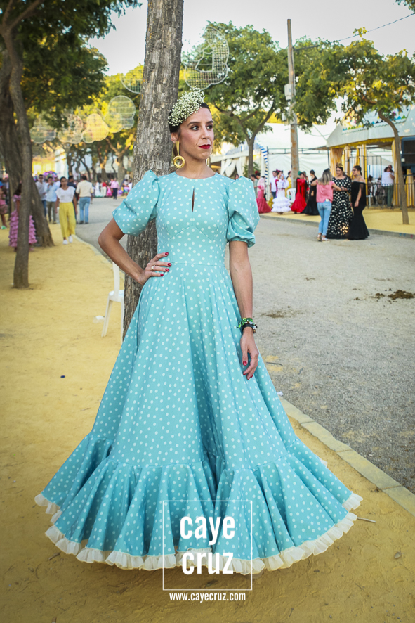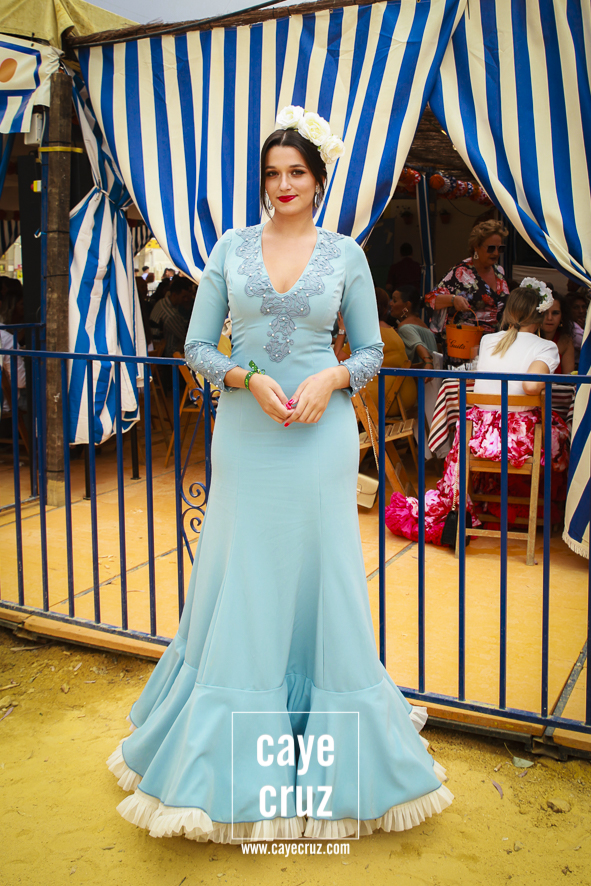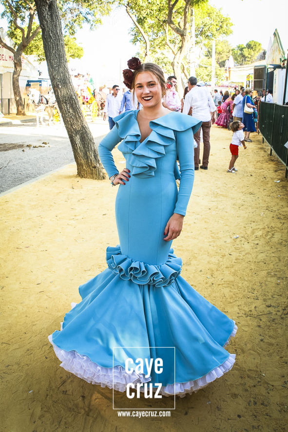 Protagonismo del celeste. En cualquiera de sus tonalidades o en todas directamente: muchas flamencas se han dejado llevar por el celeste en sus volantes, ya sea haciendo de su traje un color block o combinándolo con otros colores, pero siempre dejando al celeste el protagonismo. A ello ayuda que ya apenas se le ve como el color bebé que hace años se consideraba…