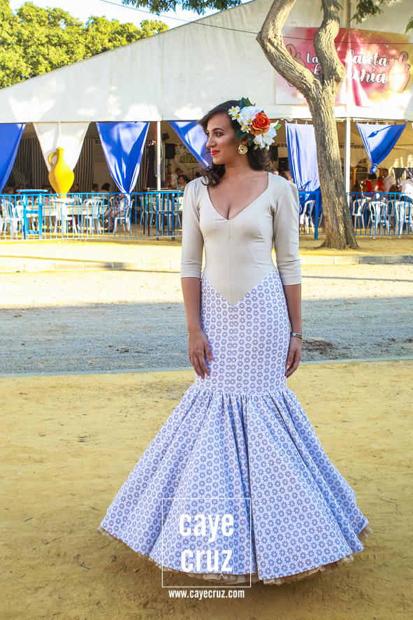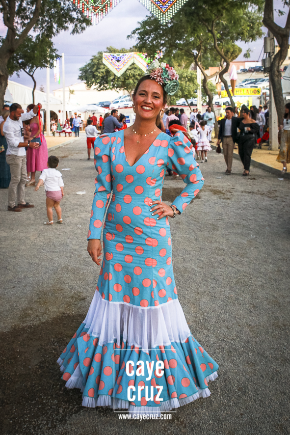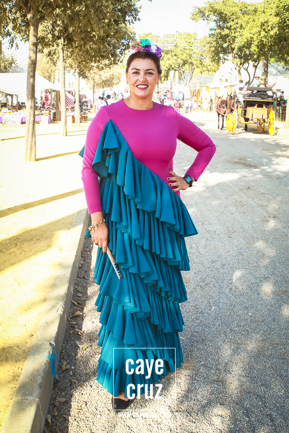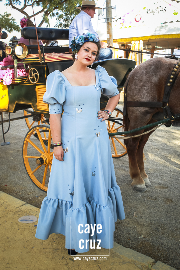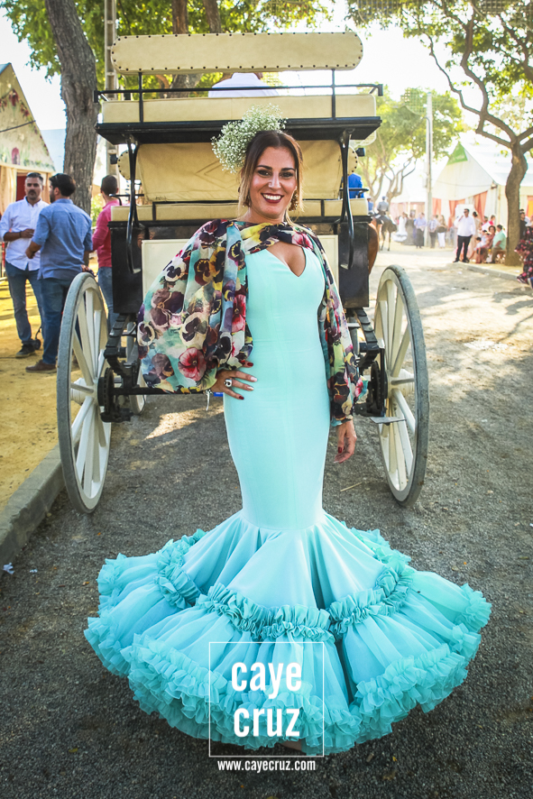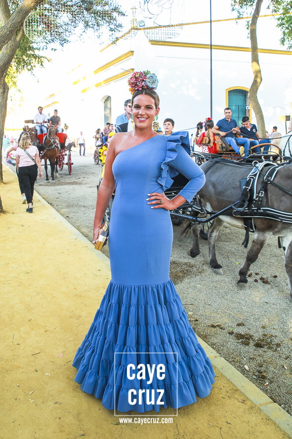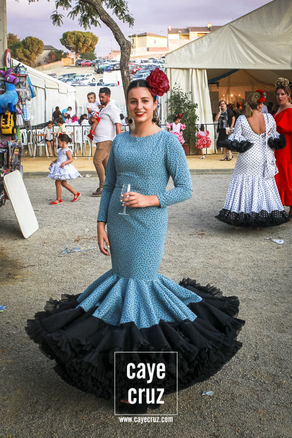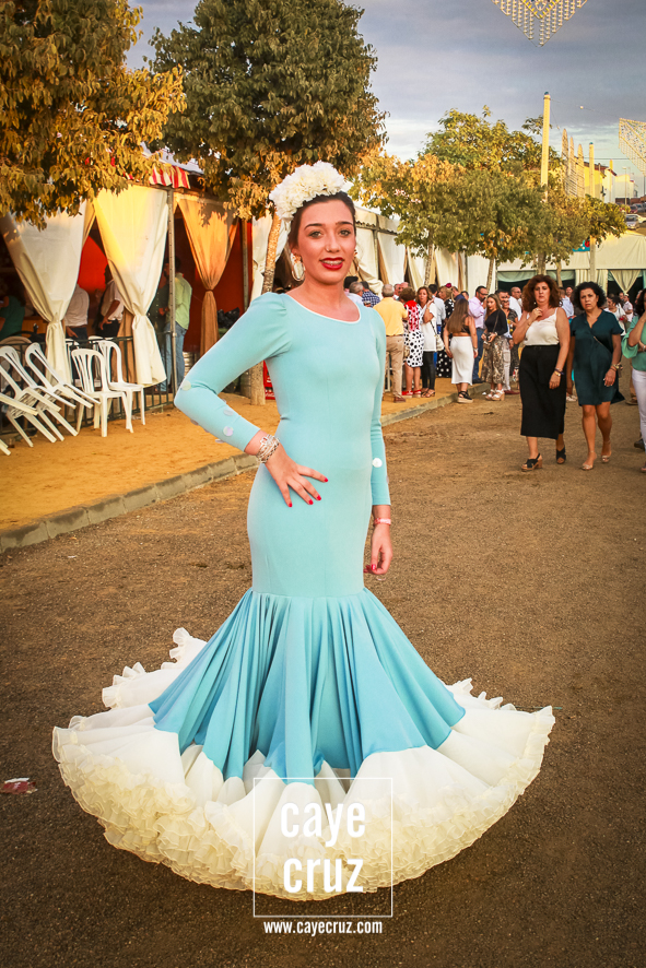 Protagonismo del celeste. En cualquiera de sus tonalidades o en todas directamente: muchas flamencas se han dejado llevar por el celeste en sus volantes, ya sea haciendo de su traje un color block o combinándolo con otros colores, pero siempre dejando al celeste el protagonismo. A ello ayuda que ya apenas se le ve como el color bebé que hace años se consideraba…