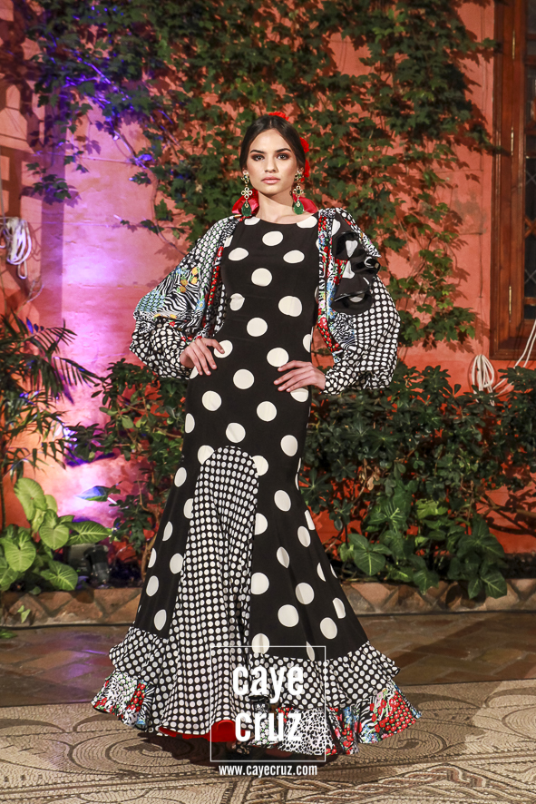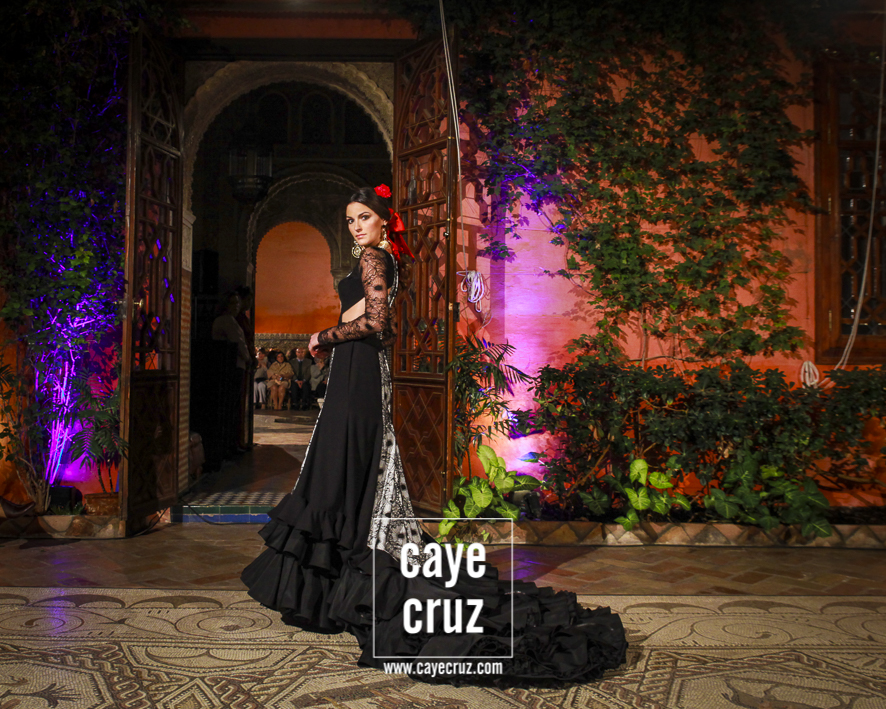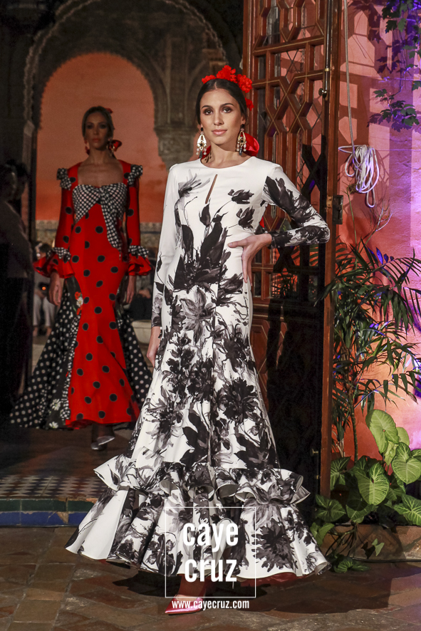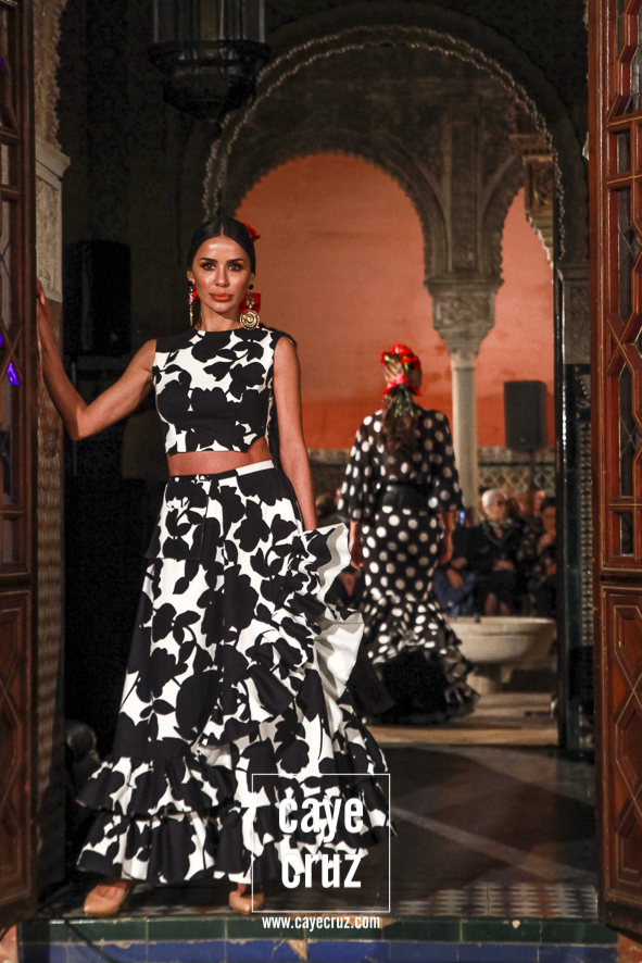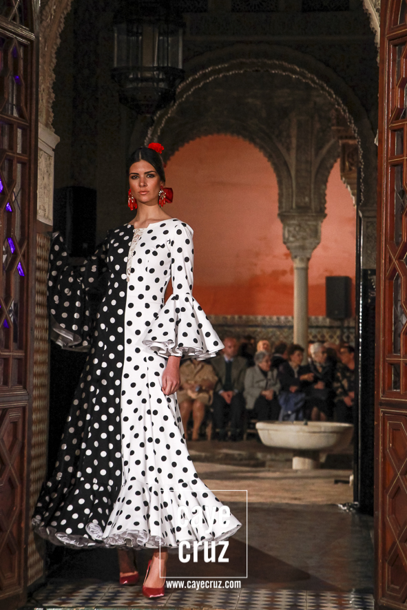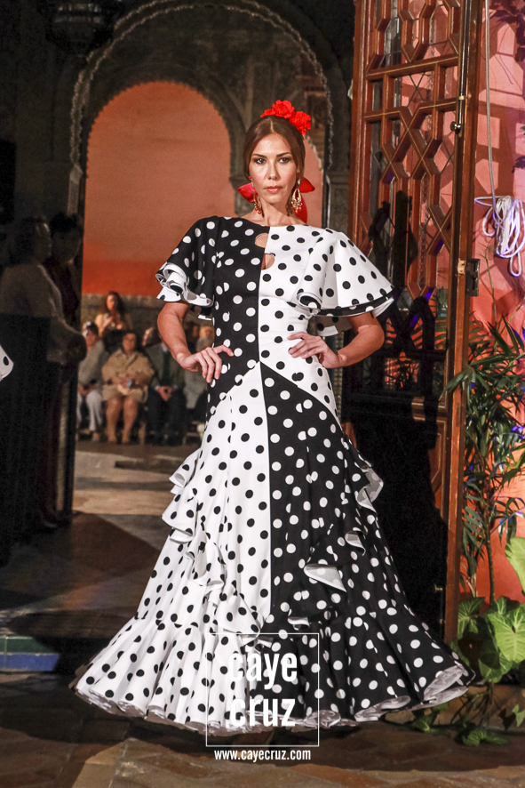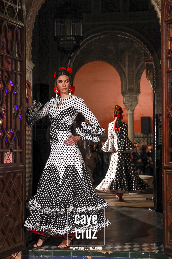 Blanco y negro: sin flamenco no hay flamencas. Es la combinación más usada, la más efectiva, la que hace flamenco aquello que toca, la que cualquier mujer que ame los volantes debería tener en su particular armario de flamenca. El binomio de blanco y negro (con lunares entre medio) aparecían de manera salpicada entre las salidas del desfile, pero cumplían con su cometido: te enganchaban, hacía que el traje lo memorizaras a la primera e incluso combinaban los patrones de la Lina de siempre con detalles en técnicas que eran un toque de atención o un recordar que muchas cosas en flamenca se inventaron hace años.