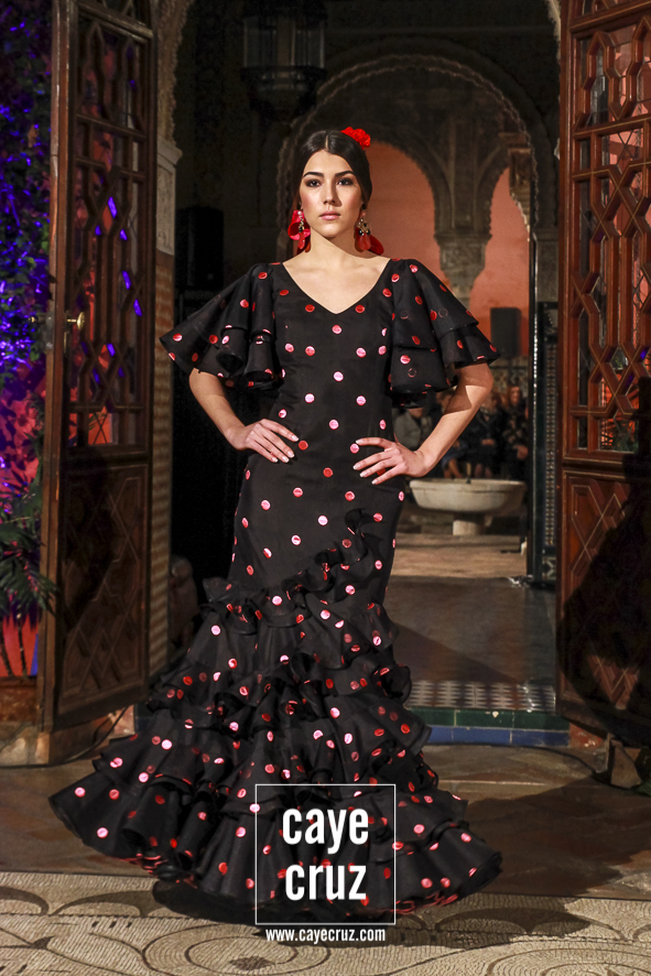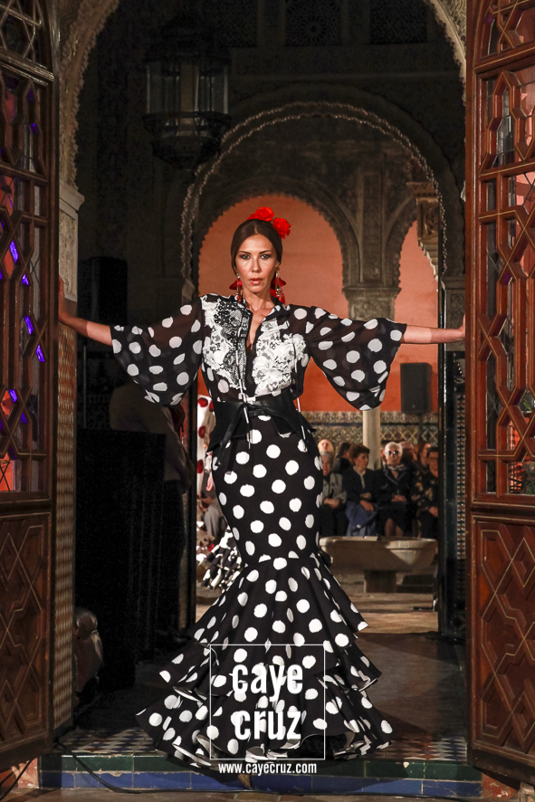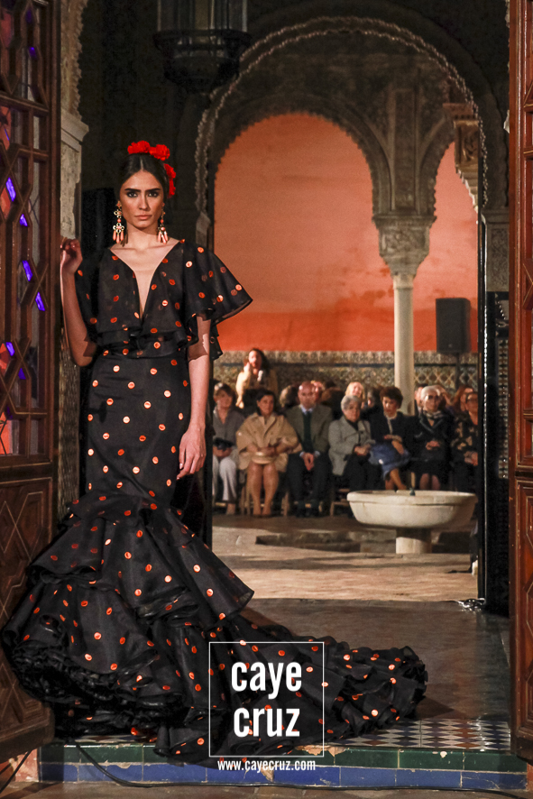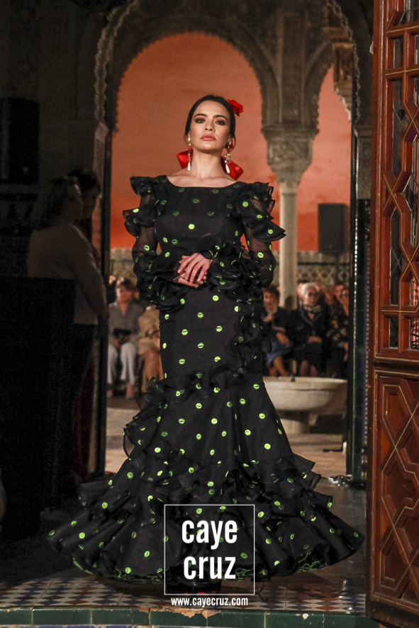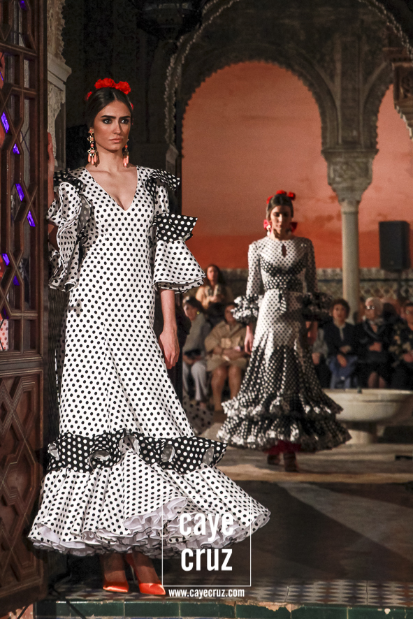Iconografía del traje… y del tejido flamenco. Una de las peculiaridades del desfile es que a través del mismo vamos viendo no solo la evolución del traje de flamenca, también como algunos materiales han tenido su momento a la hora de marcar ciertas tendencias o épocas. Valga como ejemplo reciente el plumetti: hace casi 10 años era la estrella de los muestrarios, ahora está casi olvidado y Lina lo recupera en varias salidas. Lo mismo hace con el cristal negro con lunares bordados (tan propio de las folclóricas a finales de los 80) o con el popelín en tonalidades ocres o apasteladas de lunares casi pegados. Todos ellos hitos las últimas tres décadas de la flamenca entre los que también hay estampados con cierta abstracción (tan de moda a mediados de la década de los 2000), los toques florales de hoy día o, por supuesto, los perforados que desde siempre han estado con Lina.