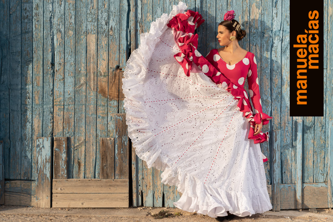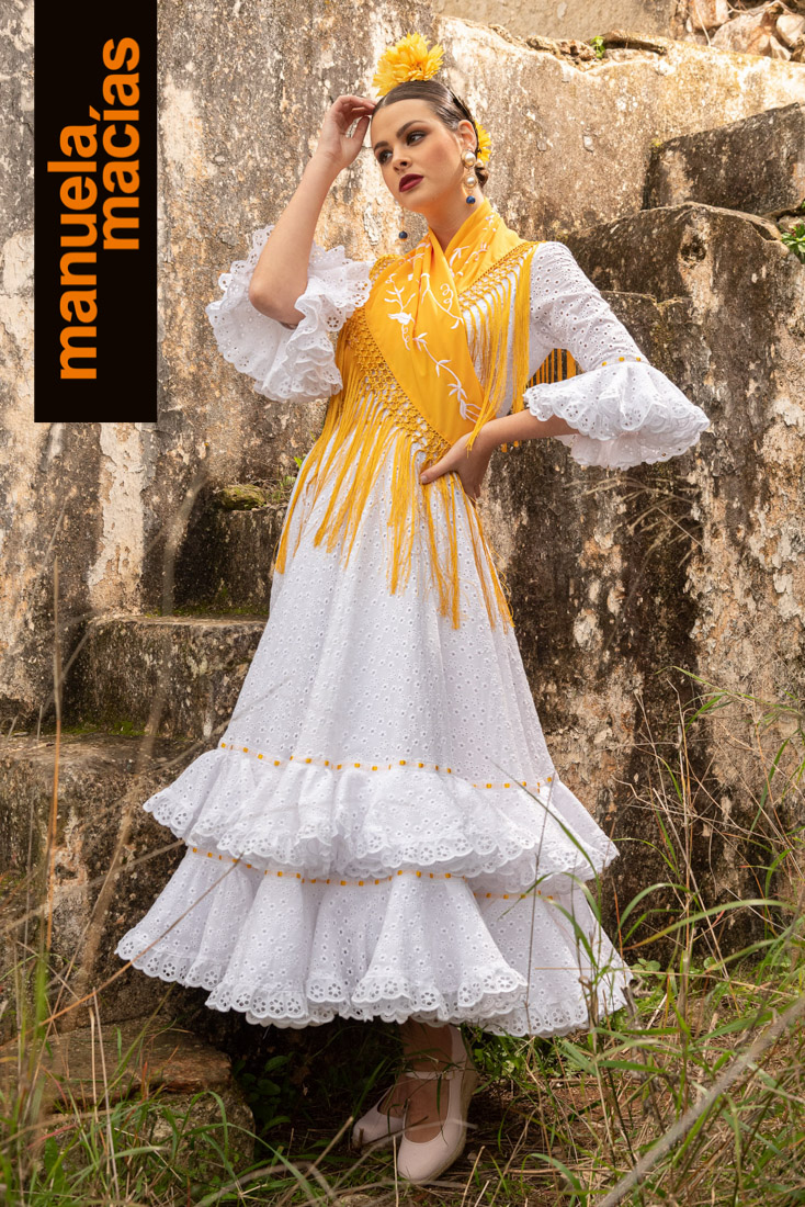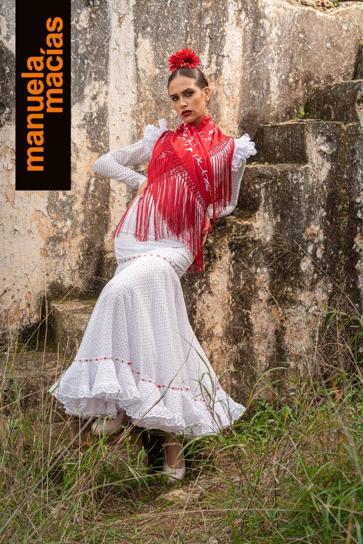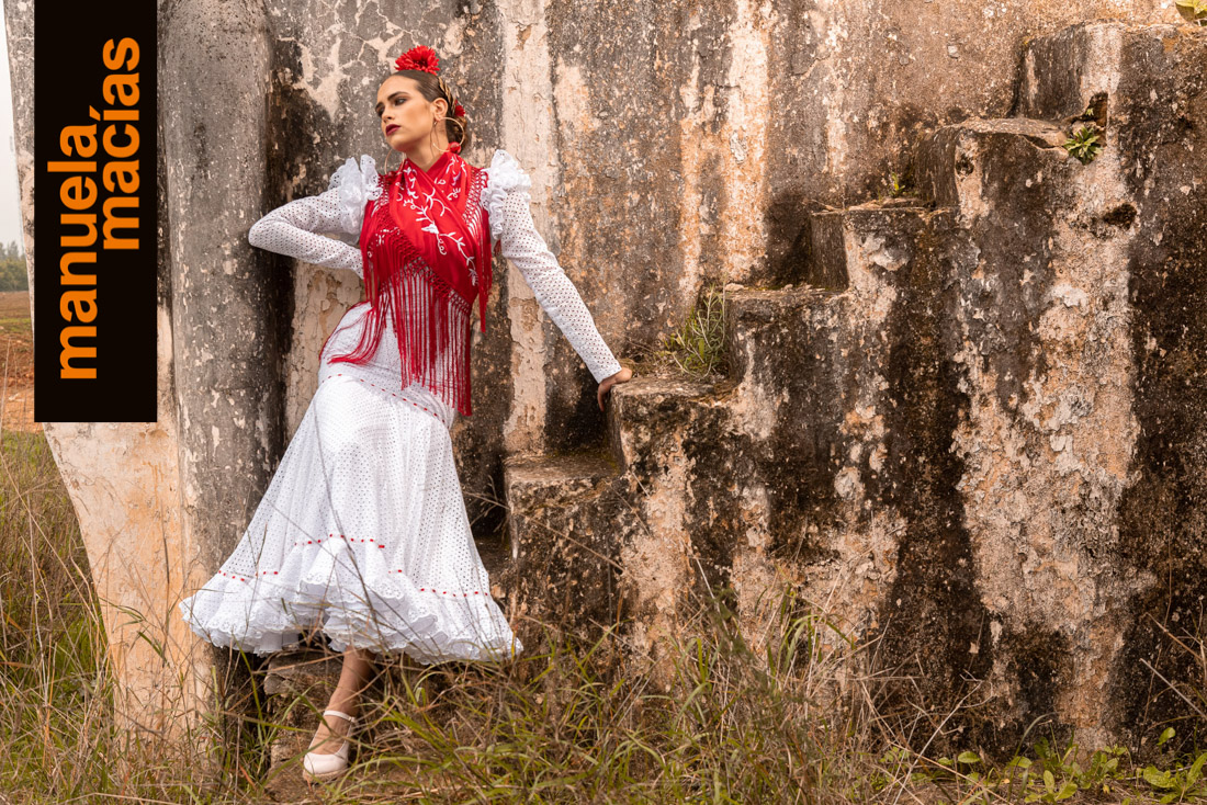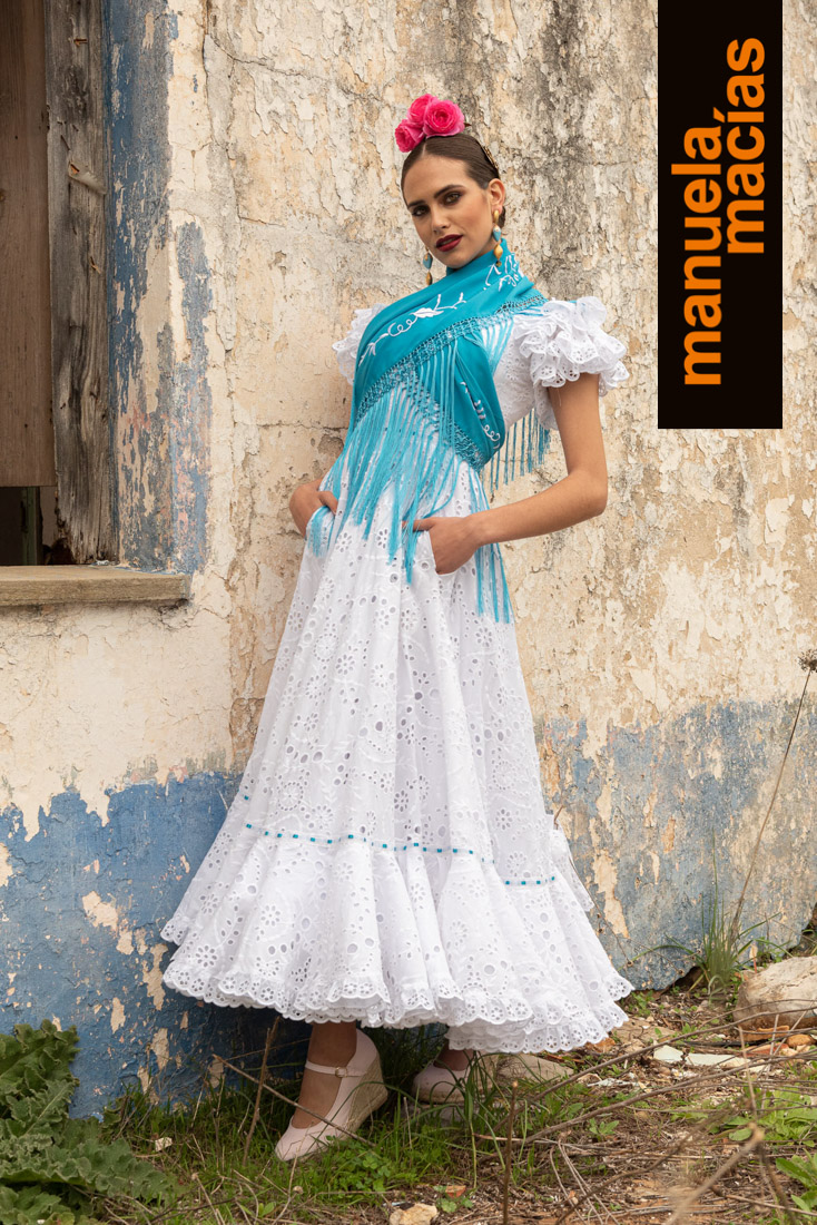Largo tobillero. Dejando a la vista los zapatos pero sin llegar a la tendencia del largo midi. Si a eso le añades el diseño de una bata blanca perforada con sus pasacintas tienes uno de esos fondos de armario flamenco que saben hacerse con el matiz atemporal pero que también se integra en el momento actual ya que el subir los largos es una de las ideas que visten a la flamenca del 2020. Una apuesta personal de Manuela Macías que apunta directa al Camino.