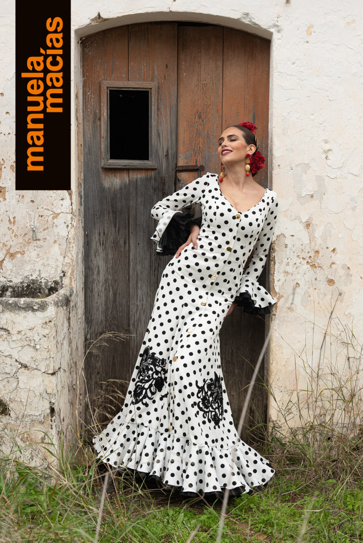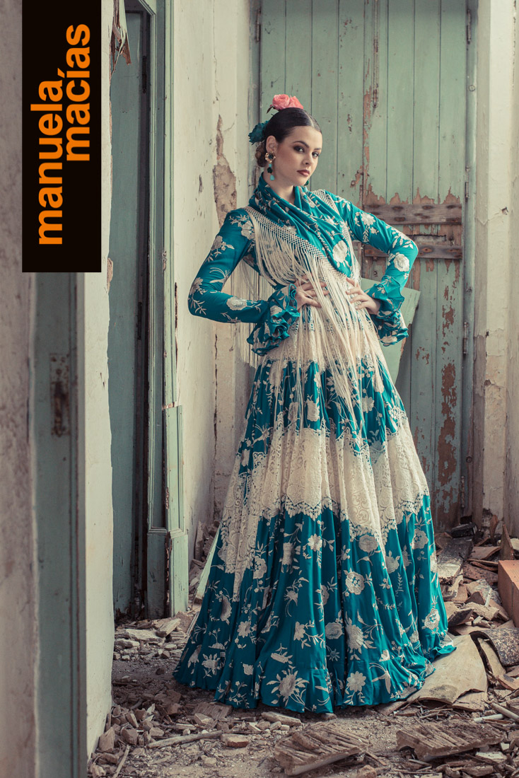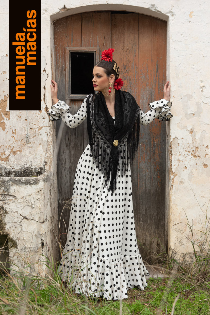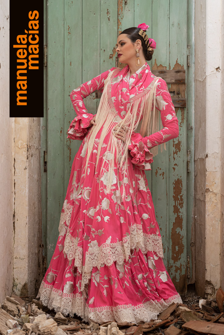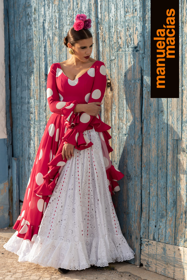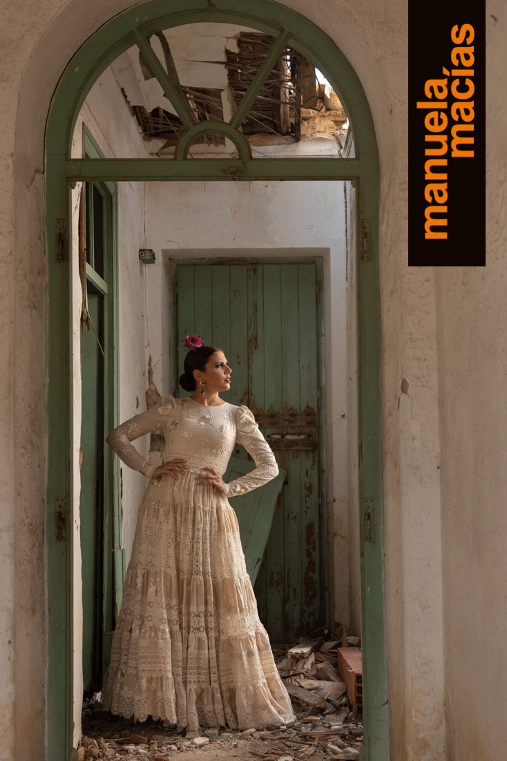 Largo tobillero. Dejando a la vista los zapatos pero sin llegar a la tendencia del largo midi. Si a eso le añades el diseño de una bata blanca perforada con sus pasacintas tienes uno de esos fondos de armario flamenco que saben hacerse con el matiz atemporal pero que también se integra en el momento actual ya que el subir los largos es una de las ideas que visten a la flamenca del 2020. Una apuesta personal de Manuela Macías que apunta directa al Camino.