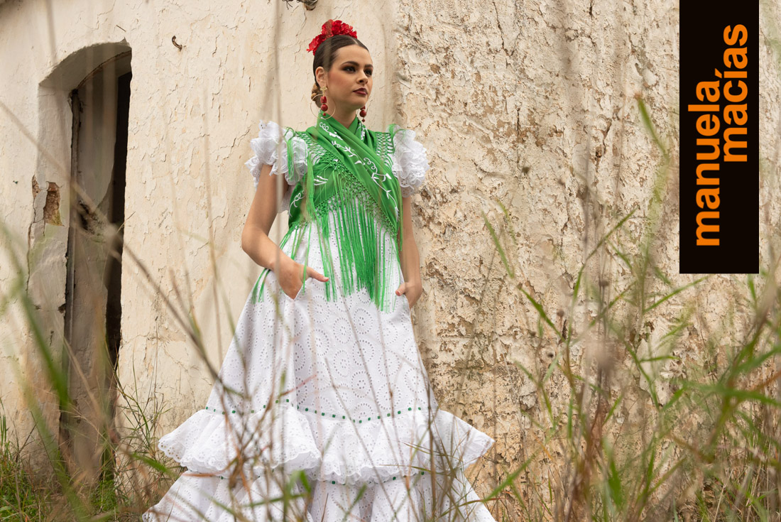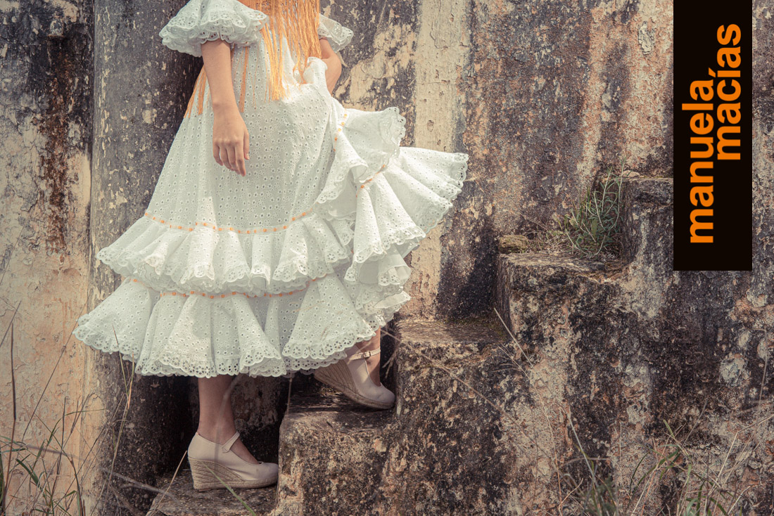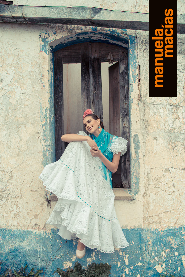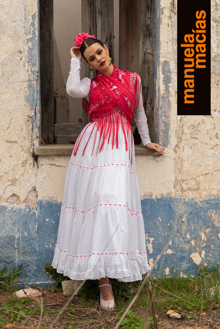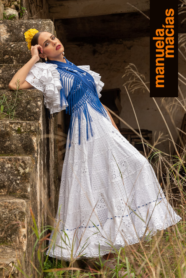 Volantes al hombro. En telas perforadas o con tiras y a ser posible en blanco. Si le acompañas un mantoncillo o una falda de las del punto anterior, se consigue ese aire de romería que nunca se pierde y que en Manuela Macías se redescubre tanto en blusas como en volantes al hombro de trajes enterizos.