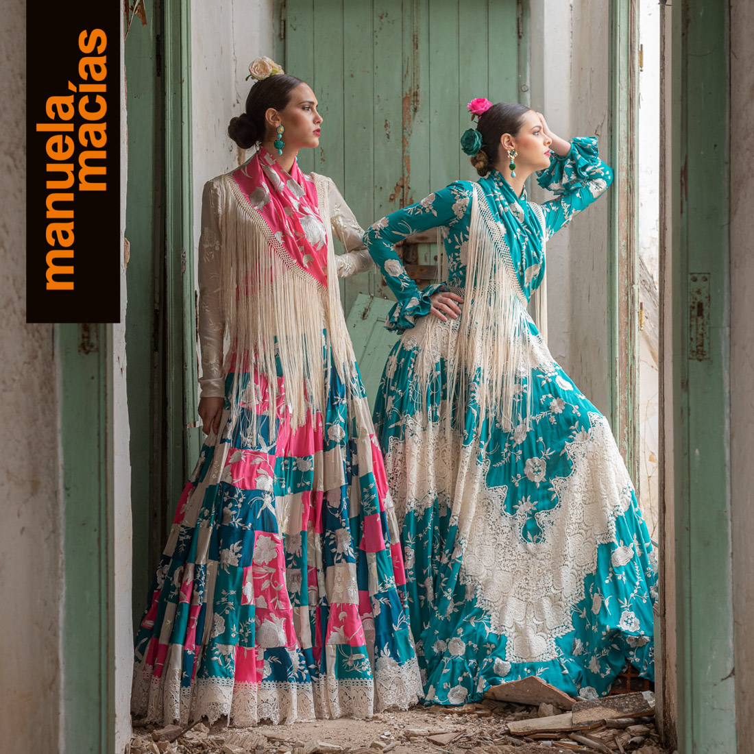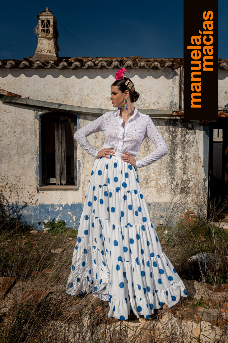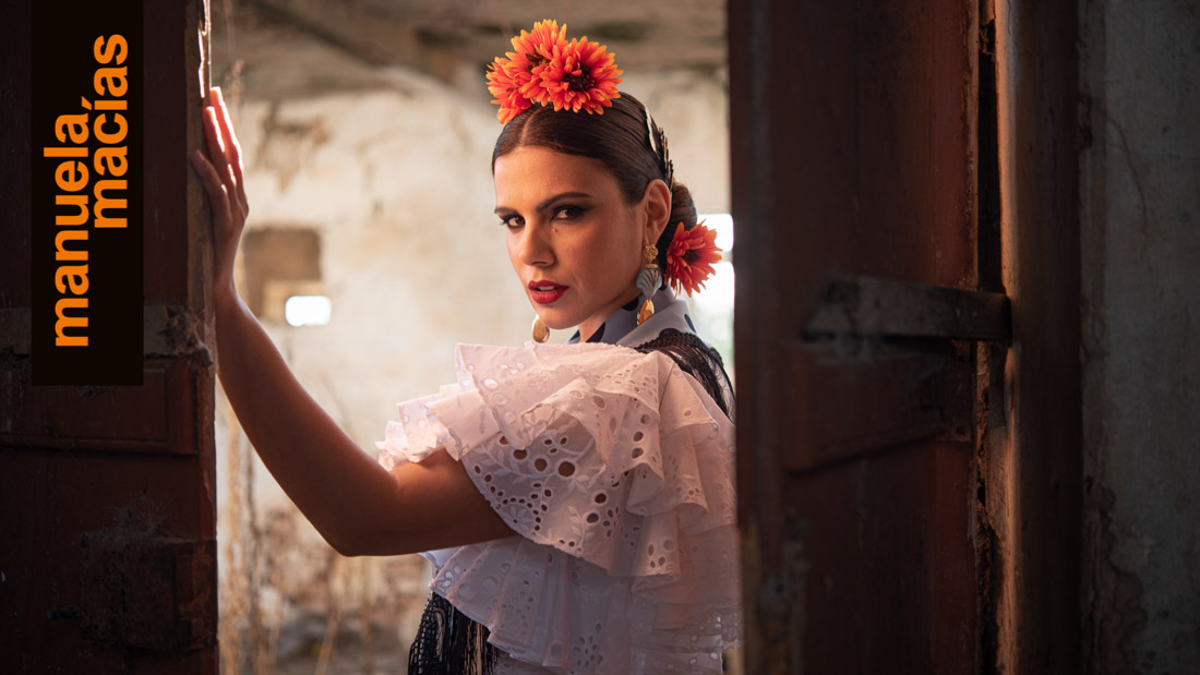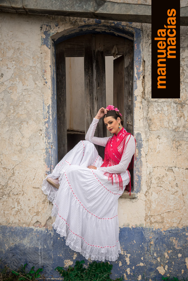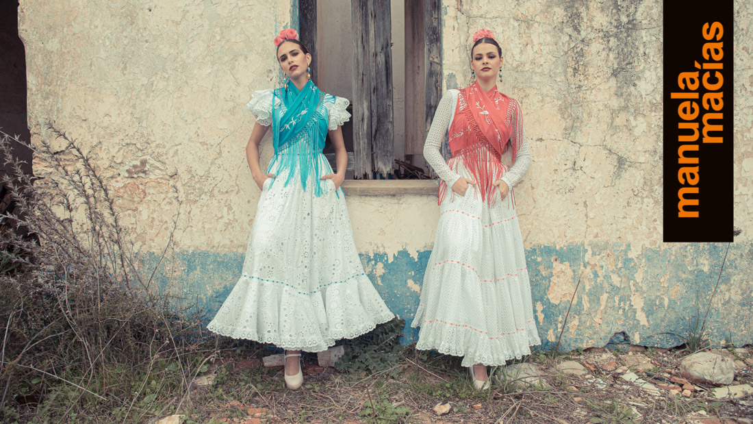 Volantes al hombro. En telas perforadas o con tiras y a ser posible en blanco. Si le acompañas un mantoncillo o una falda de las del punto anterior, se consigue ese aire de romería que nunca se pierde y que en Manuela Macías se redescubre tanto en blusas como en volantes al hombro de trajes enterizos.