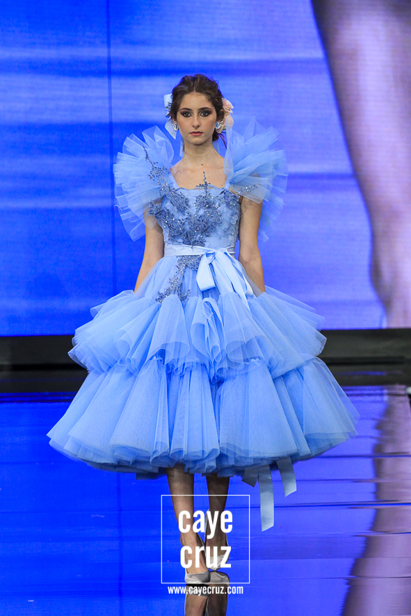 A ello se une tanto la elección de texturas como de colores: tules, brocados, plisados o tramas en 3D se asientan sobre el gris, el negro, el rosa o el celeste, haciendo una evolución gradual donde incluso hay sitio para los lunares y en el que se invita a hacer una lectura relajada de cada detalle, de leer entre líneas por qué cada diseño van en ese color o en este tejido. ¿Se impacta? Si, pero no se ha buscado el aplauso fácil.