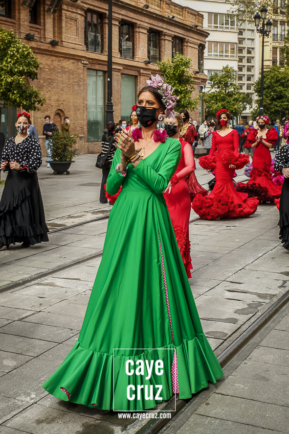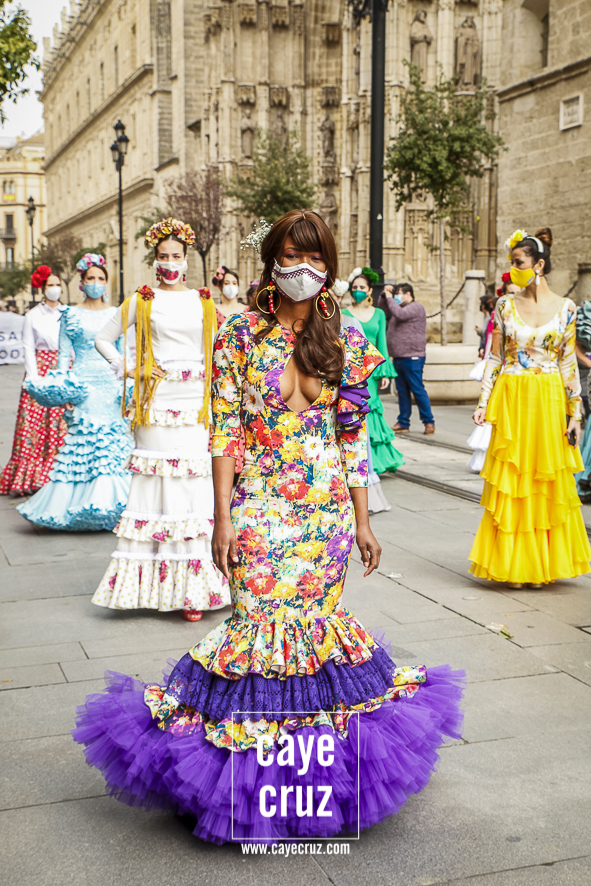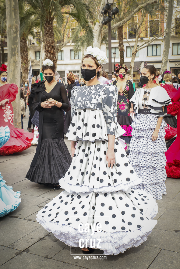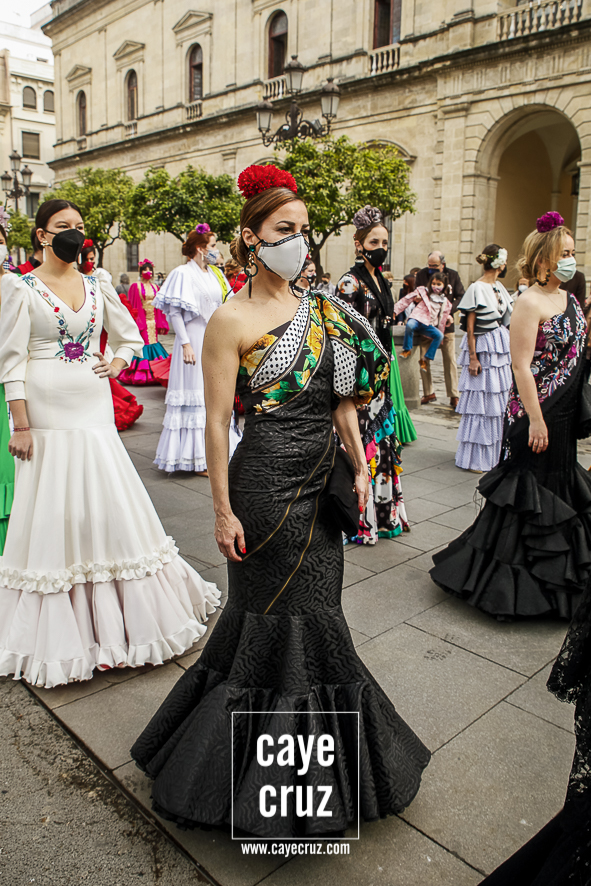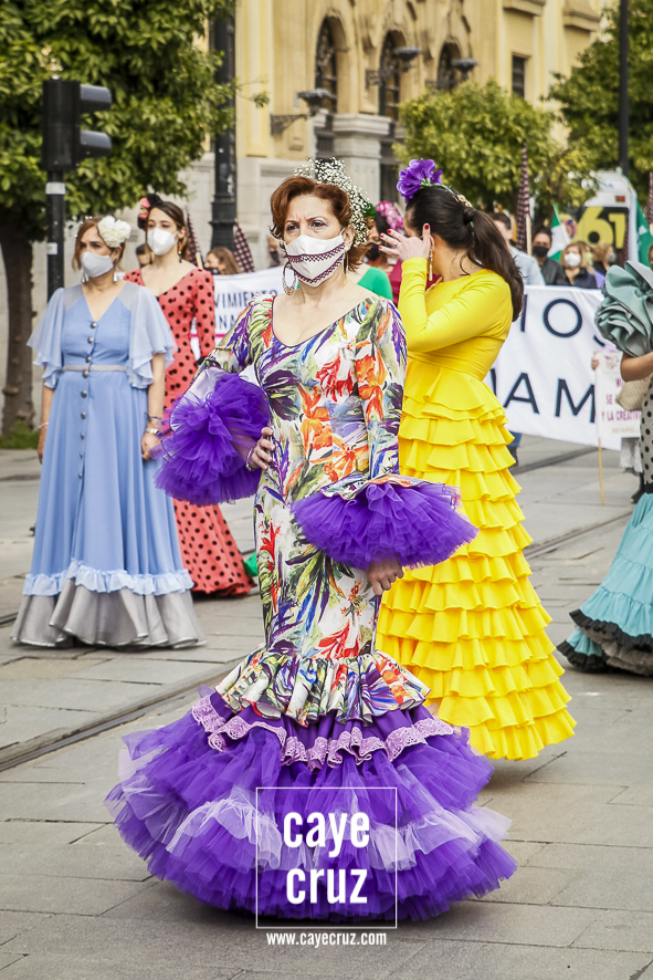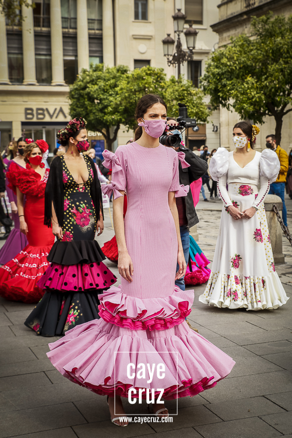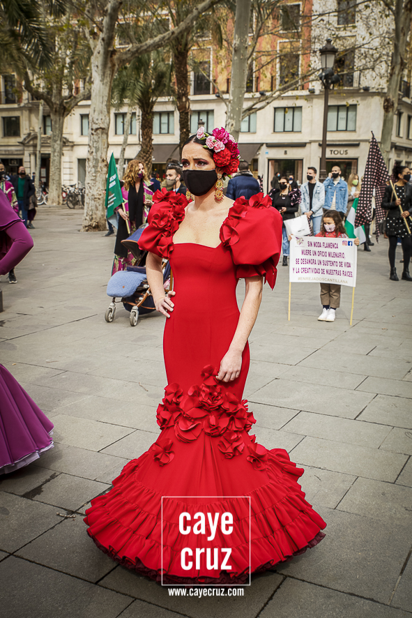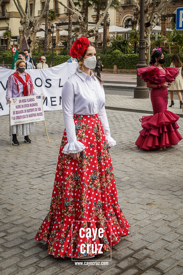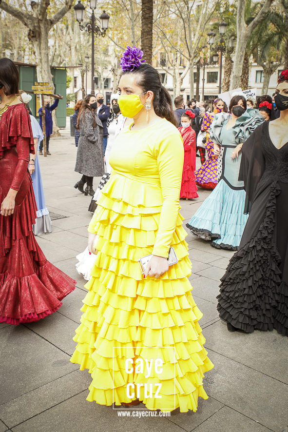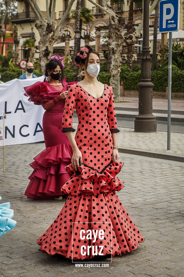 Castañuelas marcando el ritmo, decenas de curiosos y curiosas acercándose, flamencas de todo tipo, de cualquier parte de Andalucía y volantes de muchos colores que dejaron a un lado el luto del negro y pasaron a la reivindicación de un sector que ya no puede más: la moda flamenca salió de nuevo a la calle y, una vez más, demostró que el traje de flamenca, la flor en el pelo, el estilismo bien hecho o el costumbrismo que estamos «elevando» a días de celebrar nuestra autonomía, sigue siendo uno de nuestros mejores reclamos.