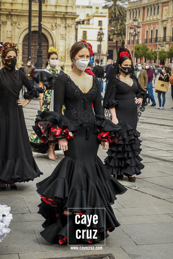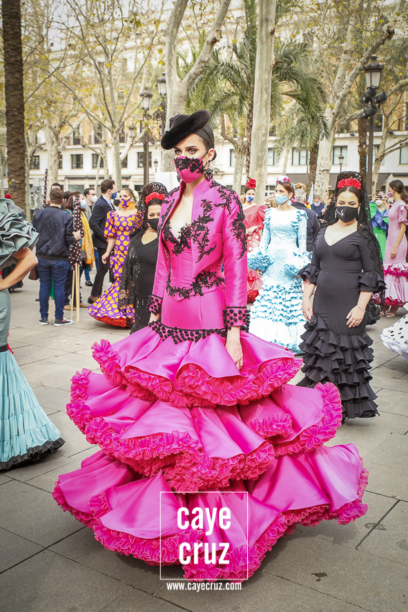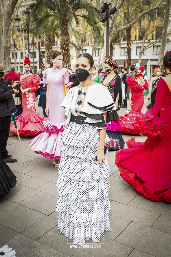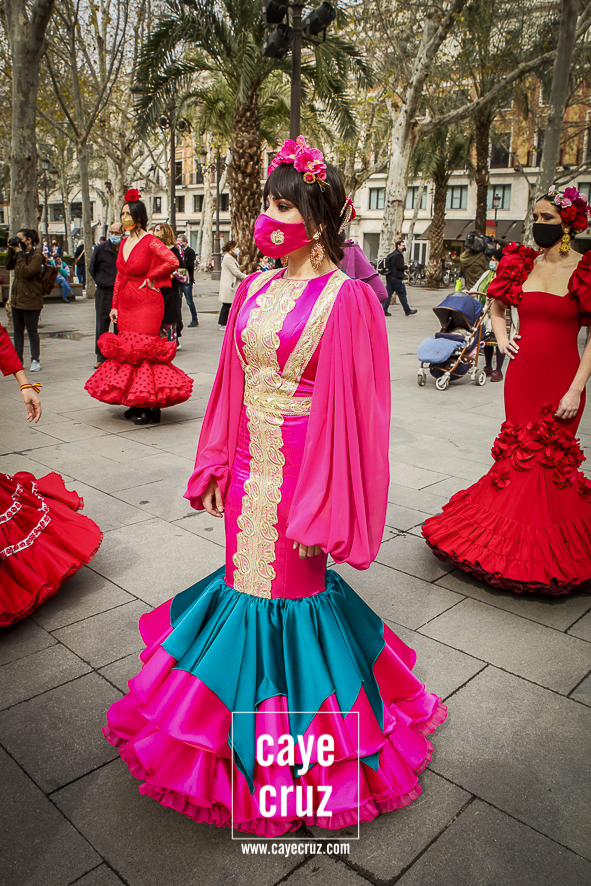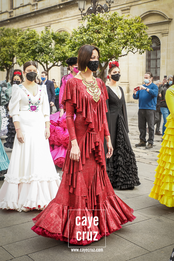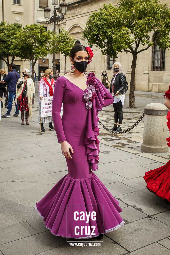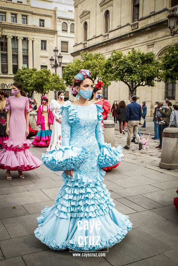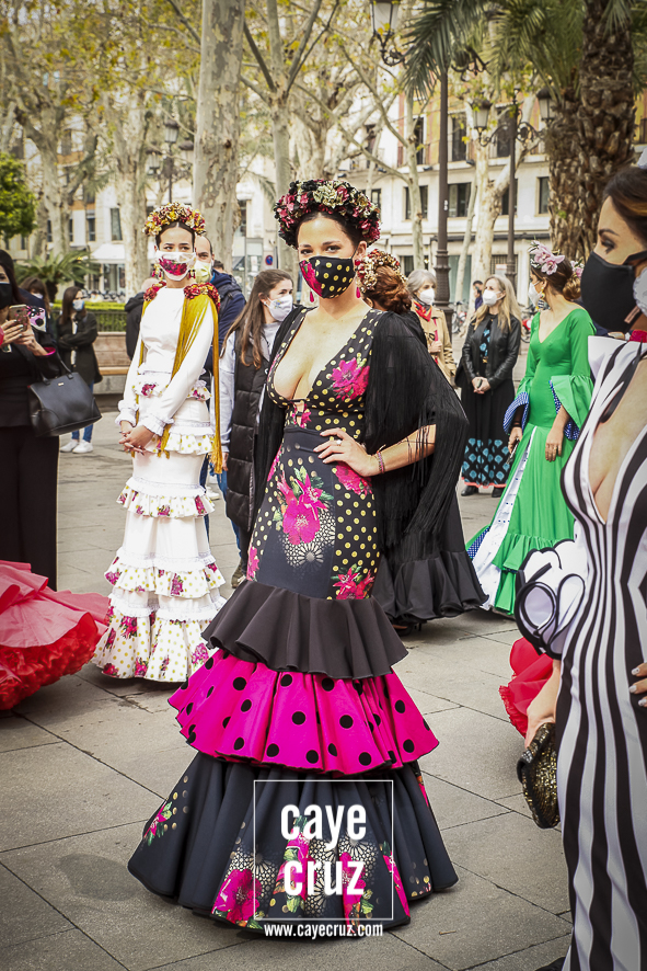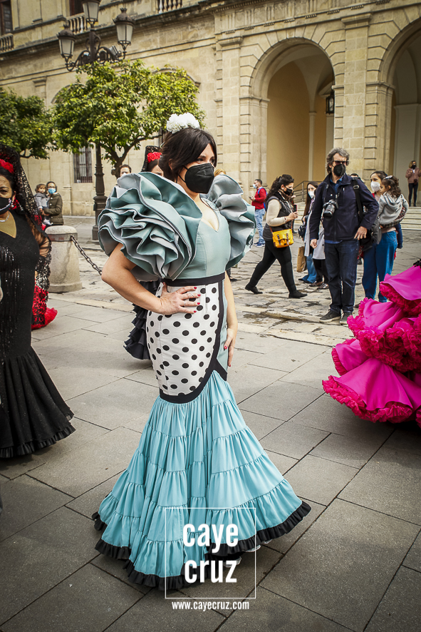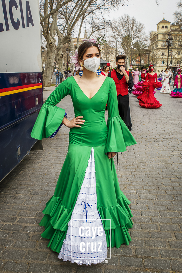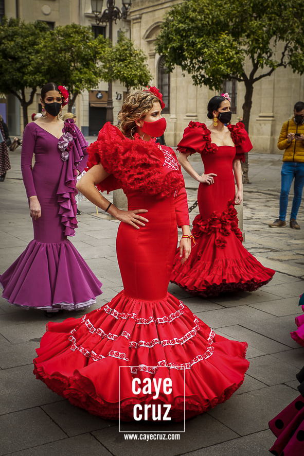 Castañuelas marcando el ritmo, decenas de curiosos y curiosas acercándose, flamencas de todo tipo, de cualquier parte de Andalucía y volantes de muchos colores que dejaron a un lado el luto del negro y pasaron a la reivindicación de un sector que ya no puede más: la moda flamenca salió de nuevo a la calle y, una vez más, demostró que el traje de flamenca, la flor en el pelo, el estilismo bien hecho o el costumbrismo que estamos «elevando» a días de celebrar nuestra autonomía, sigue siendo uno de nuestros mejores reclamos.