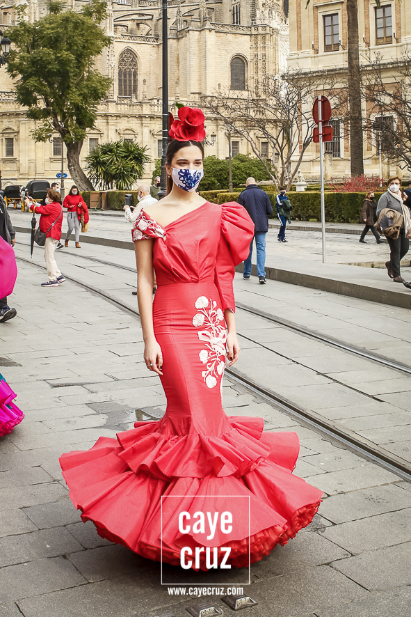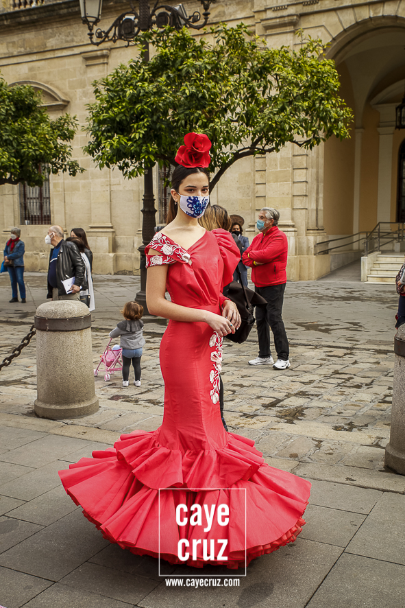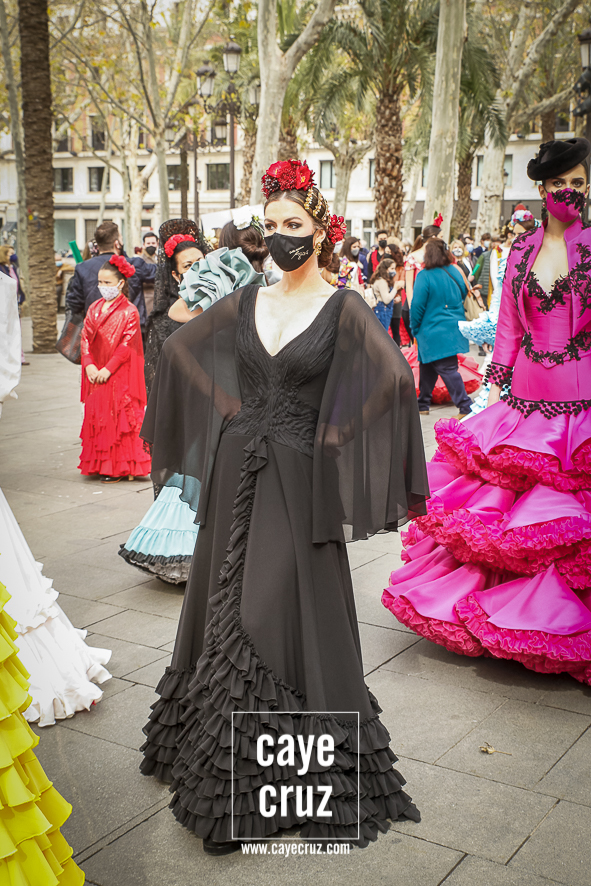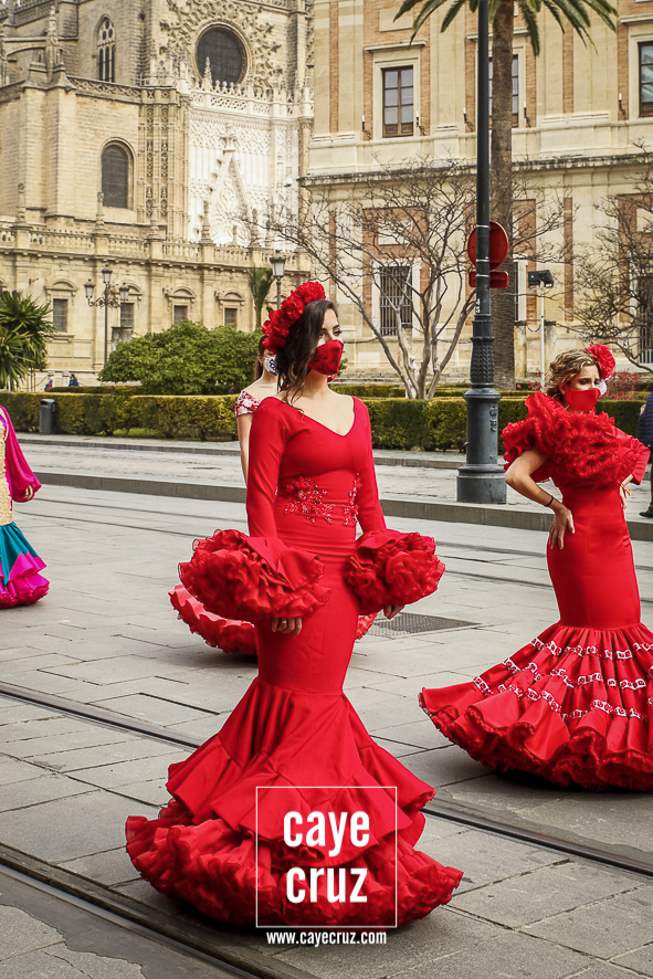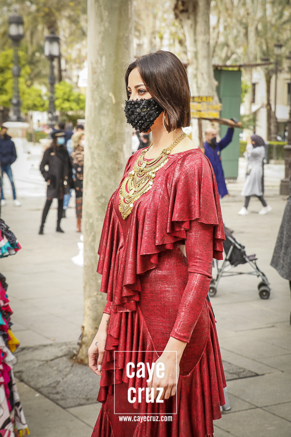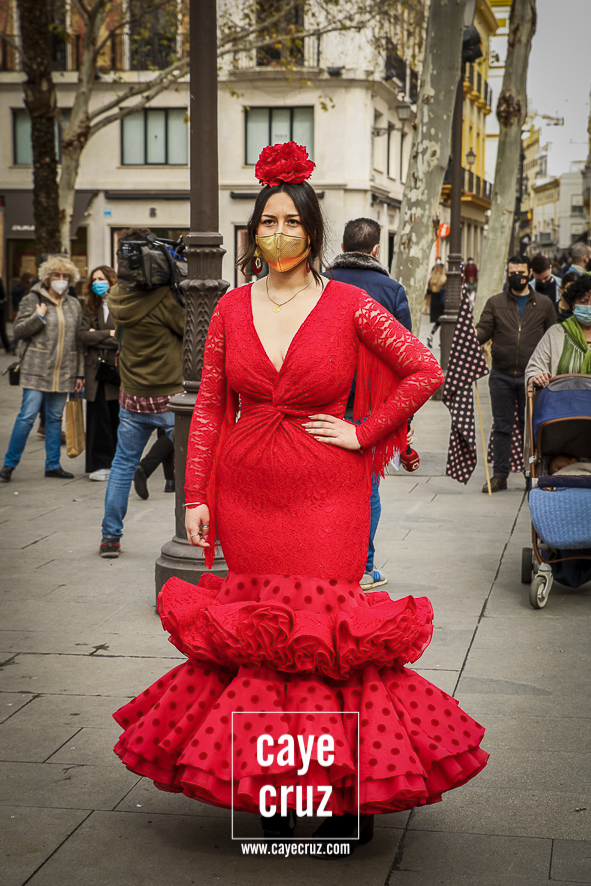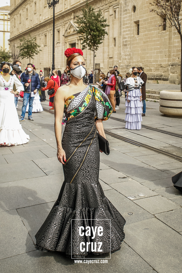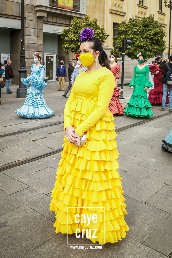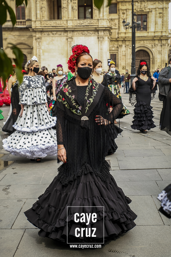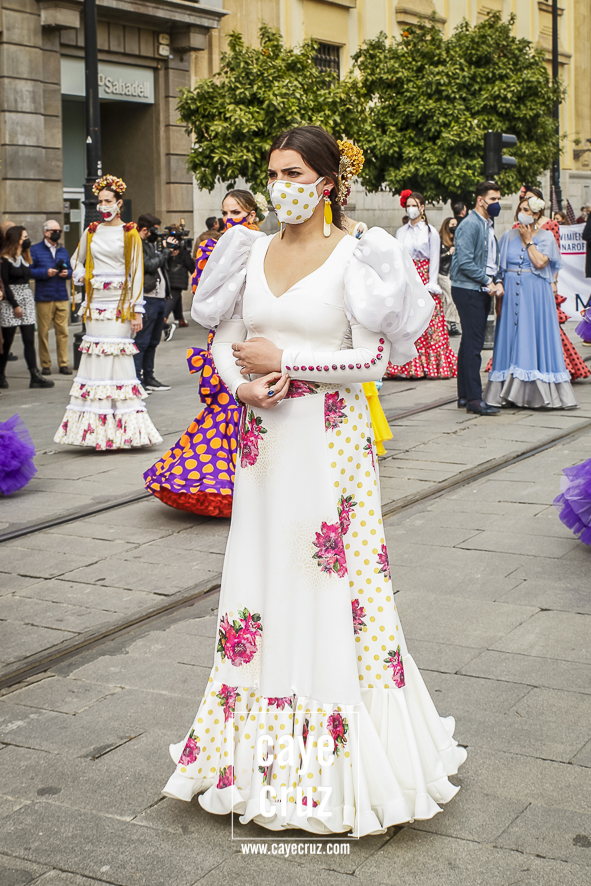 Castañuelas marcando el ritmo, decenas de curiosos y curiosas acercándose, flamencas de todo tipo, de cualquier parte de Andalucía y volantes de muchos colores que dejaron a un lado el luto del negro y pasaron a la reivindicación de un sector que ya no puede más: la moda flamenca salió de nuevo a la calle y, una vez más, demostró que el traje de flamenca, la flor en el pelo, el estilismo bien hecho o el costumbrismo que estamos «elevando» a días de celebrar nuestra autonomía, sigue siendo uno de nuestros mejores reclamos.