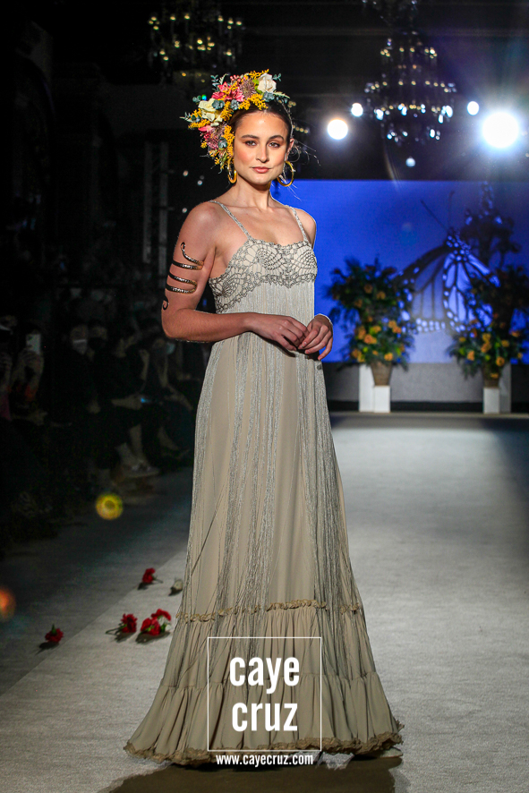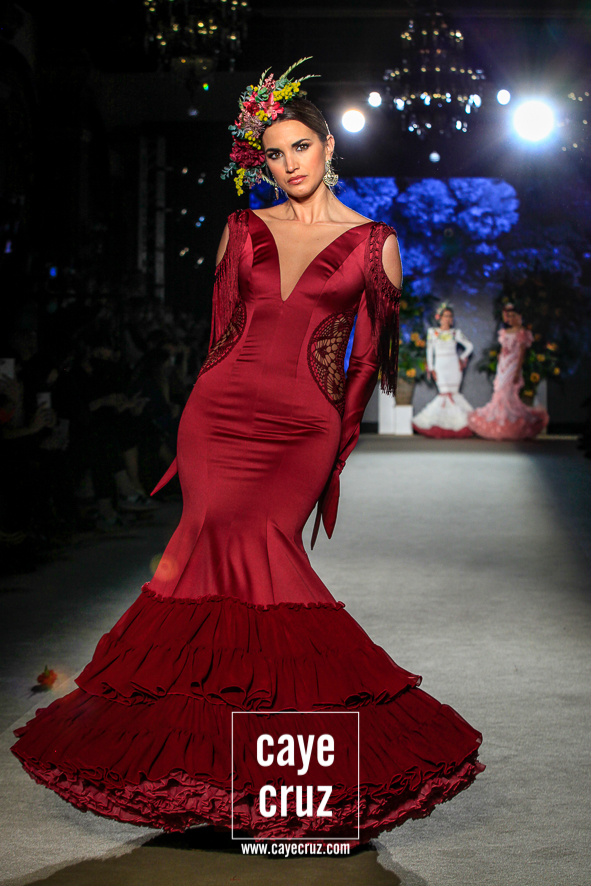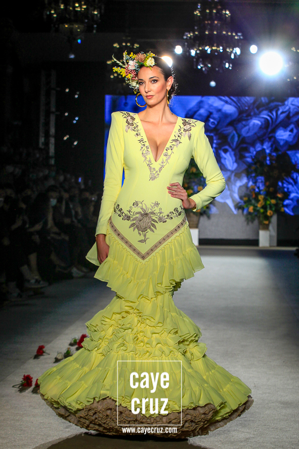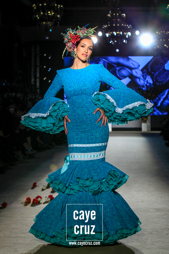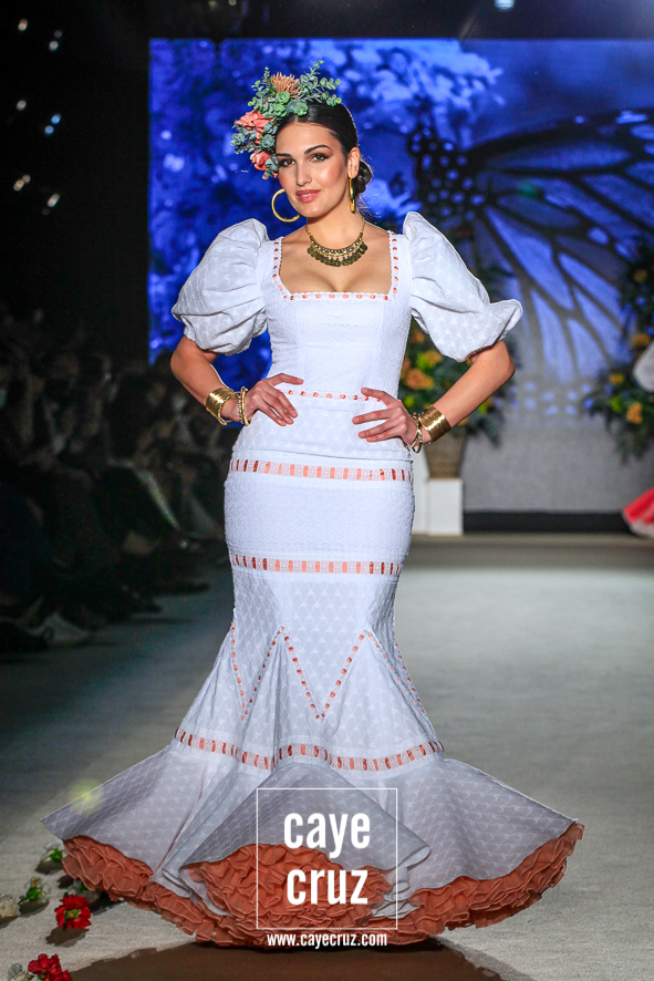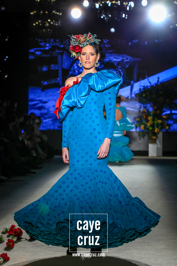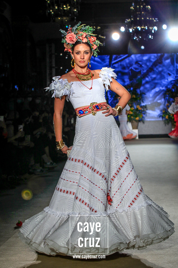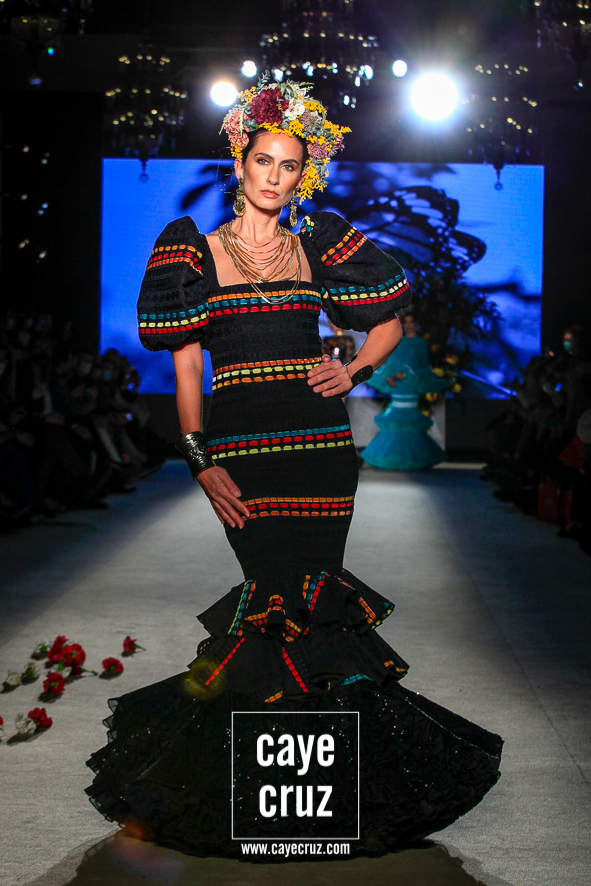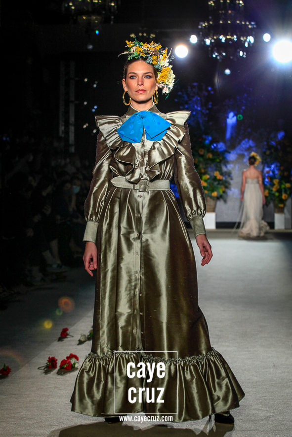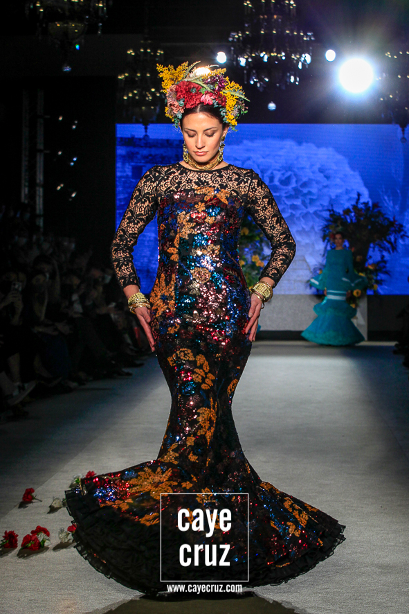 Color, bordado e inspiración Mexa. Daniel no ha viajado a Oaxaca y ni le falta que la hace, pero en su flamenca destacan varias cosas que también acompañan al folclore mexicano: los bordados florales que cuajan los cuerpos de varios diseños, las tiras y lazos en faldas o mangas, el blanco o el negro como el fondo donde se entrecruzan diferentes colores, el protagonismo de turquesas, amarillos y rosas, el uso del dorado en los complementos e incluso en algunos trajes o las grandes coronas de flores en el pelo. La unión saliente de este cuadro de inspiración nos lleva y ambienta hacia México, si bien cualquier purista de la figura de María Félix le pediría mucho más a la colección. No obstante, el cuidado que se le ha dado a toda la colección en su realización, el trabajo artesanal e impecable que ha hecho Robles y el resultado final tan visualmente atrayente compensa ese pequeño pero que se le podría poner a una de las indudables colecciones de la temporada.