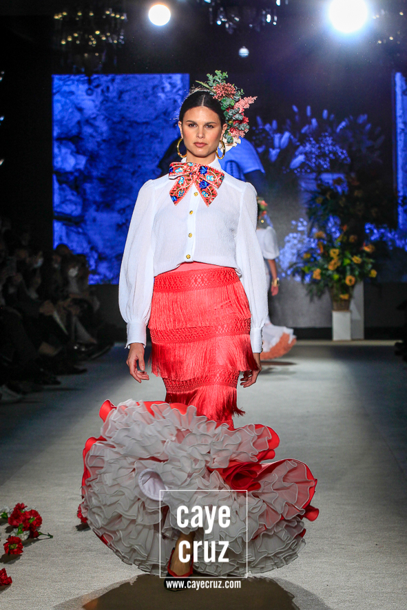 La colección «que habrías hecho de no haber pasado nada«. Es complicado afrontar un desfile completo y una nueva temporada comercial cuando la anterior apenas pudo desarrollarse. Muchos diseñadores han decidido no dar rodeos y presentar colecciones que evolucionan su concepto de 2020 o sencillamente muestran su perfil más reconocible. Dani Robles en ese sentido ha ido por libre. De hecho ‘María la Mexicana’ es una salida total de su zona de confort, con un desfile de apenas 15 trajes pero en el que todo está hilado, las ideas están muy claras, cada diseño tiene su peso o protagonismo y se nota que el sevillano le ha dado su tiempo a cada volante. Era algo que llevaba tiempo esperándose, porque desde que debutó como profesional, las colecciones de Robles se caracterizaban por mostrar un estilo propio de su autor pero siempre quedándose a medias y sin mostrar ese algo más, ese concepto redondeado que se le escapaba (aún dejando muy buenos trajes por el camino). ‘María la Mexicana’ es, a todas luces, esa gran colección que esperábamos de él y que alguna temporada sabíamos que iba a llegar. Sabemos que todos los años hay diseñadores que se salen del tiesto y en la flamenca post-pandemia ha sido Robles el que lo ha hecho.