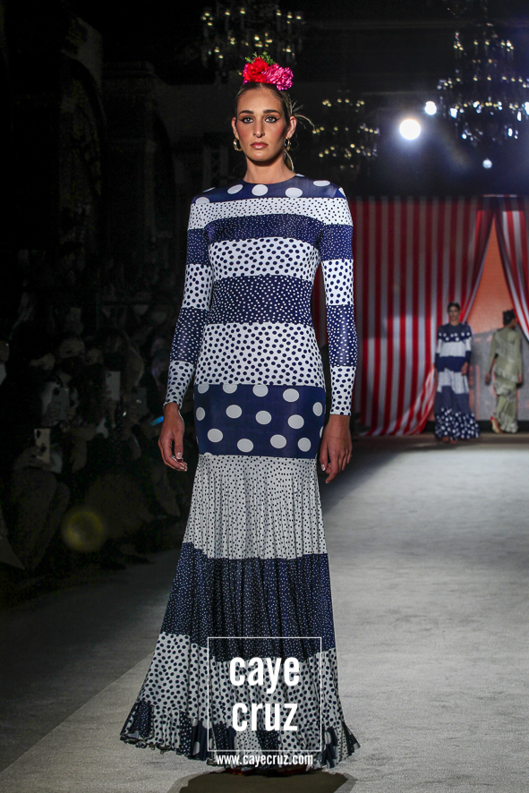 Flamenca Hidalgo en estado puro. Rojo, azules, blancos, negros o lunares sobre punto, flecos, patronaje con cortes geométricos, pequeños volantitos, cuerpos ceñidos y otras piezas más holgadas. El estilo propio del diseñador se cita de nuevo sobre la pasarela con trajes que forman parte de su ADN junto a algunas ideas, como el largo tobillero, los detalles de croché, las aplicaciones de coral, las lentejuelas o las rayas (sacadas literalmente de los toldos de casetas) dando el toque distintivo. De manera secundaria hay incluso algunos ecos a los años 50/60 en el uso mismo de los lunares, de los largos de las faldas, los cortes a la cintura o incluso algunos vestidos que podrían valer para un estilismo que homenajease a Twiggy.