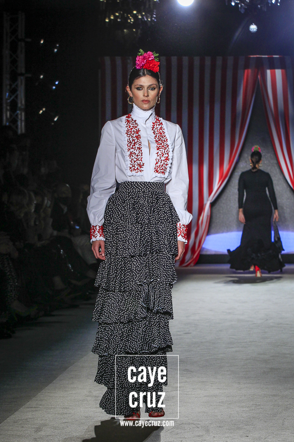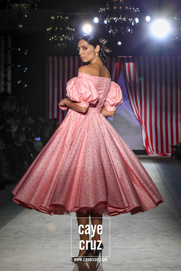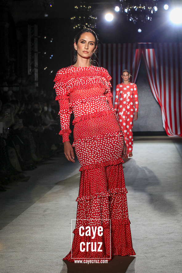Hidalgo tiene un plan anual. Desde hace algunas temporadas hay diseñadores que utilizan su desfile en una pasarela flamenca para mostrar el proyecto a nivel global de su firma no solo para la temporada de volantes, también para el año entero. Y lo hacen sin separar conceptos, más bien aprovechando la sinergia y sabiendo hacer moda que sea flamenca (o que no desentone en ese contexto): todo lo que ves en pasarela es el origen de lo que te van a vender. Eso parecen decirnos y casi sin olvidar el origen andaluz o del sur de esos diseños. José Hidalgo lo hace en Juerga ampliando su visión de la moda, apostando por aflamencar la fiesta, aportando ideas para ir al Real sin volantes y vistiendo de lunares algunos bocetos que lo mismo te valen para una tarde de casetas como para otra ocasión especial.