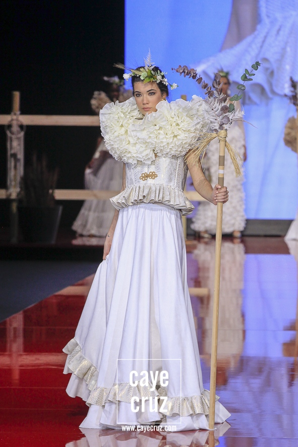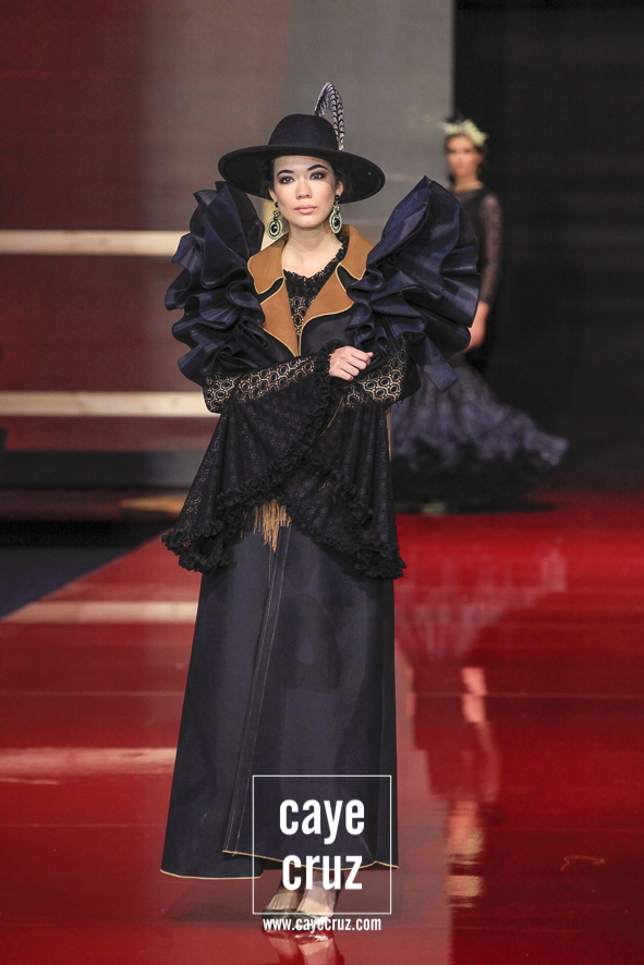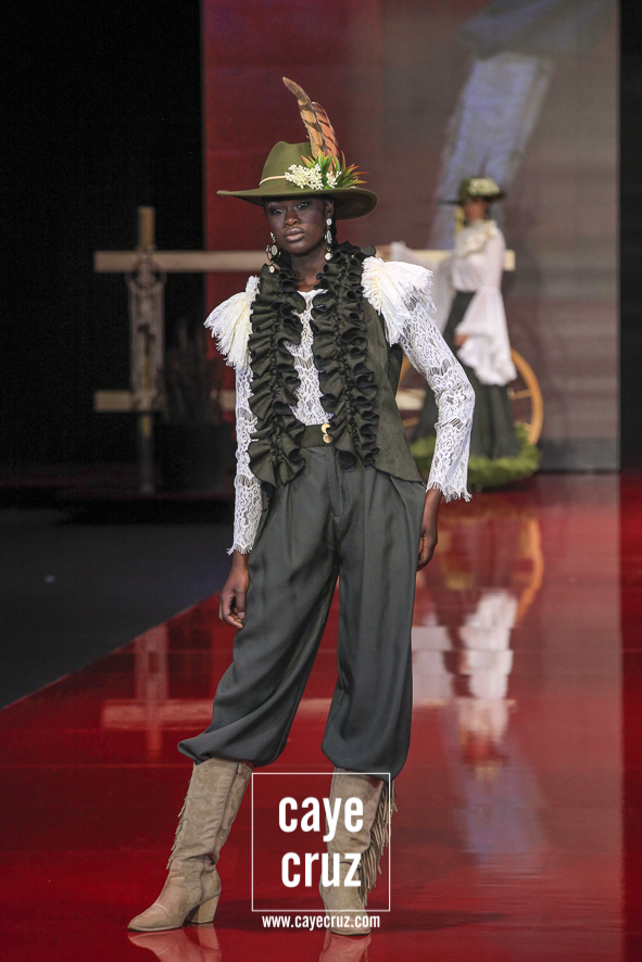 Diseño y estilismo completo para ir de la pasarela al albero/arena. Lo primero que llama la atención de Legendarias es como se equilibra el concepto de espectacularidad en pasarela con la usabilidad de todo lo que desfila para llevarlo luego a una romería o una feria. Todo, con muy pocas excepciones, es un ready-to-wear: los sombreros, los tocados, los abrigos, chaquetas, vestidos, trajes, pantalones… Flor de Cerezo se presenta en SIMOF con un concepto global donde se parece querer vender un traje pero lo que hace es vestirte de pies a cabeza ya que, vistos en su conjunto, estos estilismos se han entendido como un todo donde no sería tan fácil incluir ideas externas.