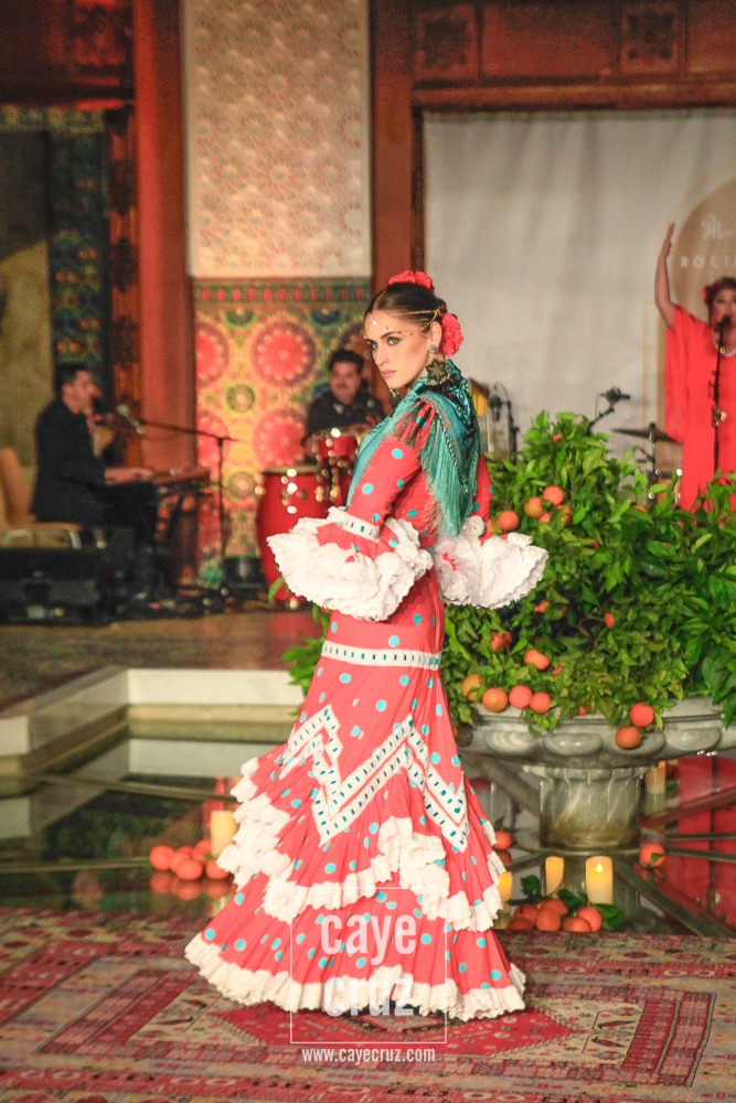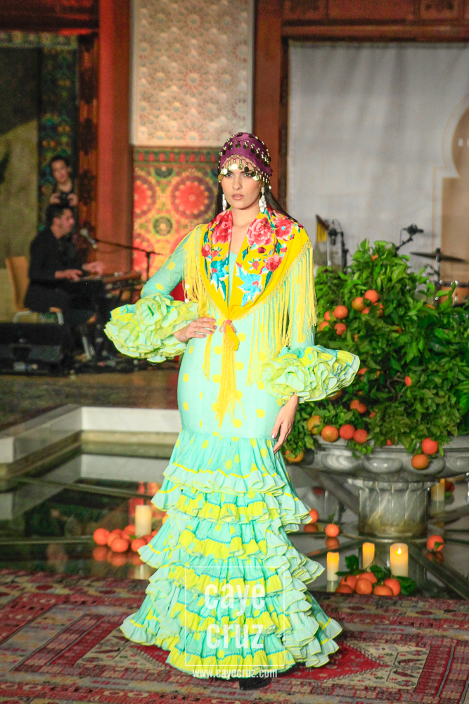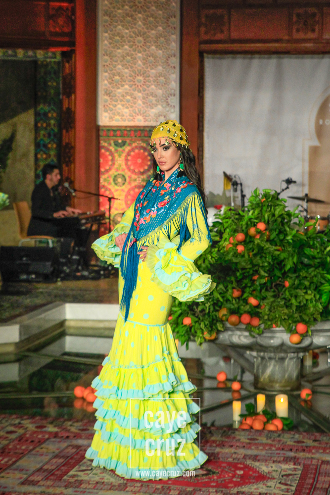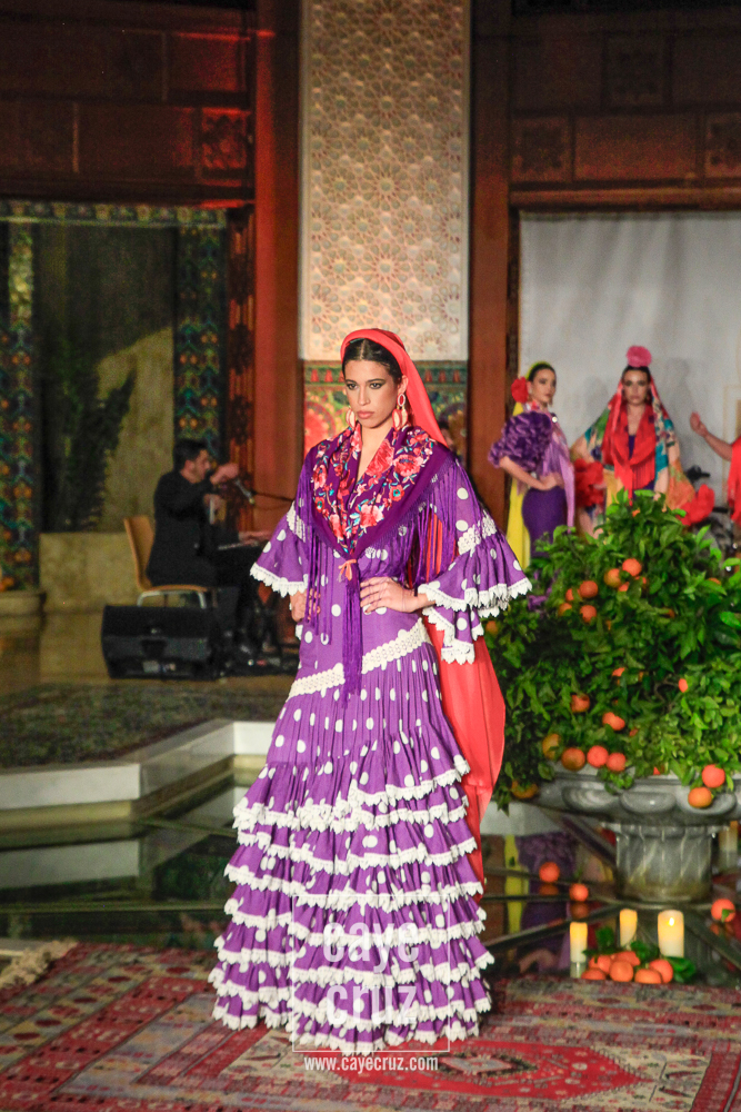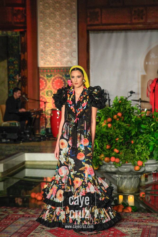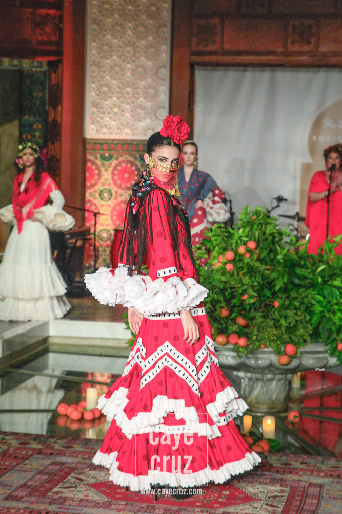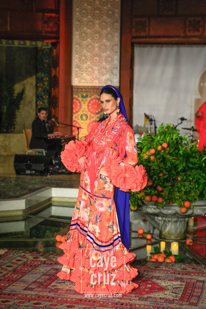 En un 2026 en el que la flamenca busca lo tradicional (y no precisamente por carencia económica), el viaje nos lleva cerca, a un Al Andalus con la caracterización o el estilismo muy en su sitio, al igual que la localización, la sede de la Fundación Tres Culturas. Por allí pasaron 40 modelos (literalmente, fueron 40 trajes sin que ninguna de ellas repitiese salida) con las que se sacó partido al espacio, creando un recorrido propio de desfile de tiempos pasados (es decir, sin pasarela) y una coreografía que, todo hay que decirlo, se desarrolló sin apenas fallos del directo.