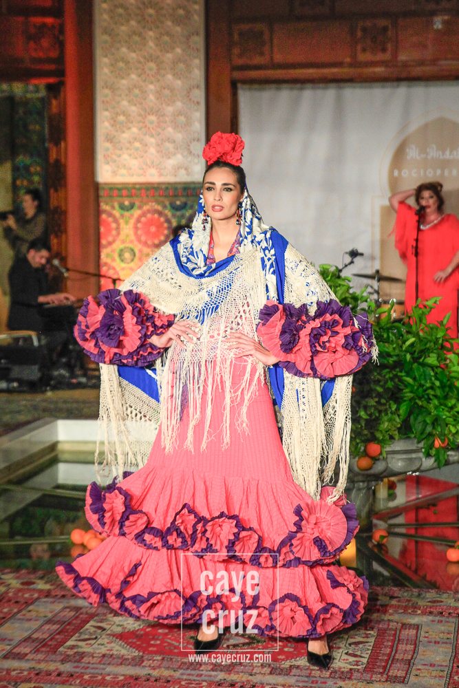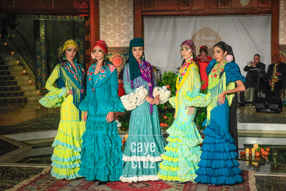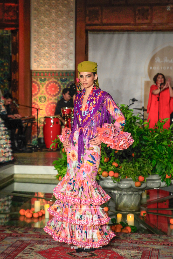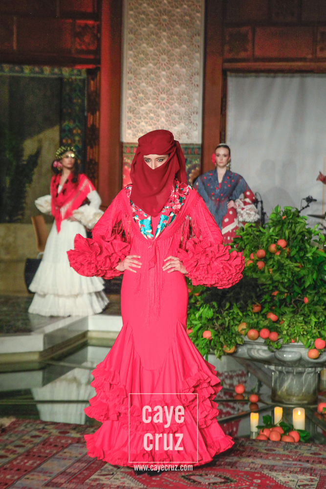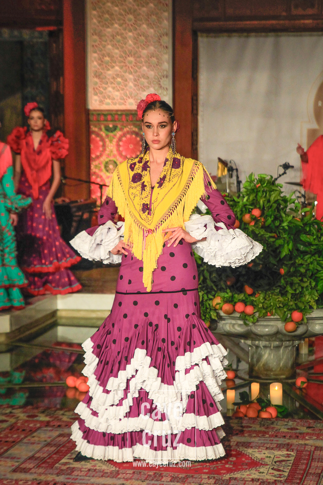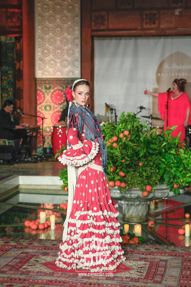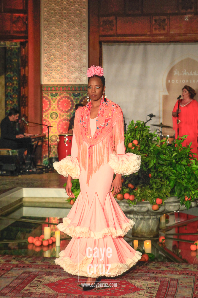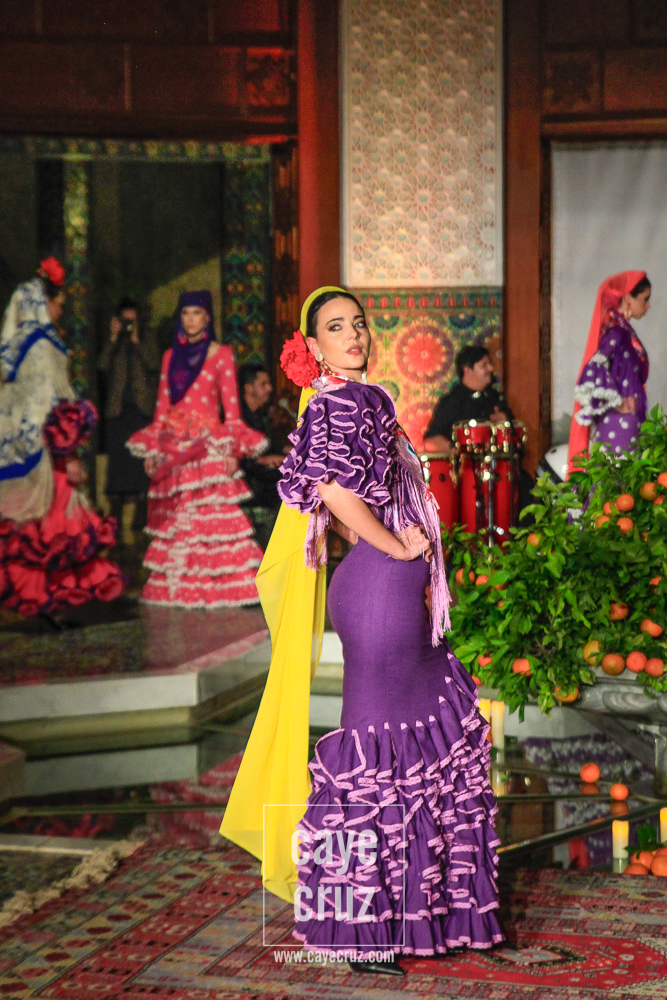 En un 2026 en el que la flamenca busca lo tradicional (y no precisamente por carencia económica), el viaje nos lleva cerca, a un Al Andalus con la caracterización o el estilismo muy en su sitio, al igual que la localización, la sede de la Fundación Tres Culturas. Por allí pasaron 40 modelos (literalmente, fueron 40 trajes sin que ninguna de ellas repitiese salida) con las que se sacó partido al espacio, creando un recorrido propio de desfile de tiempos pasados (es decir, sin pasarela) y una coreografía que, todo hay que decirlo, se desarrolló sin apenas fallos del directo.