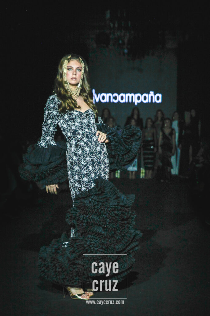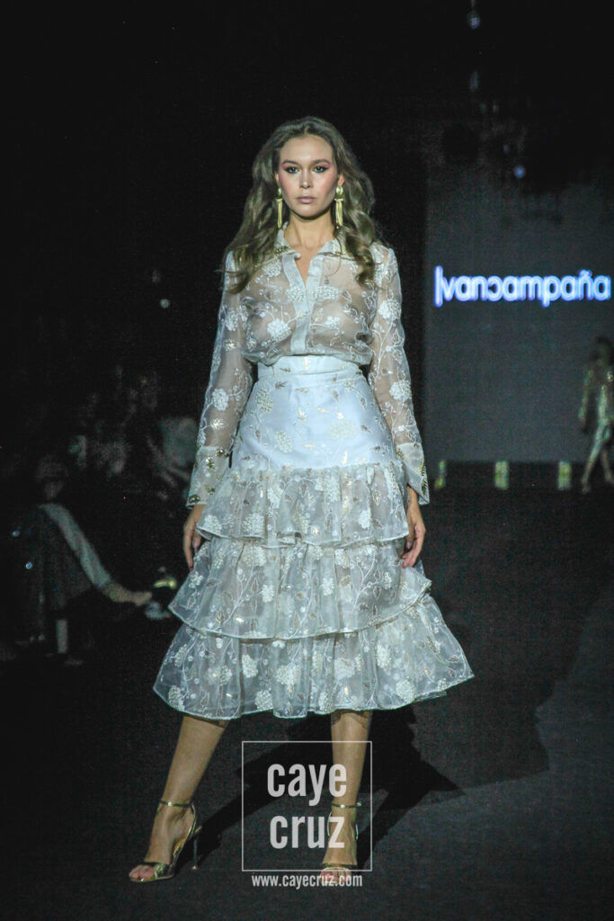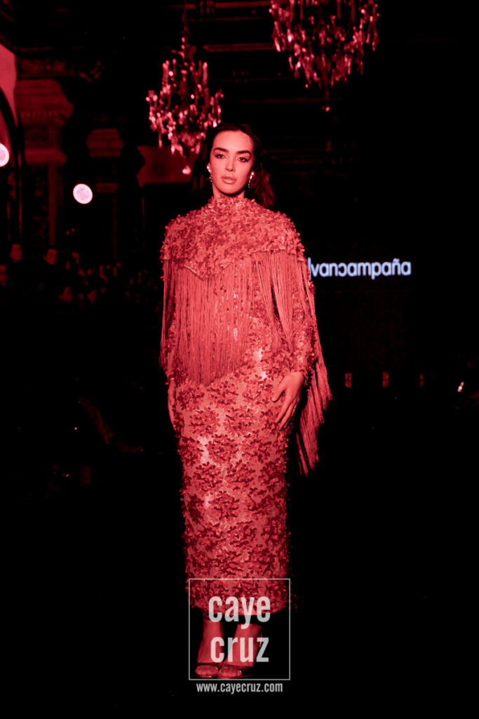 Iván Campaña, ‘Oasis’. Superada y asimilada su llegada a We Love Flamenco, Iván Campaña continua su andadura en la pasarela con su nueva colección de fiesta con un filtro quizás no muy flamenco, pero con sitios para concesiones, ¿O no es acaso la Feria una fiesta en la que gusta de ir bien arregladas? Bajo esa premisa no solo la parte en rojo se acomoda a lo que pide el albero, también los negros del final o los champagne, dorados y naranjas del comienzo. Una pasarela donde el brillo y la feminidad pisaban fuertes para guiarnos hacia un final que fue un acto de reverencia a la propia pasarela y al sector: cerró con un traje de flamenca.