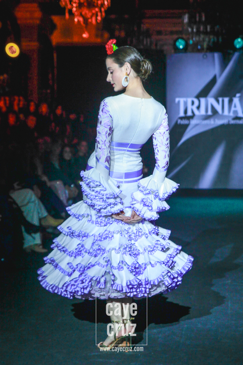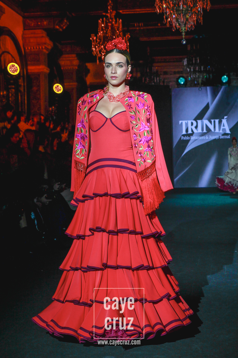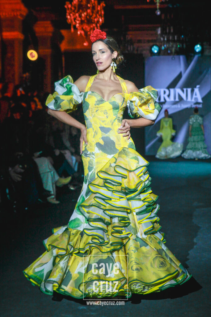 Pablo Retamero y Juanjo Bernal, ‘Triniá’. Si la cosa en 2026 iba de tirar hacia lo tradicional, hacer una colección en la que das tu versión de lo sevillano era una vía más que obvia, máxime cuando la amplia mayoría de diseñadores lo han hecho alguna vez. La Sevilla de Retamero y Bernal se viste de los colores clásicos de la flamenca: rojo, blanco y negro, junto a lo primaveral de amarillo y verde (el albero aquí se sustituye por marrón o camel) así como el aire sacro de la gama de morados. Todo en su sitio y en una propuesta estructurada en grupos cerrados (un básico de los desfiles de este dúo) en el que dentro de cada uno había espacio para flamenca tradicional y otra más a la moda, con trajes clásicos junto a escotes pronunciados (qué bien le sienta un halter a la flamenca Cloé), cuerpos entallados o volantes altos. Un ramillete de contrastes en el patronaje perfectamente orquestado, que permite visualizar como un mismo estilo sirve para vestir a cualquier flamenca y en el que los diseños de los bordados se robaban la atención en no pocos trajes. Y un apunte: como ejemplo casi de enciclopedia de cuál es la flamenca actual esta Triniá es más que perfecta.