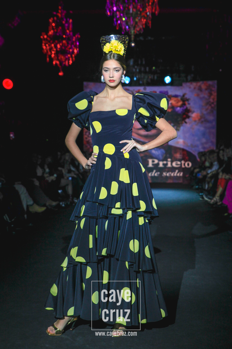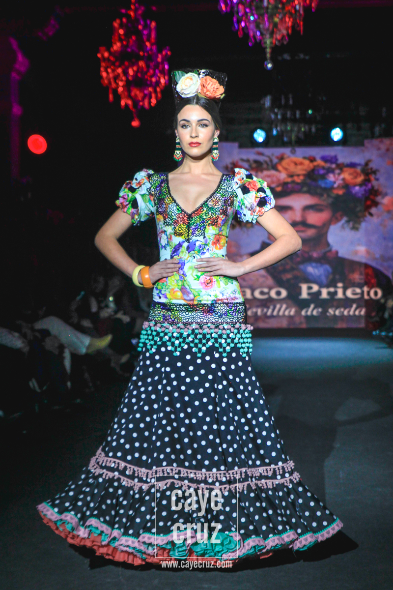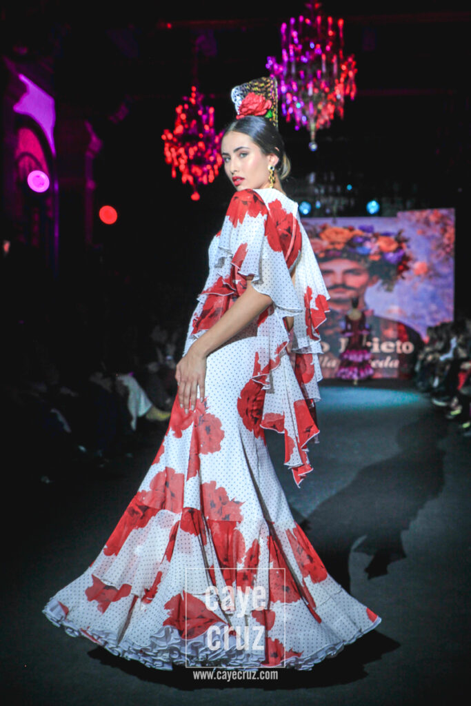 Paco Prieto, ‘Sevilla de Seda’. Una neja enteriza, un escote cuadrado, un cuello a la caja, una peina y una gran profusión de estampados o lunares que no se repiten en ningún traje. Haciendo siempre reconocible su flamenca y su gusto porque se luzca el cromatismo de los tejidos, Paco Prieto nos presentó a mujer colorista, primaveral y fiel a un estilo regio y elegante, con empaque. Como suele ocurrir en firmas como esta la clave de cada año suele estar en las telas escogidas y hemos de decir que en este 2026 las flores, como veis sobre estas líneas, captaron casi toda la atención del desfile.