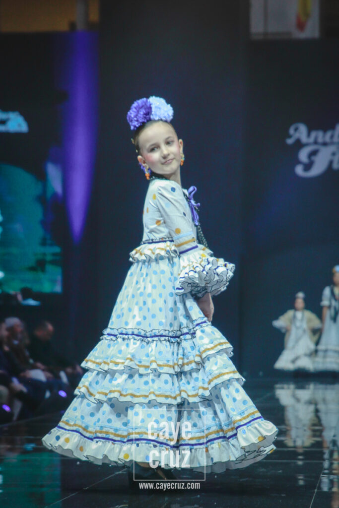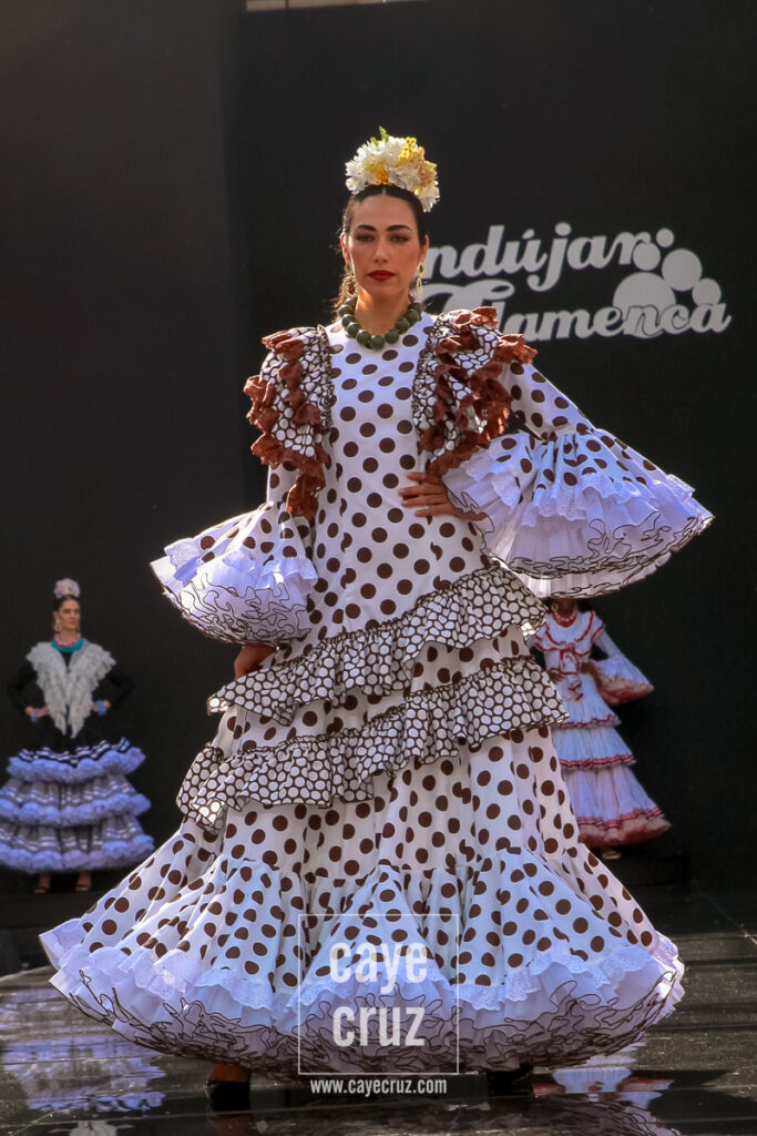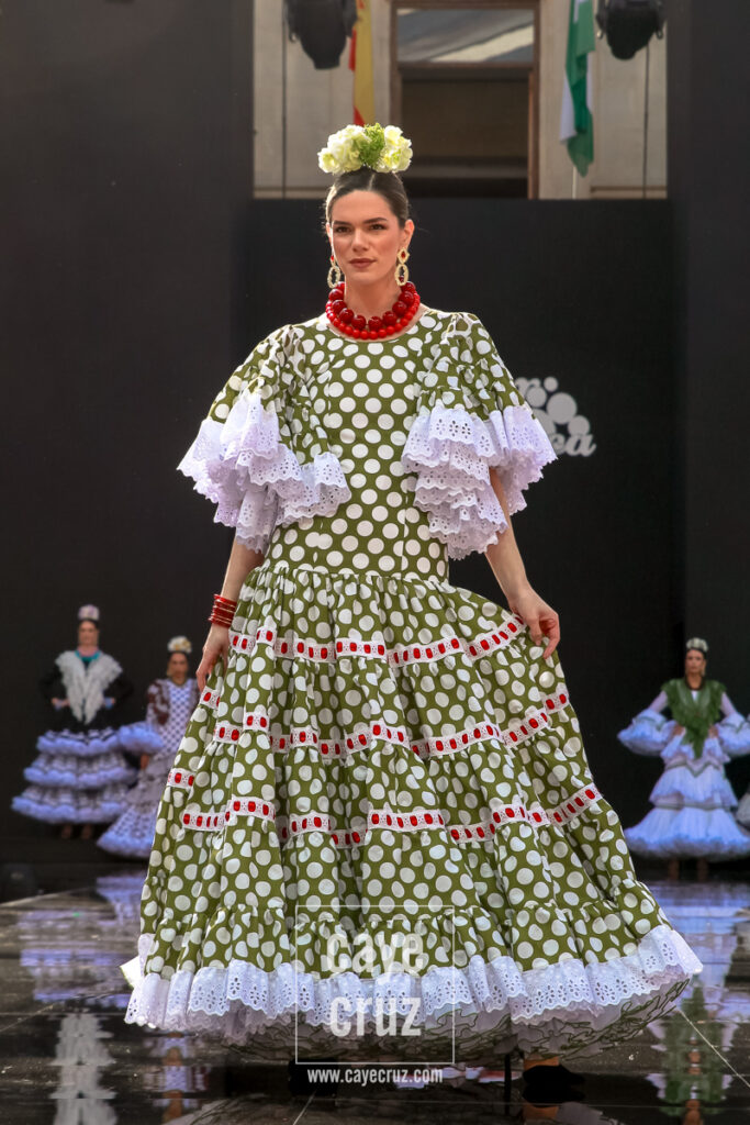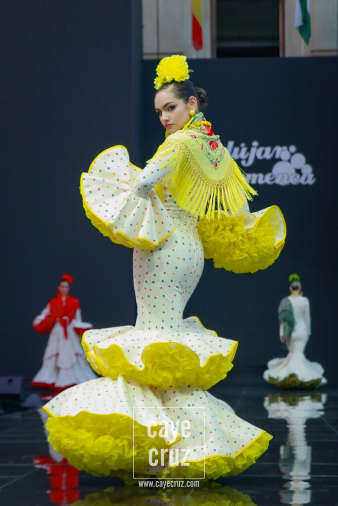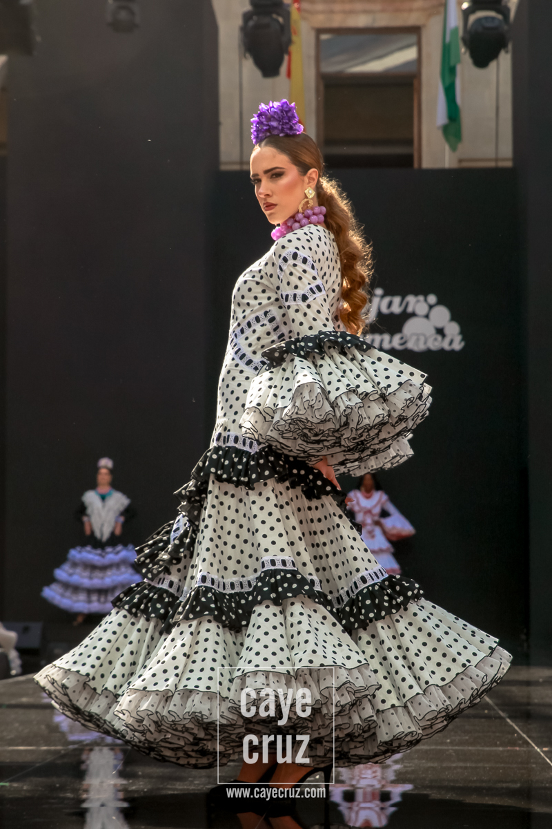 Pedro López, ‘Raigales‘. Una pregunta que me ha surgido con varias de las colecciones que repasamos en este post es la de: ¿Hasta qué punto se ha hecho esto de manera intencional? Pedro López no es oriundo de Andújar, es más su colección estaba pensada para verse en más de una pasarela y darle a conocer. Ahora bien, pocas veces el premio de ‘Muévete Flamenca’ ha sido tan propio y contextualizado pues esta propuesta de flamencas de sabor añejo, colores campestres y maximalismo en volantes se antoja perfecta para las estampas que nos regala el Cerro del Cabezo a final de Abril. Todo ello en ocho trajes ideados con mucho gusto, acierto en la combinación de lunares y detalles que tienen un pie en el costumbrismo de los años 90 y ese «mírame, aquí estoy yo» de la flamenca actual. Un buen ganador de noveles que sabe dibujarse y tiene aquí una línea por la que seguir.