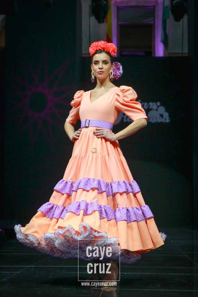 Lorena Rodríguez, ‘Algarabía‘. No sale de Andújar ni falta que le hace: Rodríguez se ha decantado por ser profeta de su tierra y centrar su colección o su visión de los volantes en la flamenca local. Así su estilo va de la mano con sus tradiciones y ello nos lleva a una colección que recopila, pone en orden y acentúa todas las marcas que Lorena ha querido ir dejando año tras año en sus diseños. Diría incluso que este desfile asienta a las claras su personalidad: lunares multicolor, grandes faldas abiertas desde la cintura, juegos de volantes, mangas protagonistas, el escote cuadrado, esa presencia de blancos, rosas, naranjas o el espectro de los morados-violeta componen unos trajes que piden tanto calle como romería.