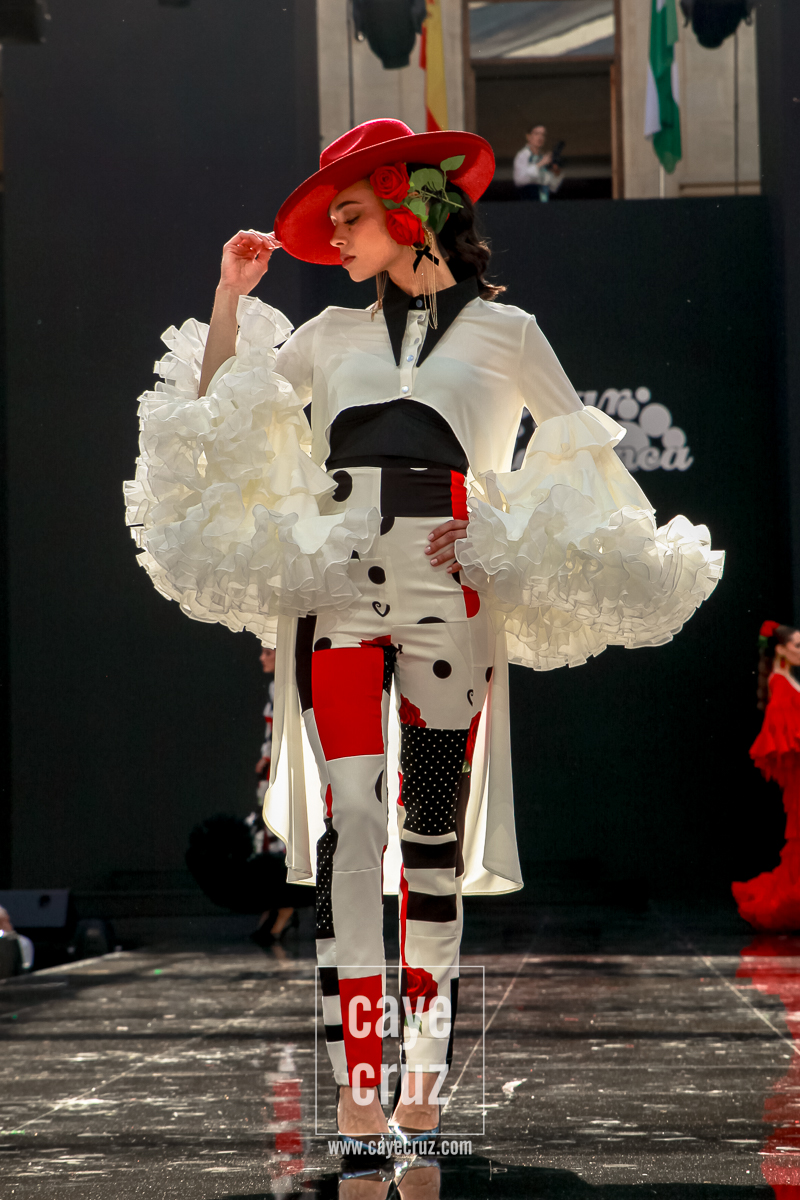 Flor de Cerezo, ‘Enfolliná’. Tres conclusiones claras se pueden sacar viendo este desfile. Lo primero es que la mejor Flor de Cerezo es la que piensa en romerías: ese comienzo de cuadros de vichy, volúmenes y cortes maxi se quedaba corto y reclamaba mucha más presencia (más siendo la de Andújar una pasarela-antesala de Romería). Lo segundo es que Verónica Cerezo a título personal ha hecho una propuesta donde la vemos como persona, pues todos los diseños en rojo, blanco y negro (salpicados de rosas rojas) no dejan de ser una traslación de estilismos que podríamos haberlos visto en ella misma. Hay una comodidad (a pesar del nombre de la colección) que denota la confianza en una colección que sabe fusionar flamenca, flamenco y moda casual. Lo tercero (y esto ya es cosecha propia): qué bien le sentarían a esas blusas, chaquetas, pantalones o trajes un buen paseíto por las tascas de calle Cerón en San Lucas. Con sus cositas (repito: el comienzo daba para más) y siendo menos rimbombante que sus predecesoras, puede ser la mejor Flor de Cerezo desde ‘Legendarias’.